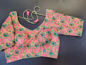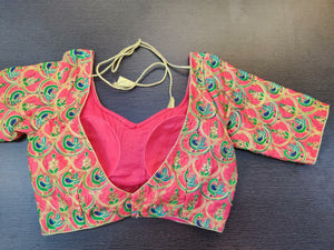 Gorgeous pink designer saree blouse with peacock embroidery. Shop designer saree blouse online in USA from Pure Elegance.