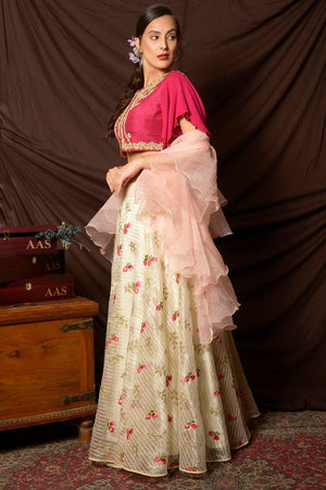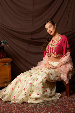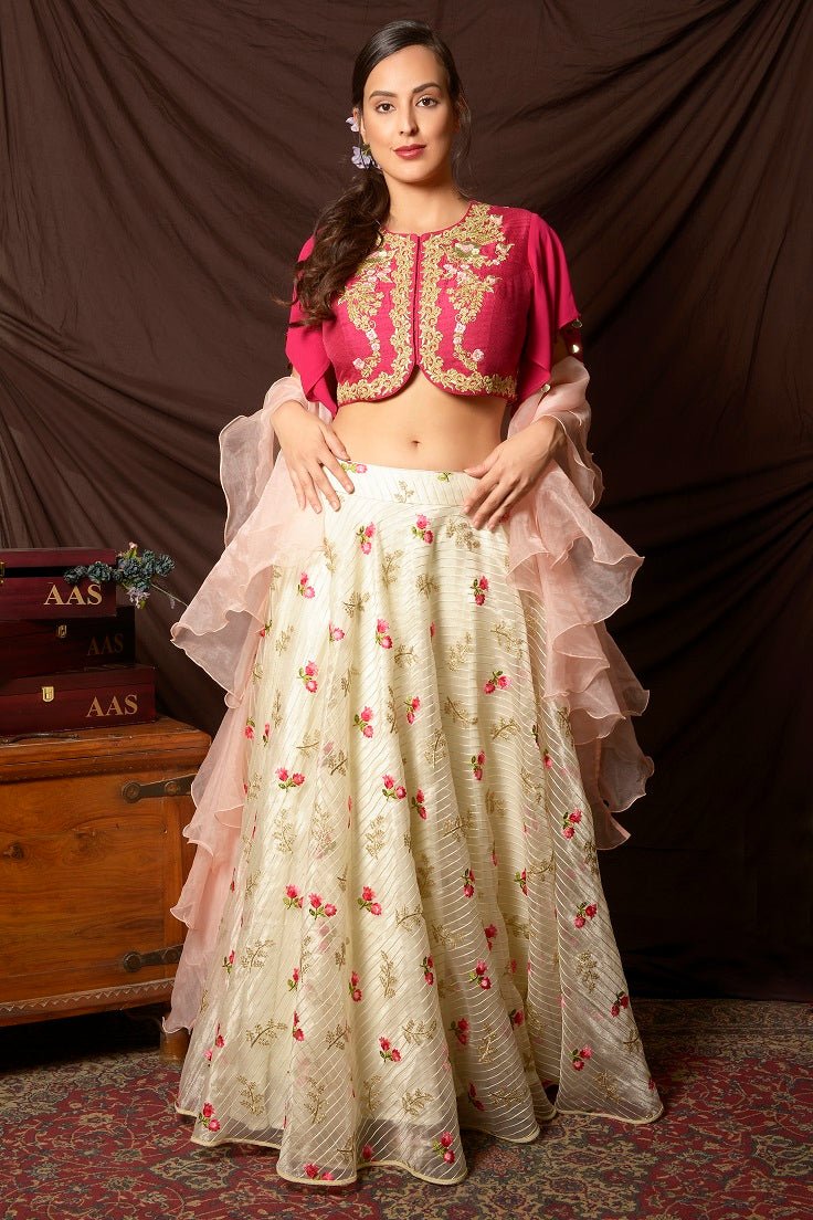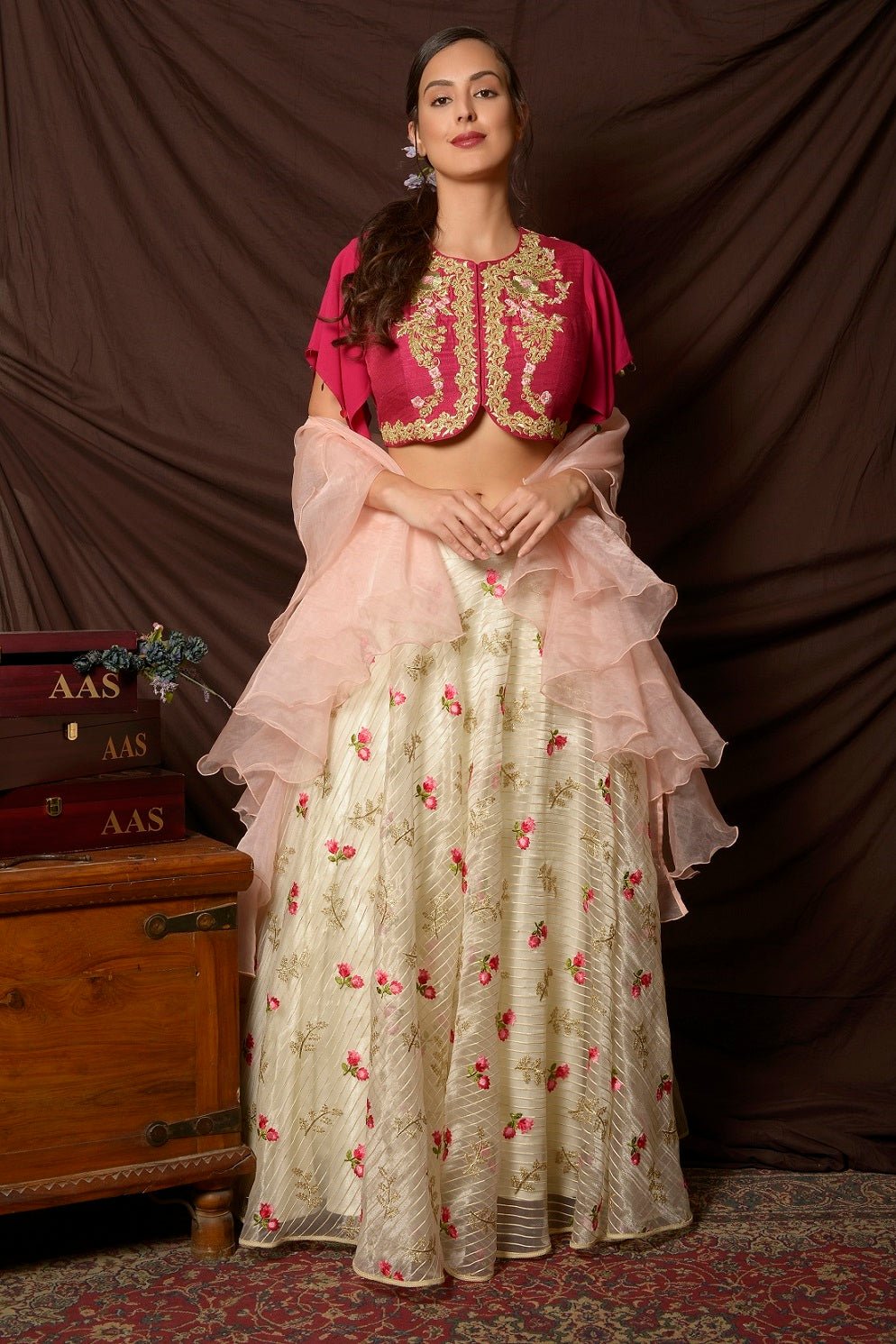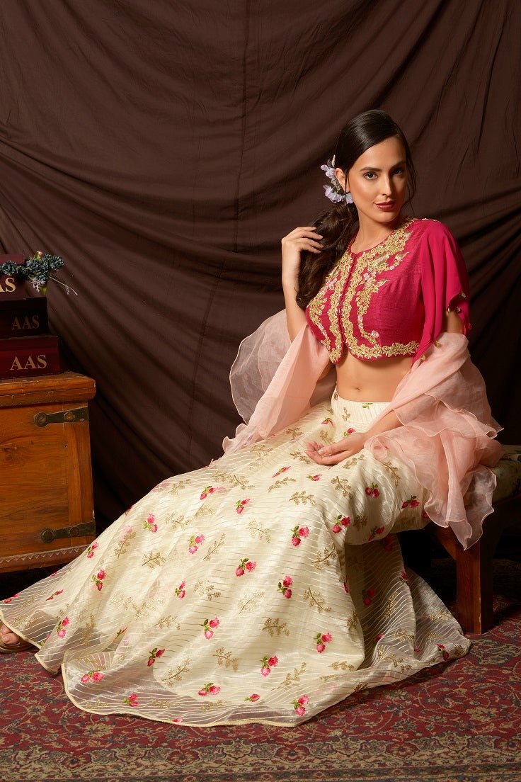Stunning pink peplum cape embroidered organza lehenga set! Shop designer Indian lehengas in USA from Pure Elegance.