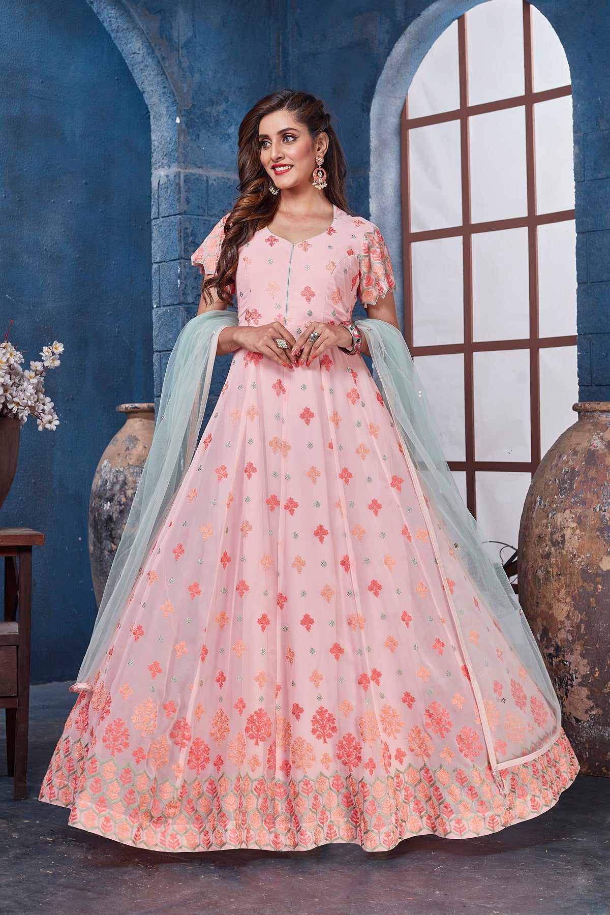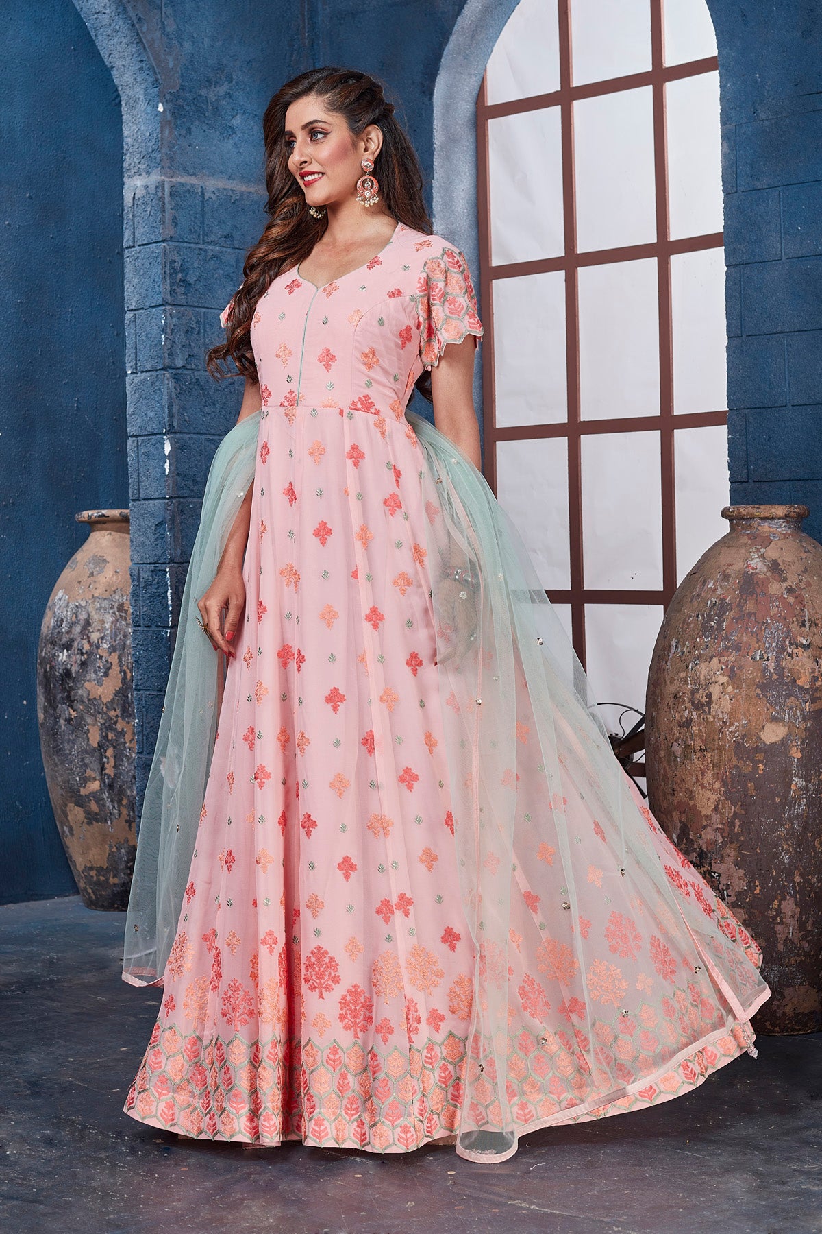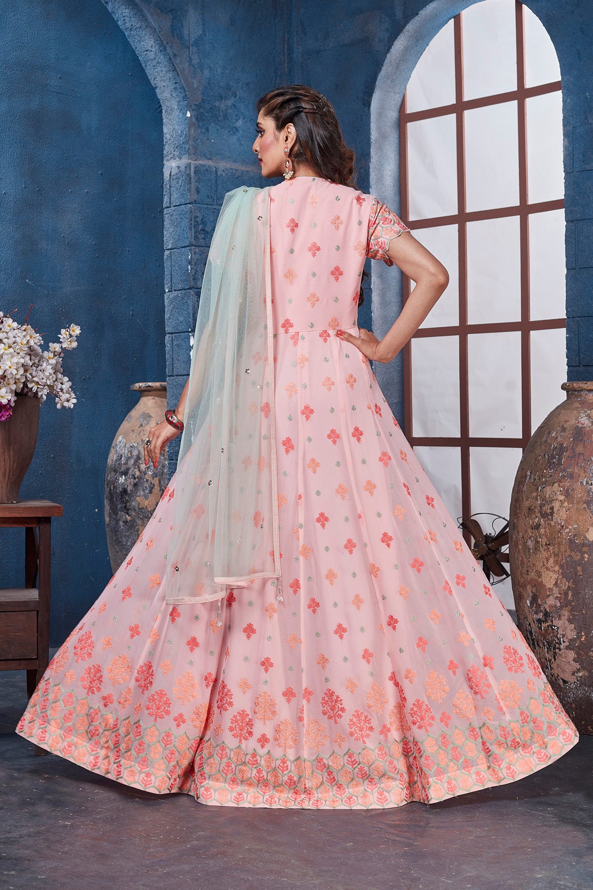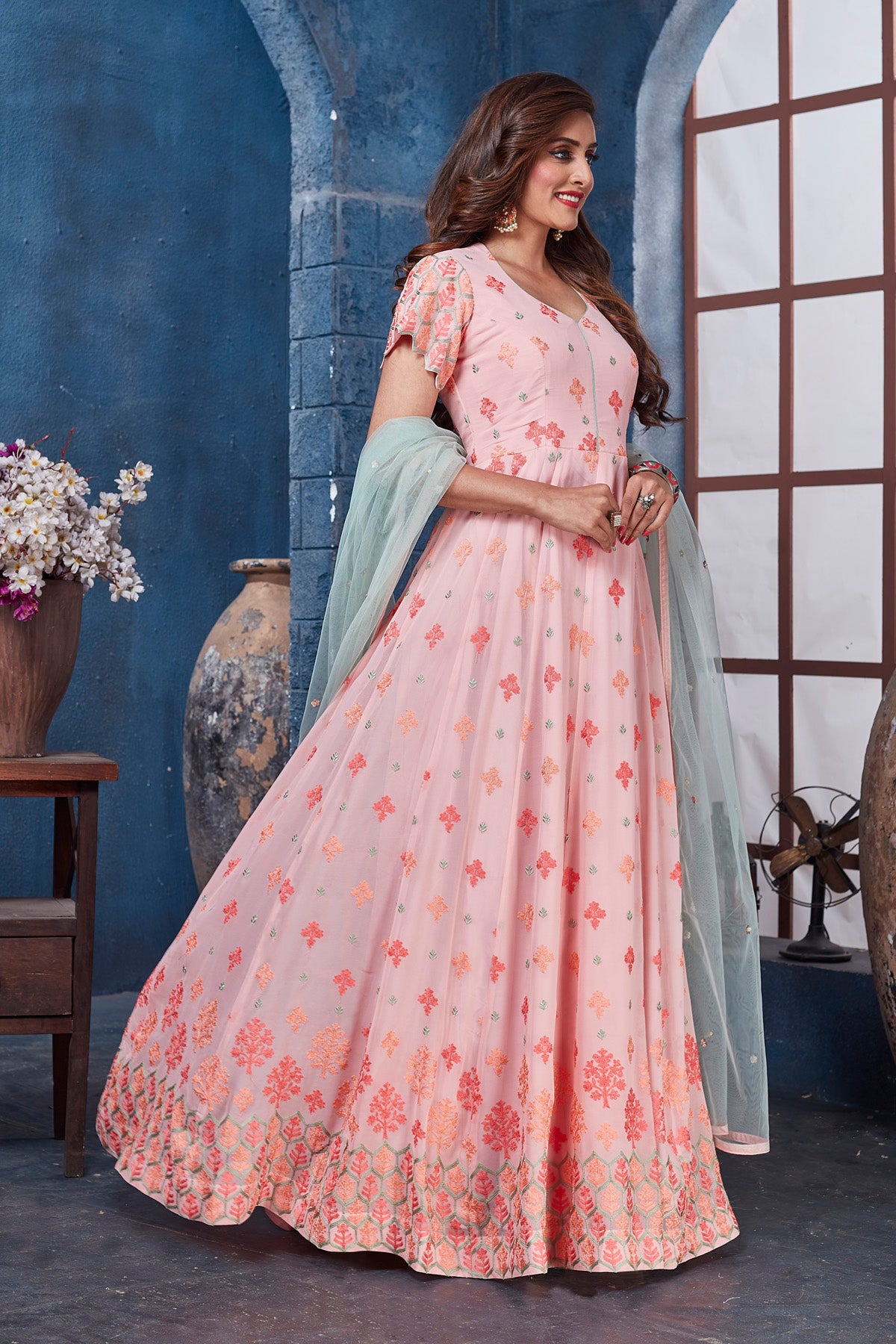 300544 Powder Pink Embroidered Floorlength Anarkali with Dupatta