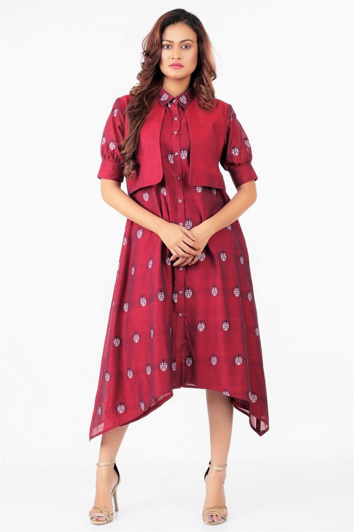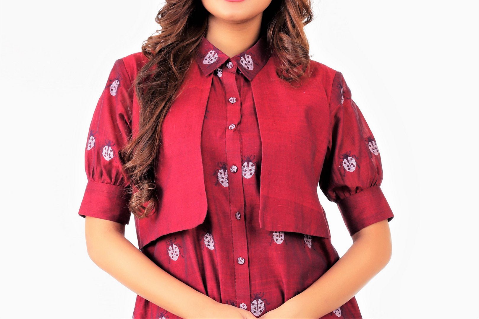 Captivating red color Jamdani silk shirt dress with woven lady bug motifs by Sayantan Sarkar. The dress has front buttons with jacket look. Shop online from Pure Elegance or visit our store in USA.
