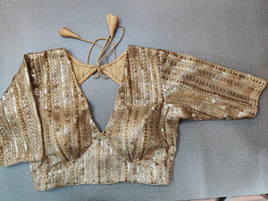 Beautiful solid golden readymade saree blouse with sequin work. Buy designer blouse in USA from Pure Elegance.