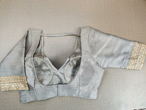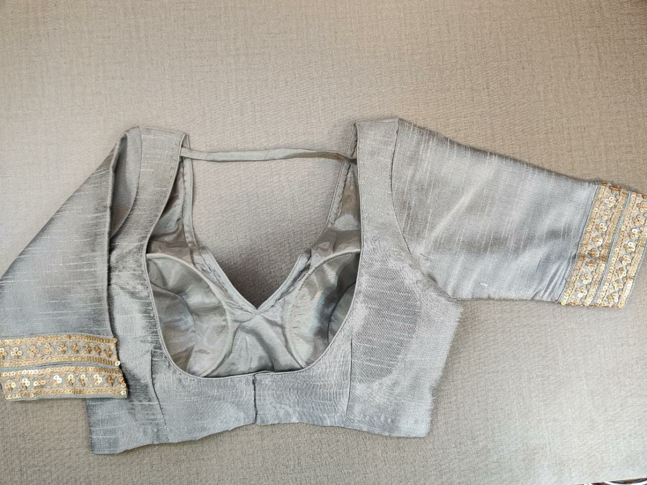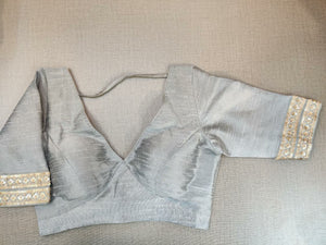 Beautiful steel grey embroidered sari blouse. Buy designer blouse in USA from Pure Elegance.