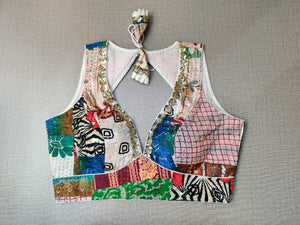 Pair your sarees with this stunning multicolor patch designer sari blouse for a perfect ethnic look. The blouse is enhanced with Kantha stitch and sequin embroidery. Buy designer blouse in USA from Pure Elegance..