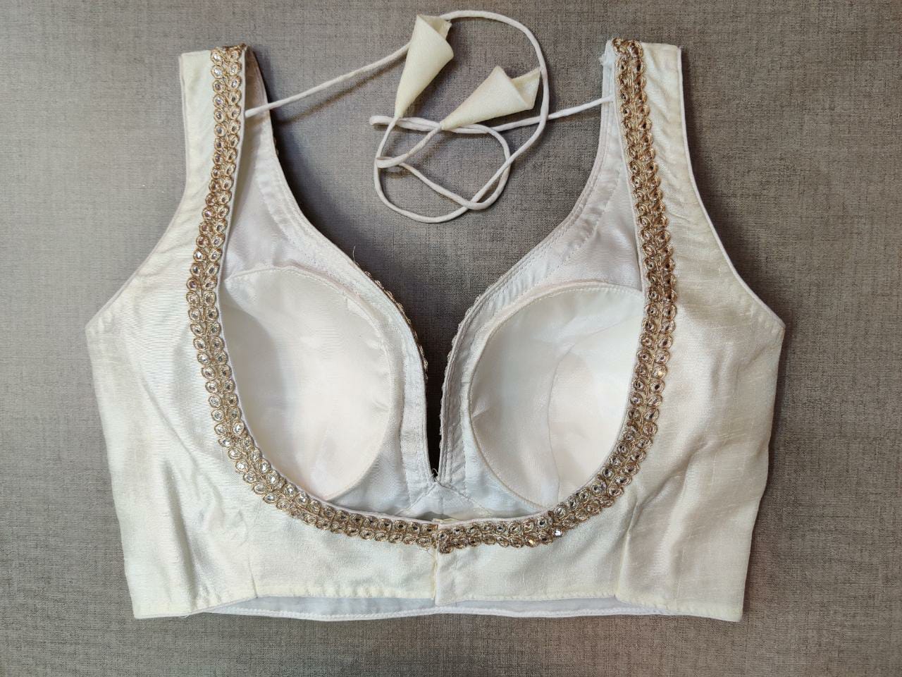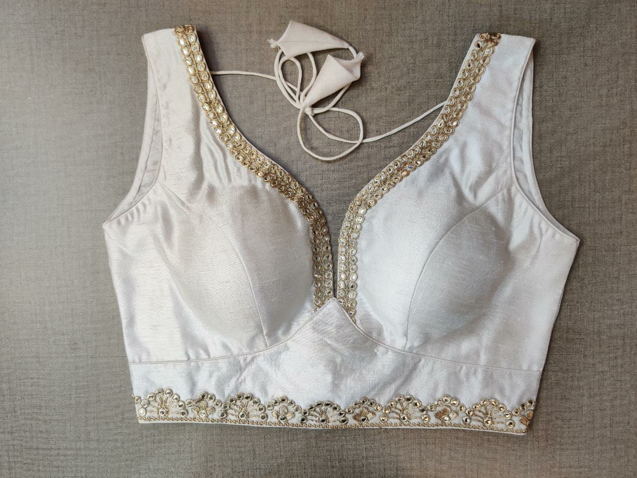 Beautiful white sleeveless saree blouse with silver embroidery lace. Buy designer blouse in USA from Pure Elegance.