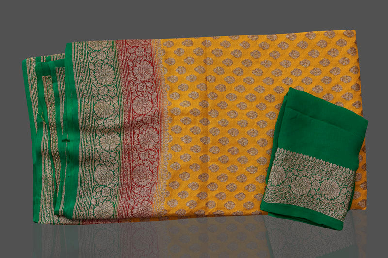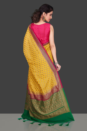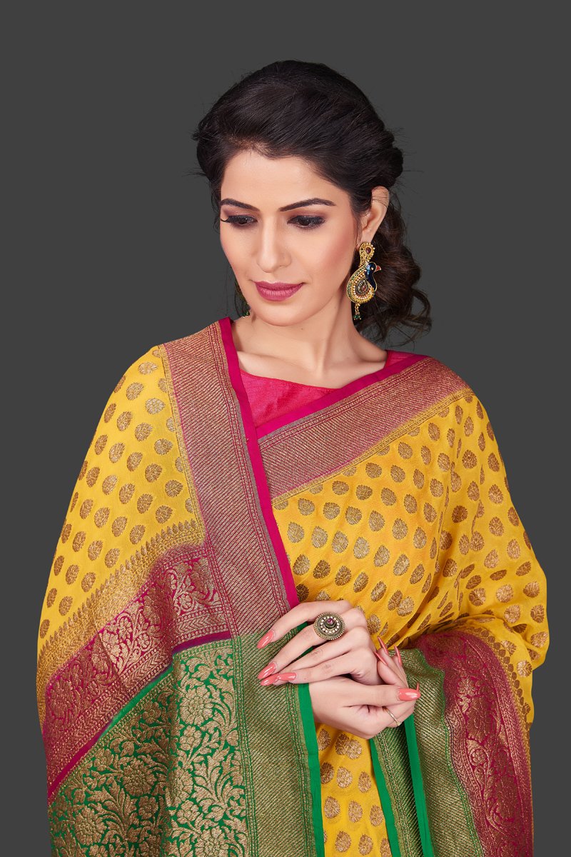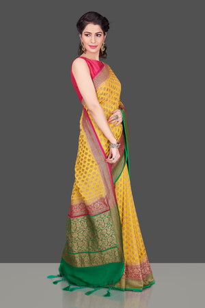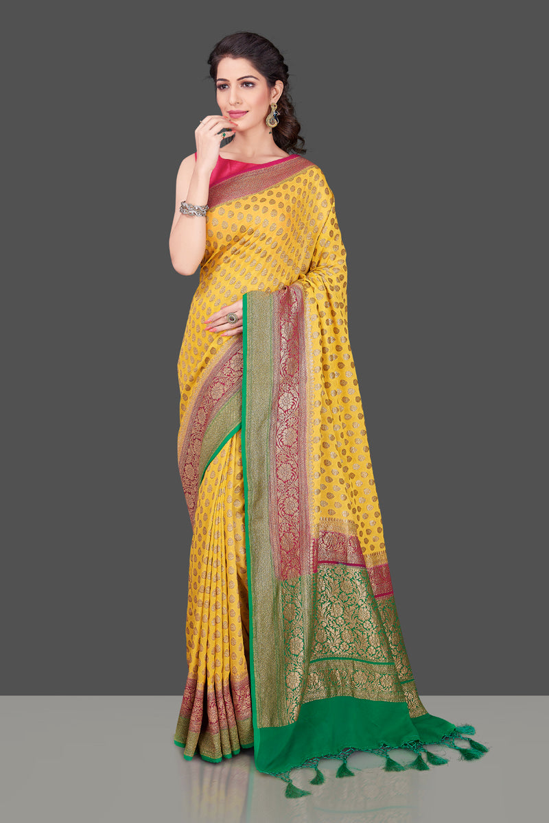 Yellow georgette Benarasi sari for weddings and festive occasions! The saree has a beautiful pink and green antique zari border and pallu. It comes with a matching blouse piece. Buy online from Pure Elegance.