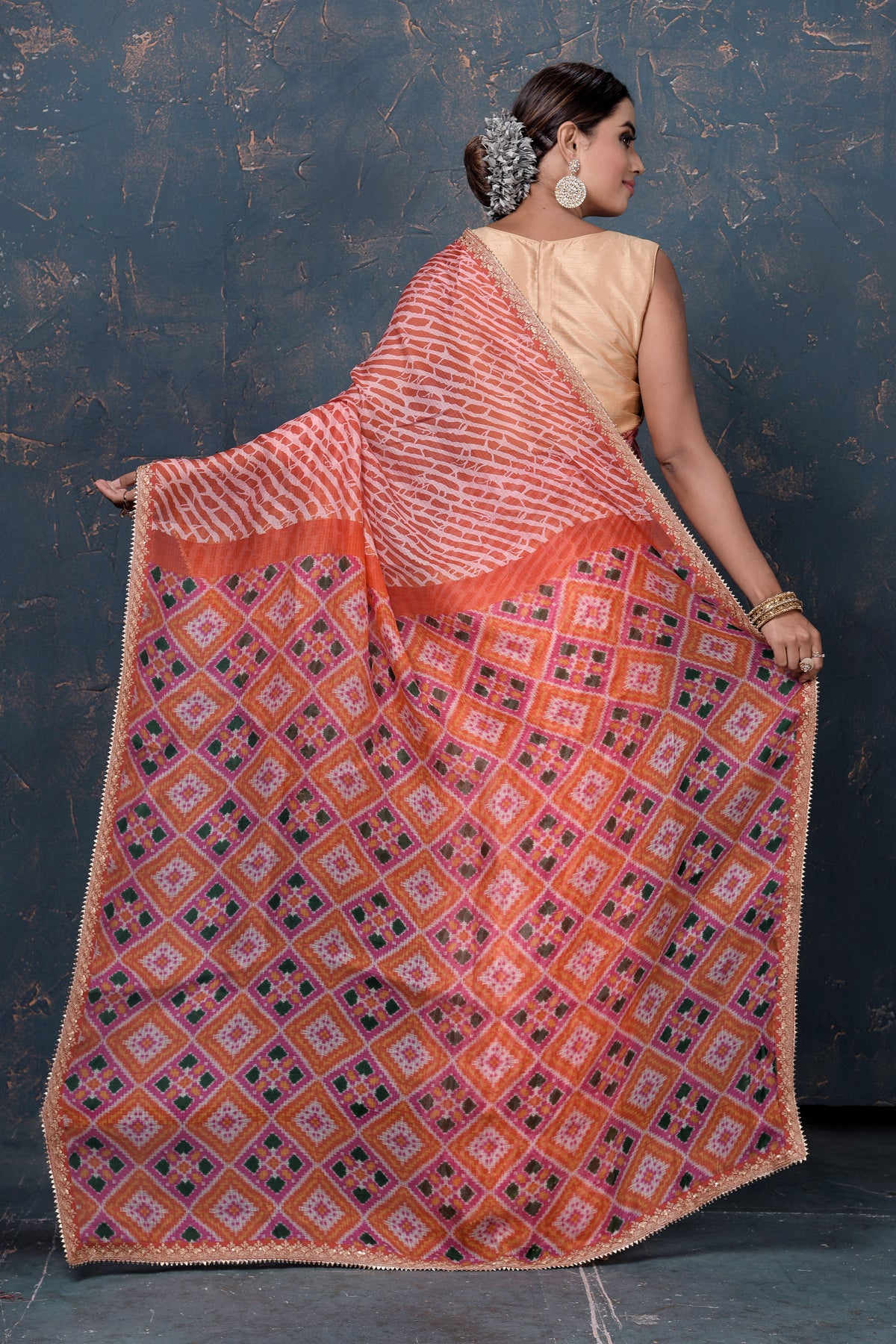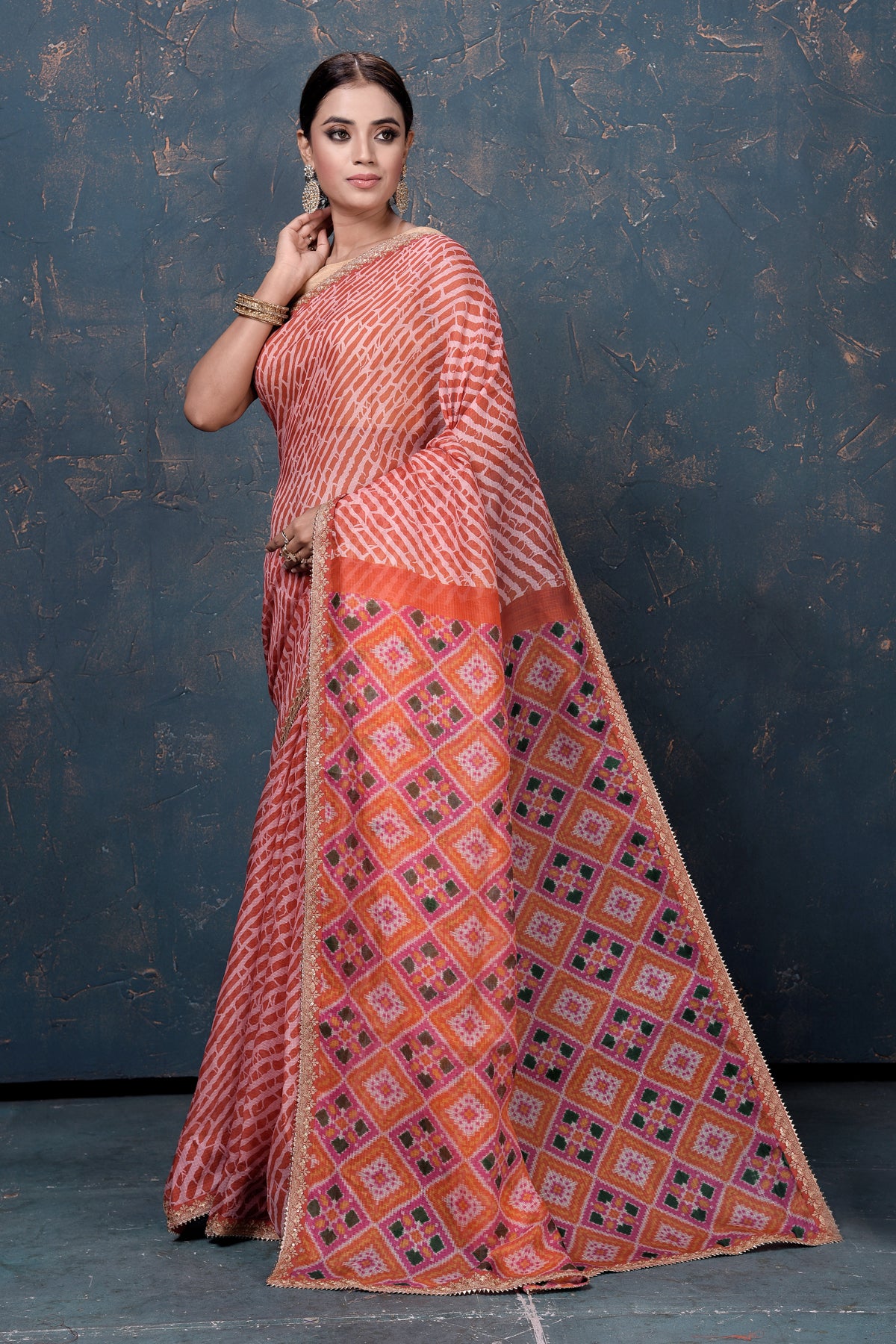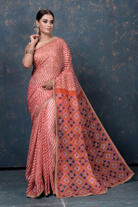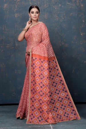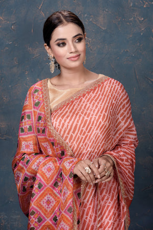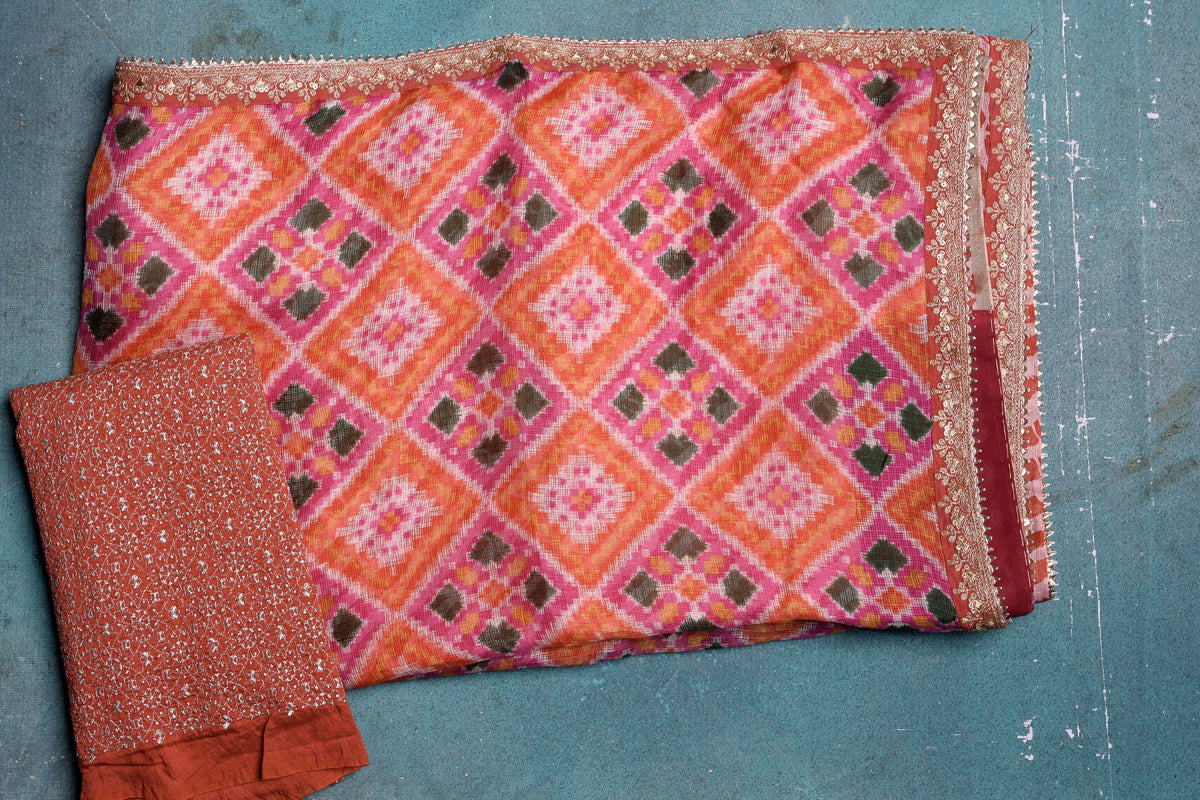 Beautiful orange Kota Patola print sari with embroidery is an unique piece for your ethnic wardrobe! It is perfect for parties and festive occasions. It comes with a matching blouse piece. Shop organza sarees in USA from Pure Elegance.