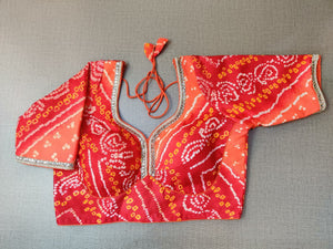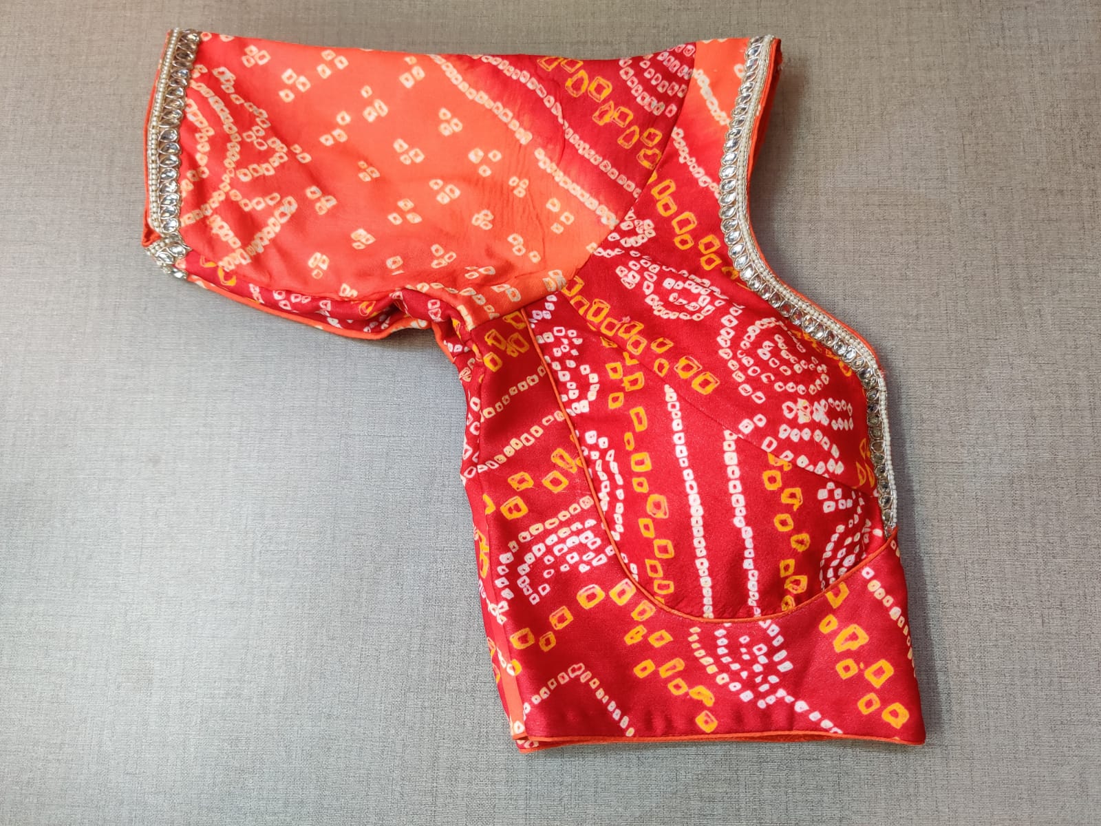 Beautiful orangish red bhandani printed design saree blouse. Shop readymade saree blouses in USA from Pure Elegance..