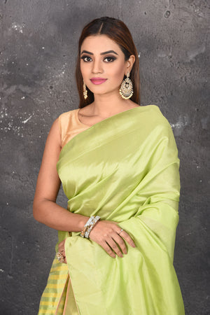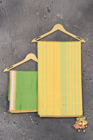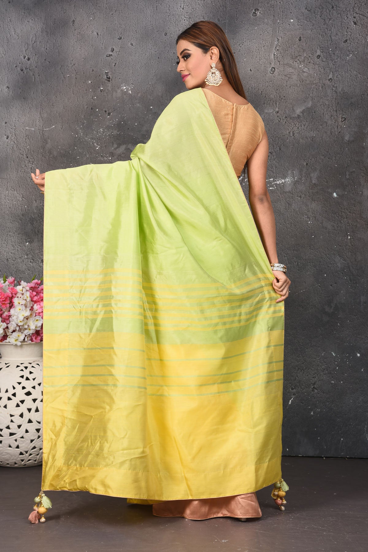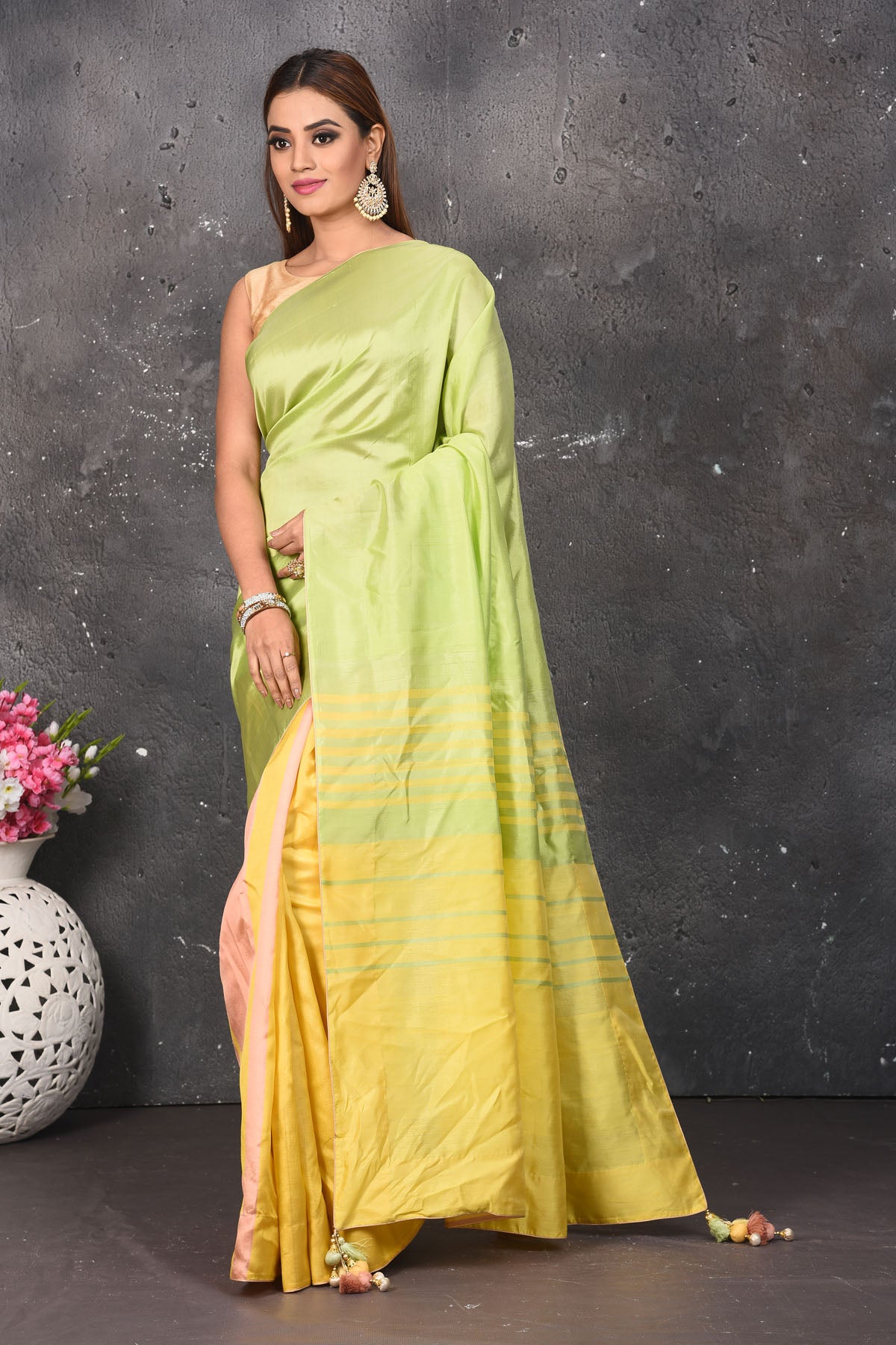 Keep it classy and stylish on special occasions in this gorgeous pastel green and pink matka silk saree with yellow pallu. It comes with a matching blouse piece. Shop silk sarees online in USA from Pure Elegance.