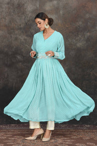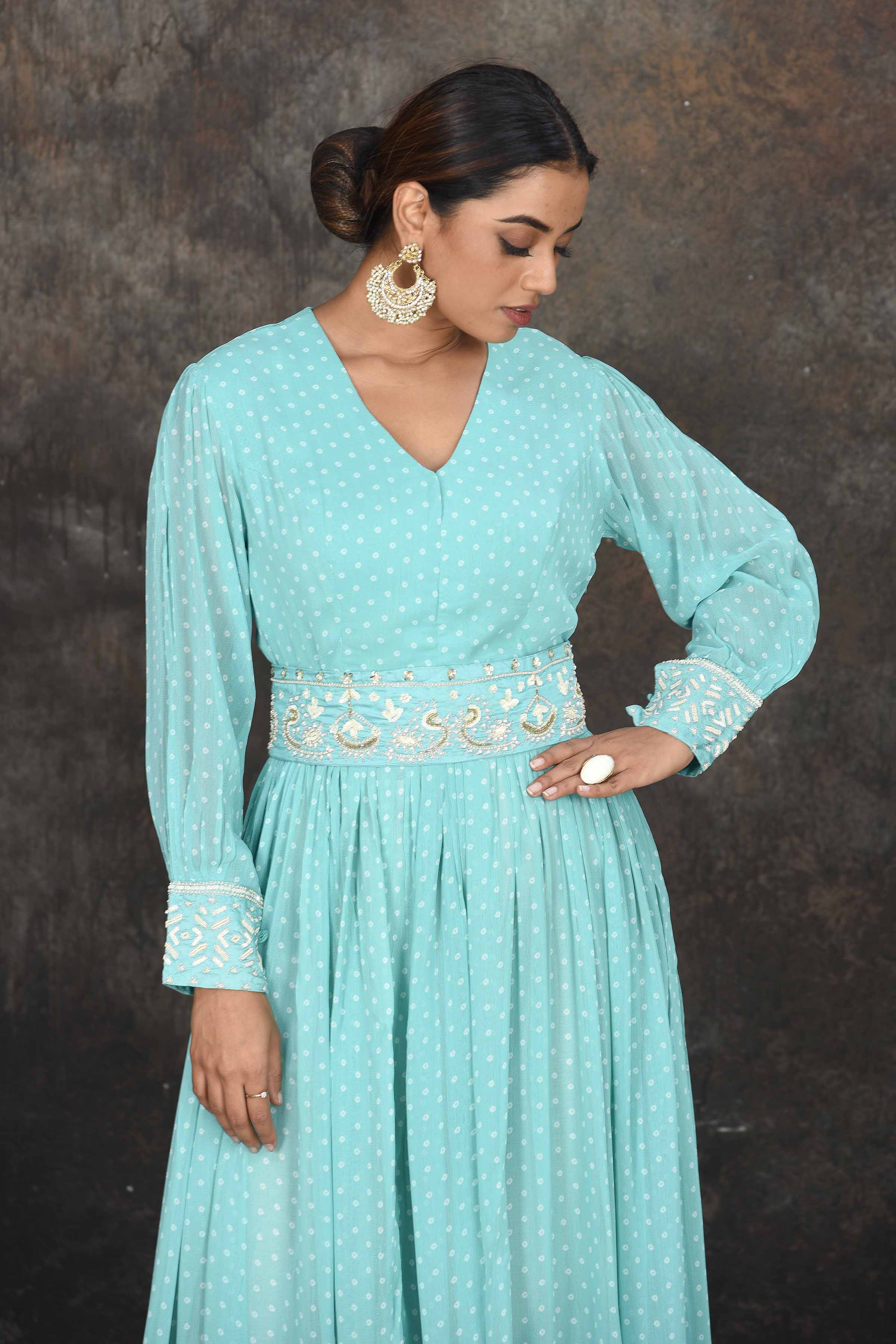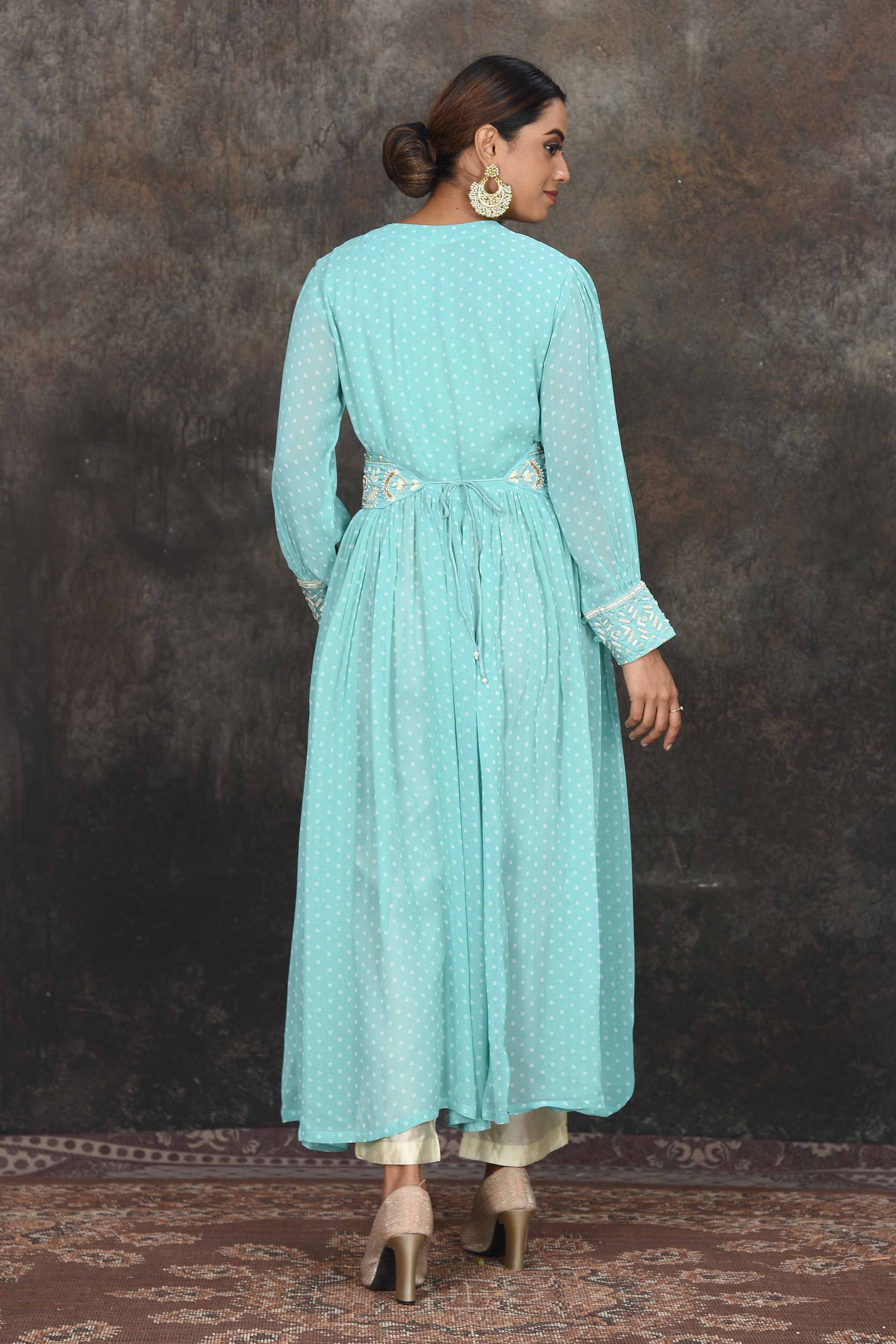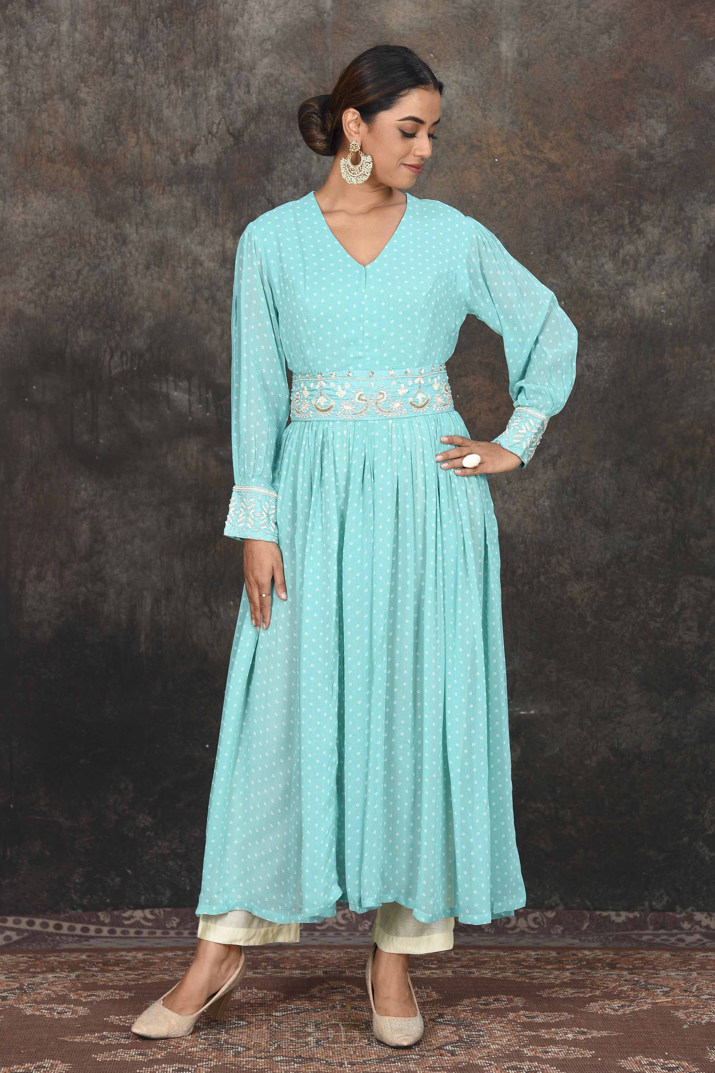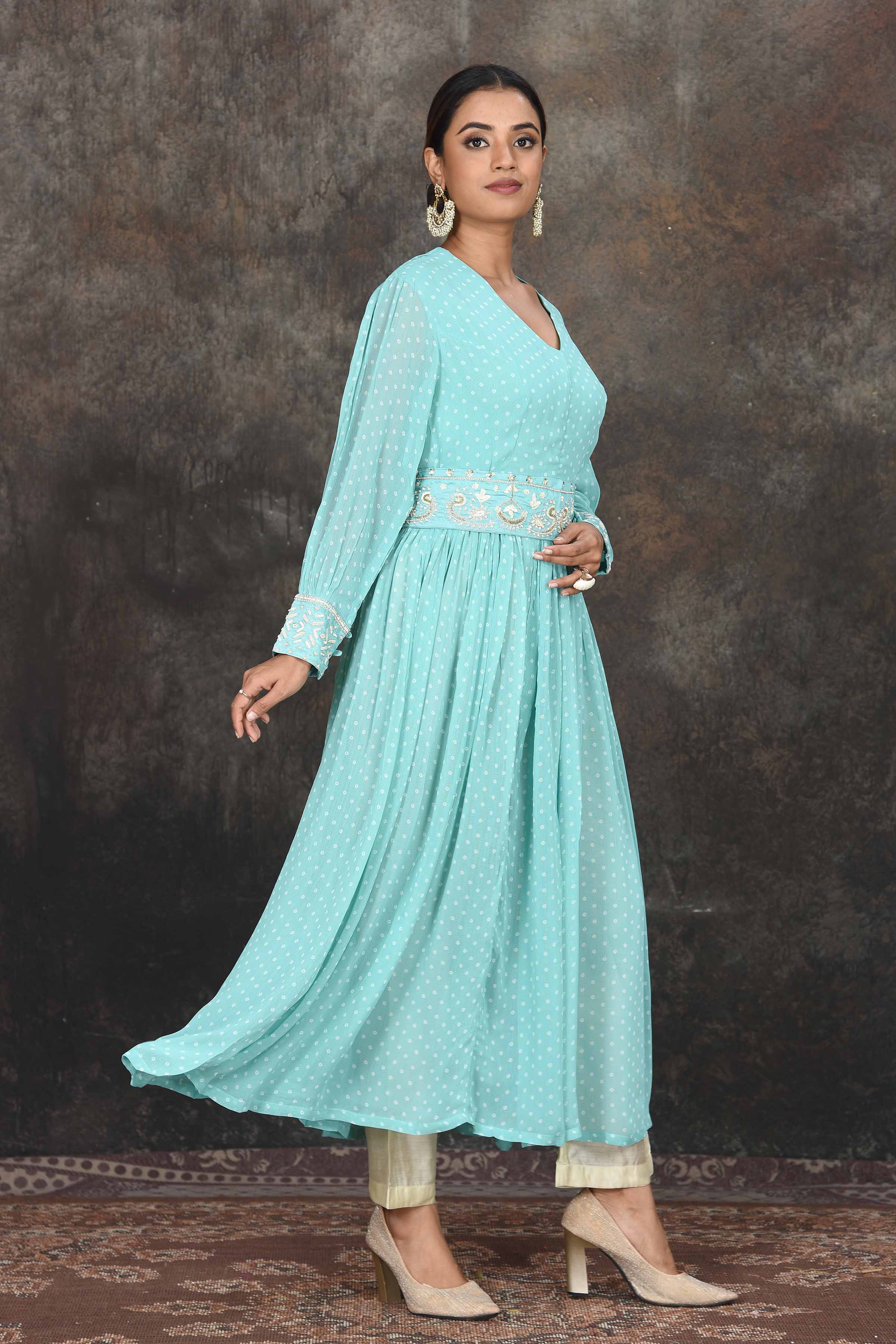Beautiful pastel green bandhej Anarkali with embroidered belt. The anarkali comes with a pair of cream pants and is a perfect ensemble for festive occasions. Shop online in USA from Pure Elegance.