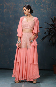 Gorgeous peach embroidered three piece palazzo suit with cape makes a stylish choice for festive