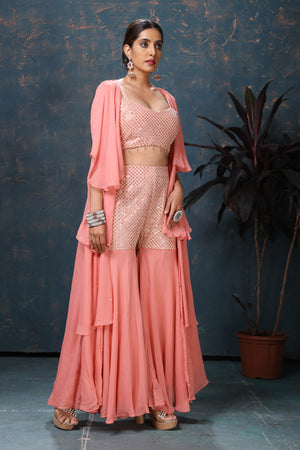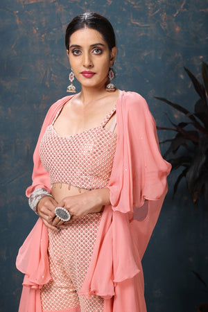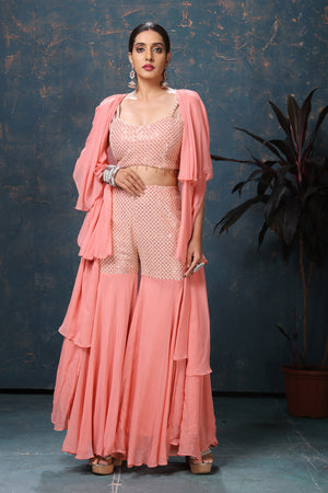 502723 Peach Embroidered Three Piece Palazzo Suit with Cape