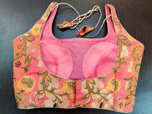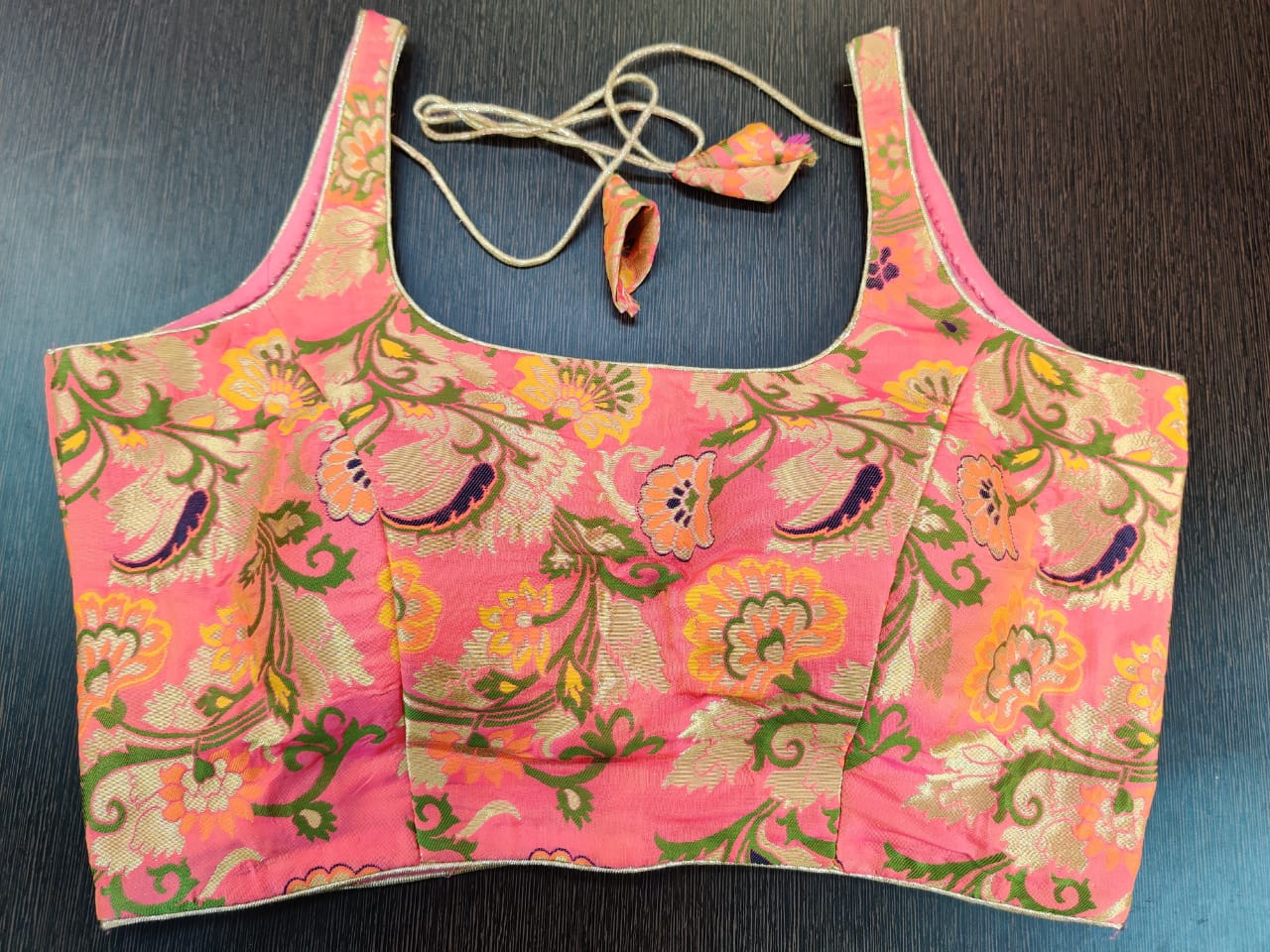 Gorgeous peach floral Banarasi sleeveless saree blouse. Buy designer blouse in USA from Pure Elegance.