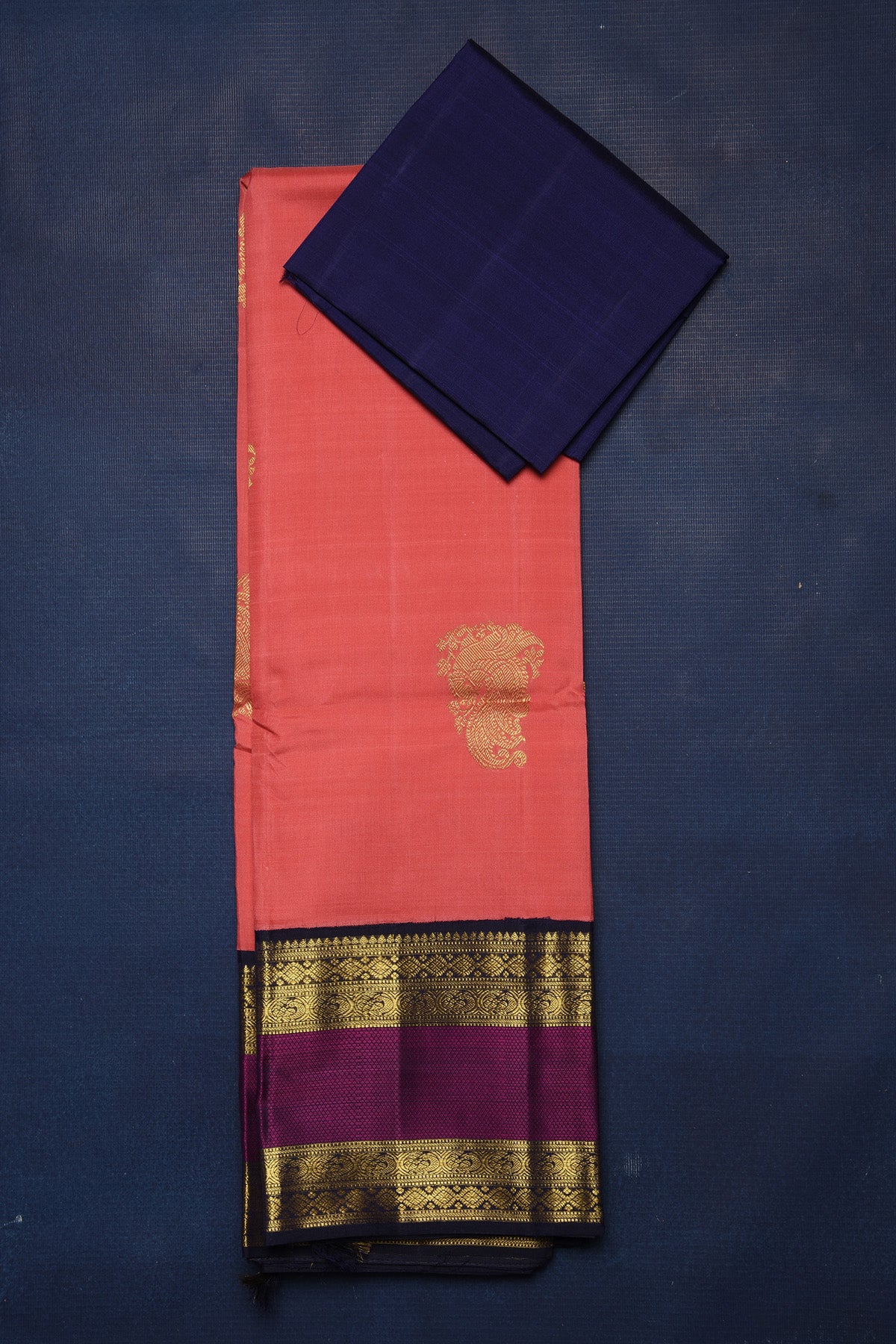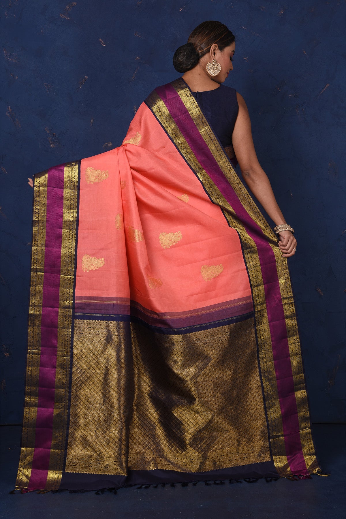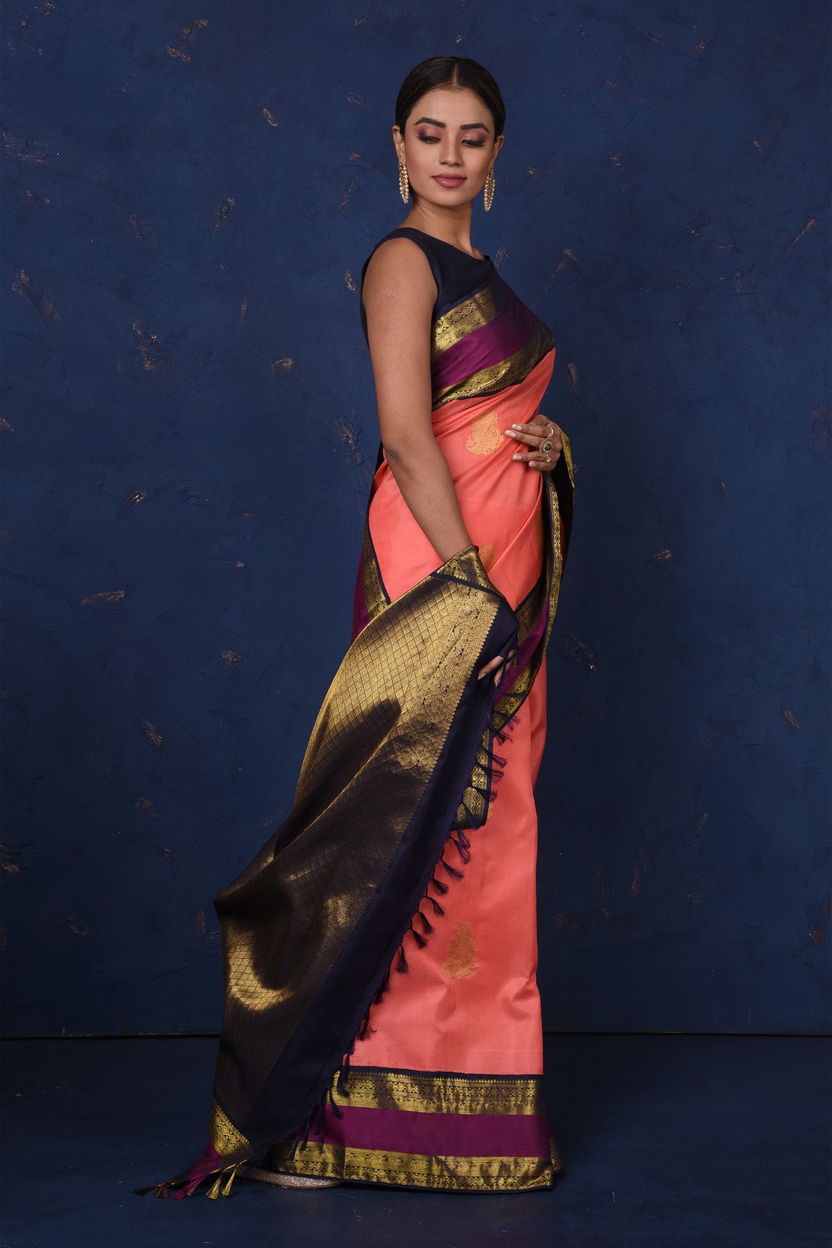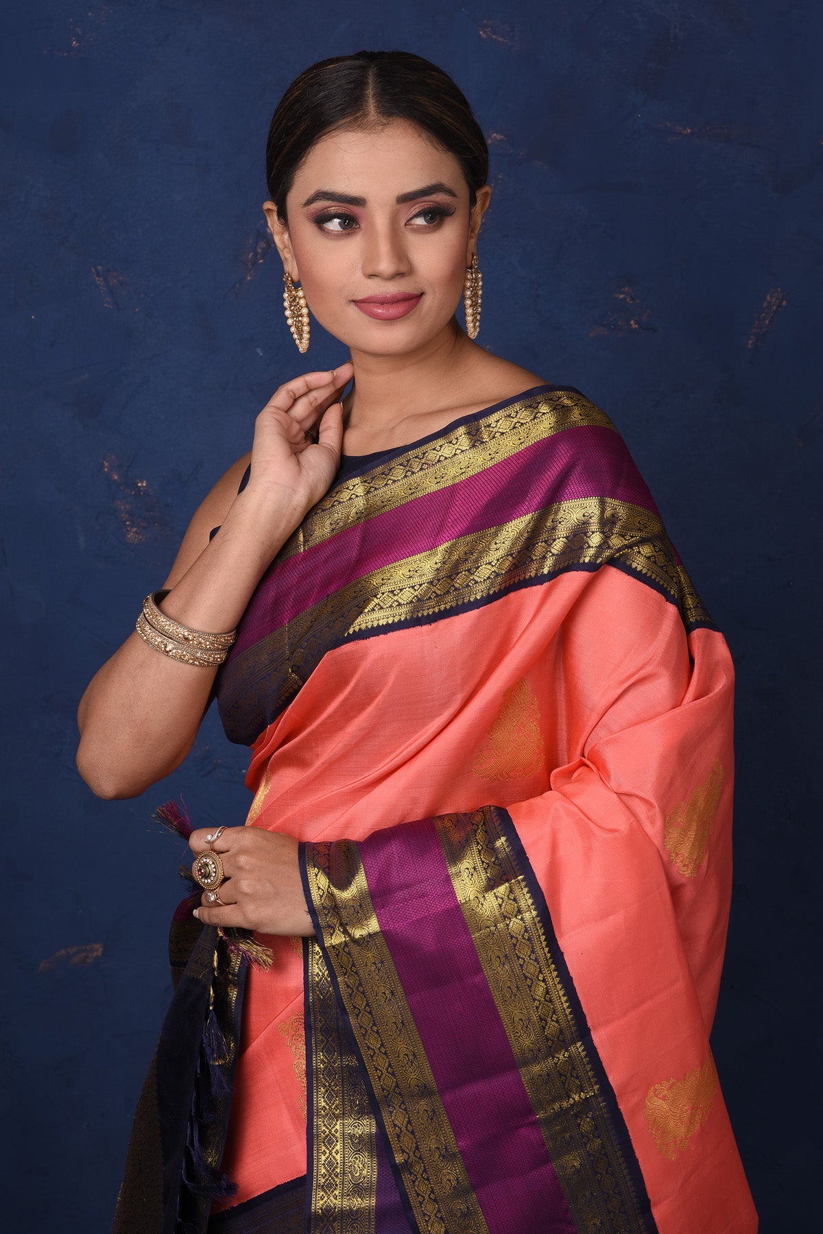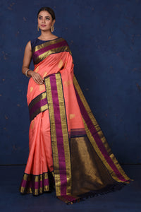 Be the center of attraction on special occasions in this beautiful peach Kanjivaram saree with purple golden zari border. It comes with a matching blouse piece. Shop Kanchipuram sarees in USA from Pure Elegance.