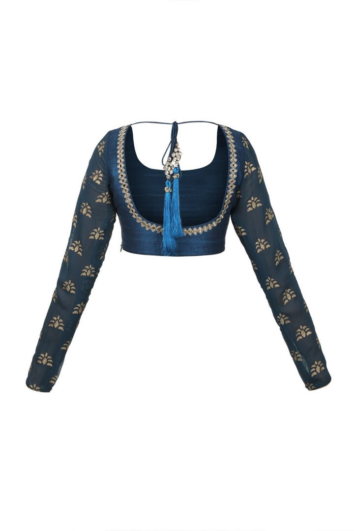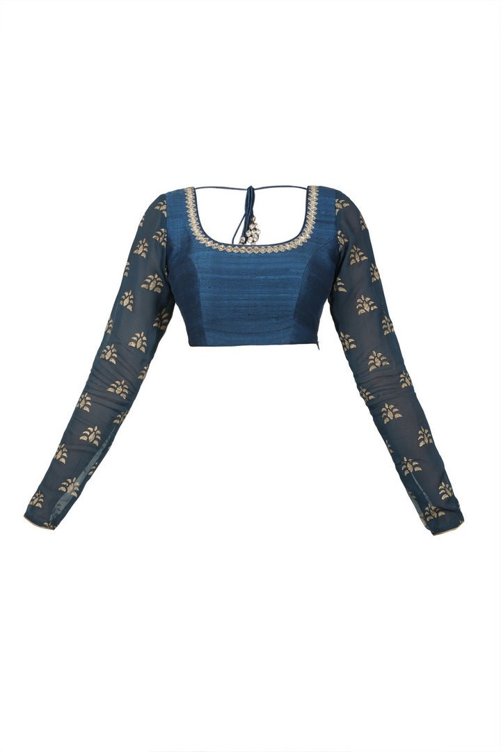 Go for a perfect party look with this peacock blue raw silk blouse that has block print on the sleeves and embroidery on the neckline. Shop online at Pure Elegance or visit our store in USA!