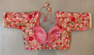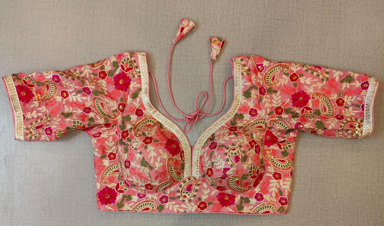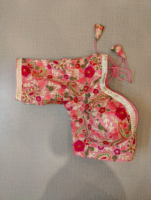 Beautiful pink aari embroidery choli-cut saree blouse with sequin lace. Buy designer blouse in USA from Pure Elegance.