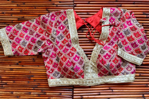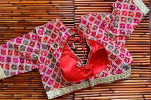 Gorgeous pink and red embroidered designer saree blouse. Shop designer saree blouse online in USA from Pure Elegance.