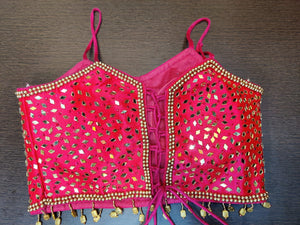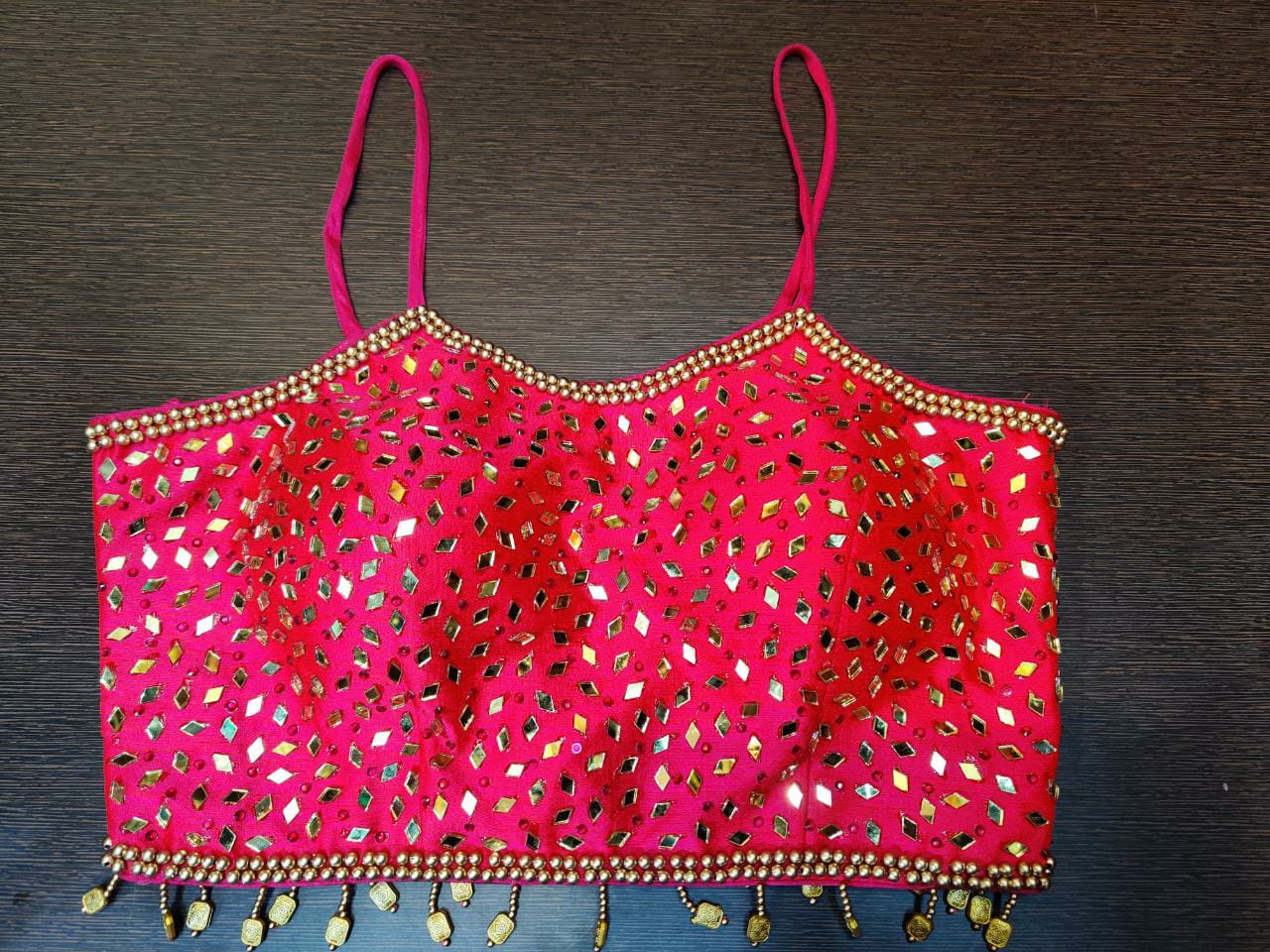 Stunning pink designer saree blouse with mirror work. Buy designer blouse in USA from Pure Elegance.