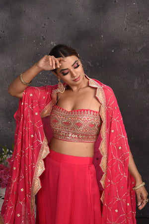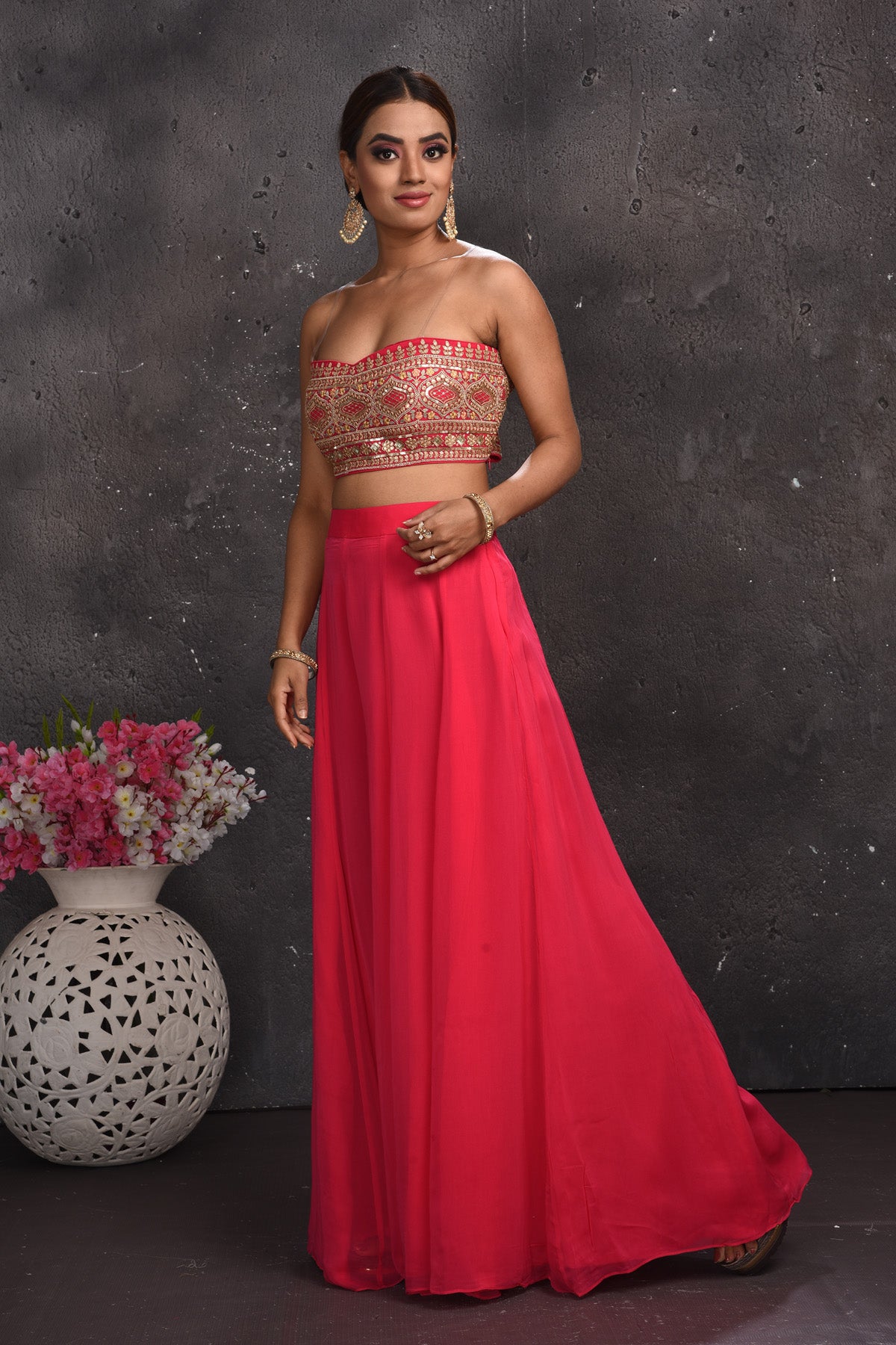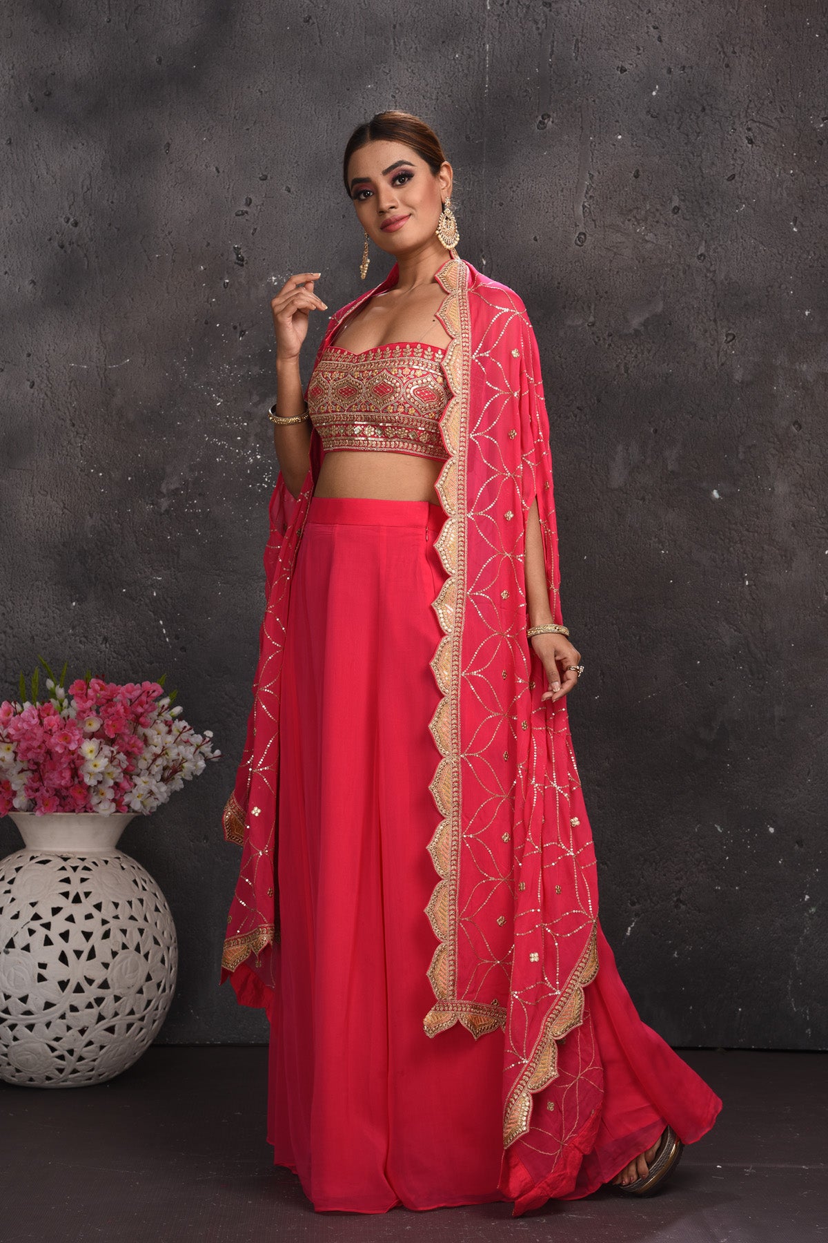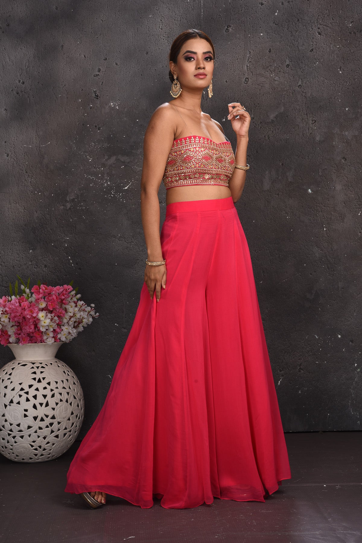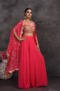 Go for a feminine and contemporary style on wedding and special occasions in this gorgeous pink embroidered palazzo crop top with longline shrug. Shop designer dresses in USA from Pure Elegance.