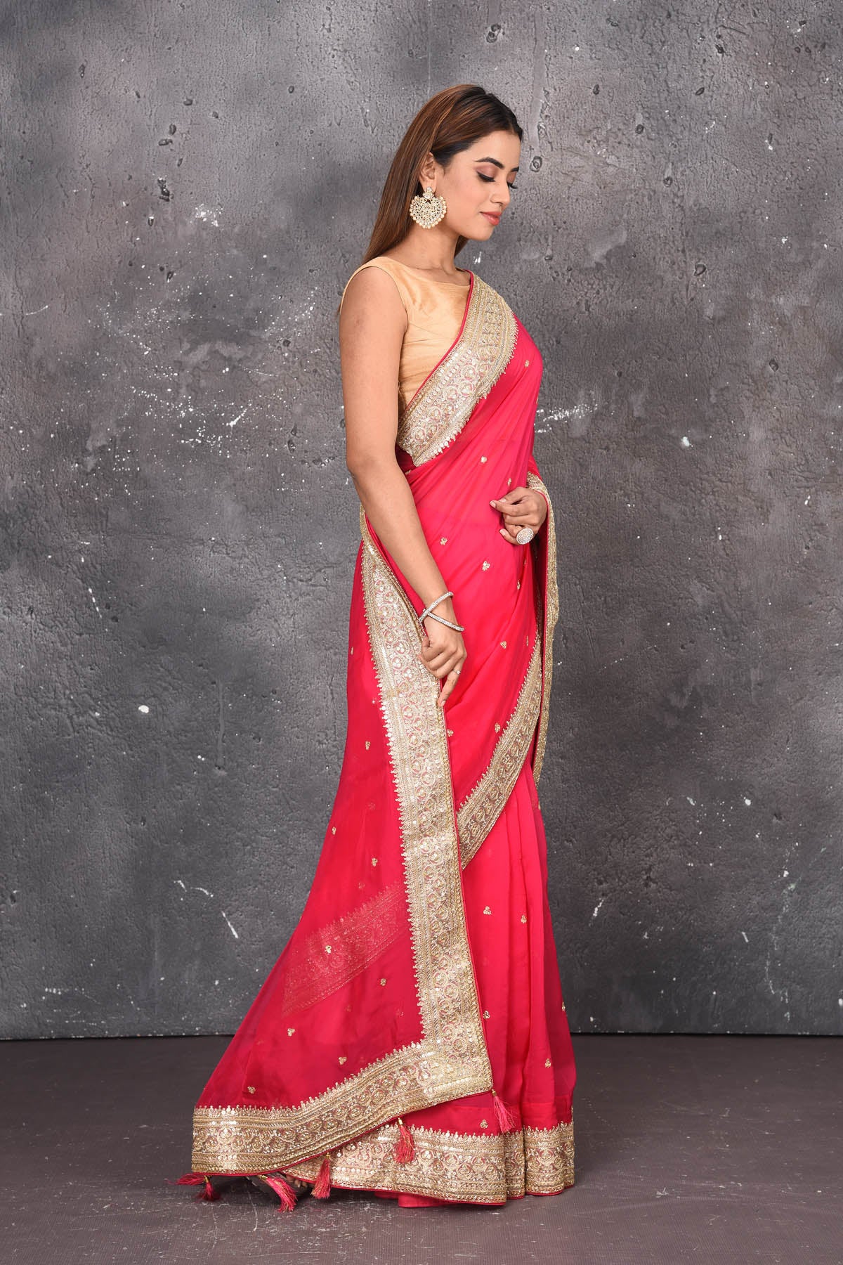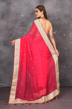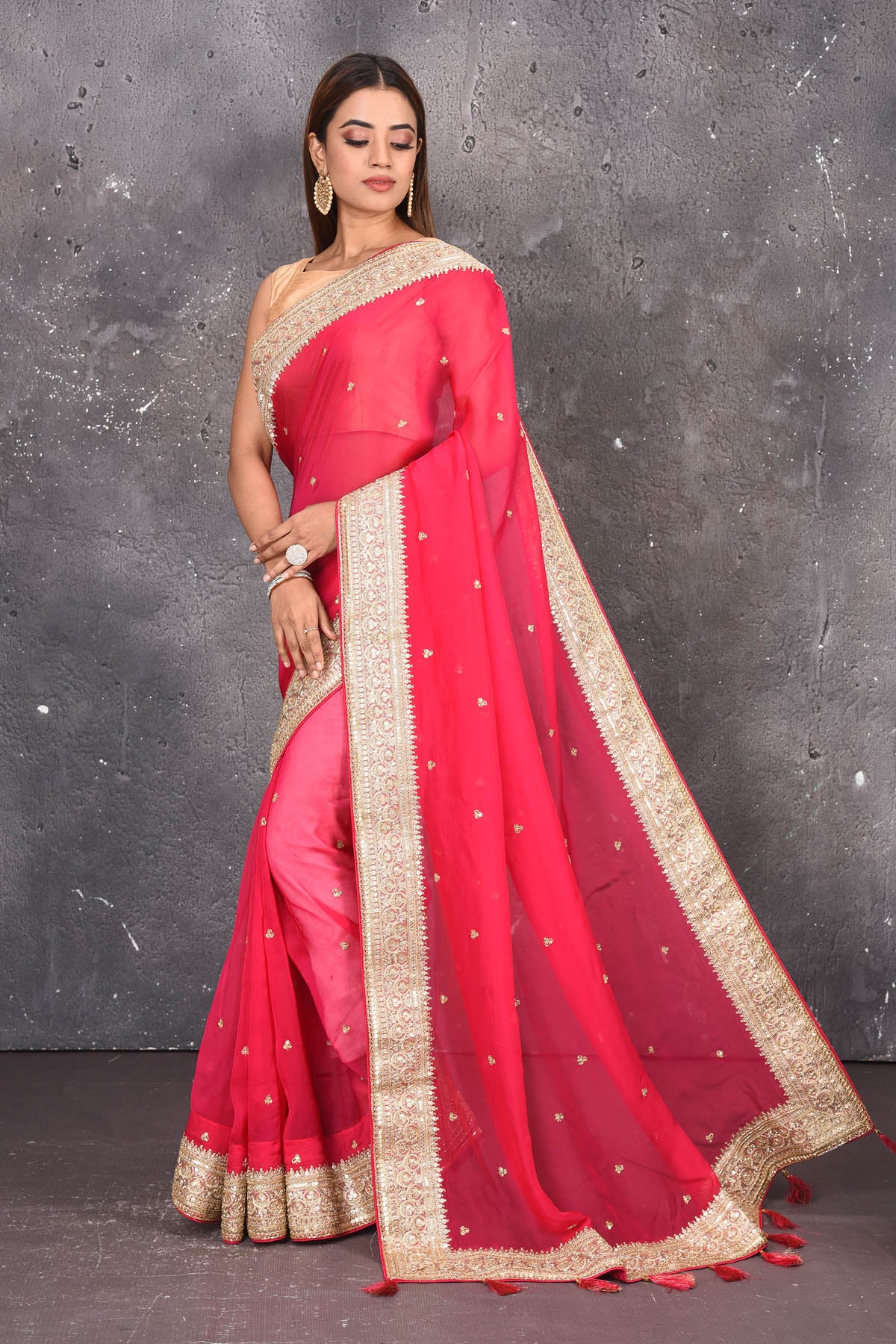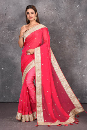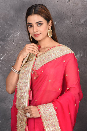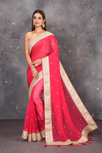 This banarasi Georgette saree is a great choice and a must for every wardrobe. Embellished with a beautiful pattern, the vintage design enhances the royal look of the saree. Made with an intricate technique, this is a heritage of its own kind. With a rich border enveloping the saree, it is a stellar style statement. Pair this pink banarasi georgette handloom designer saree with a moti necklace or jhumke.