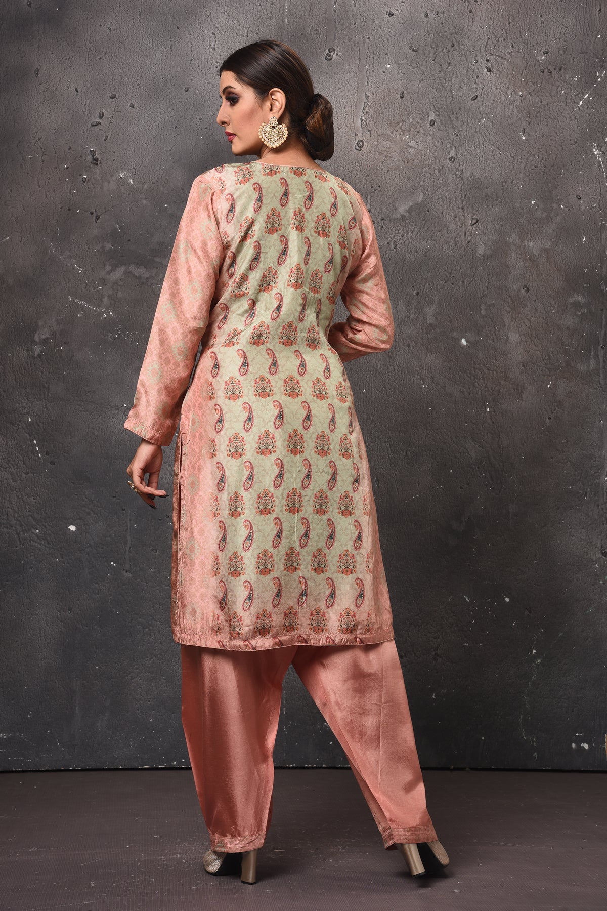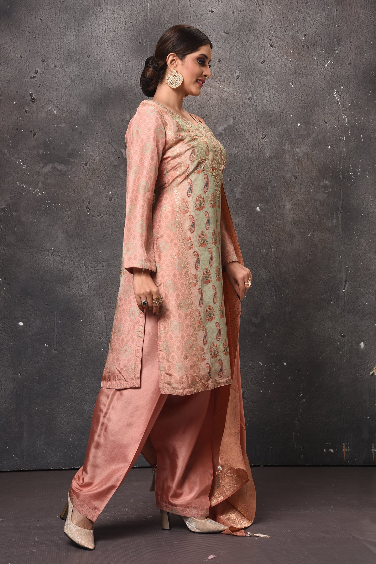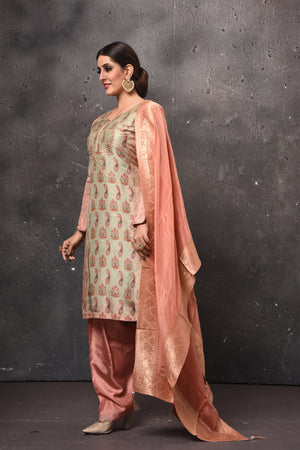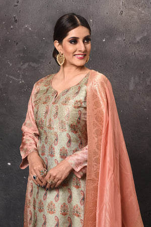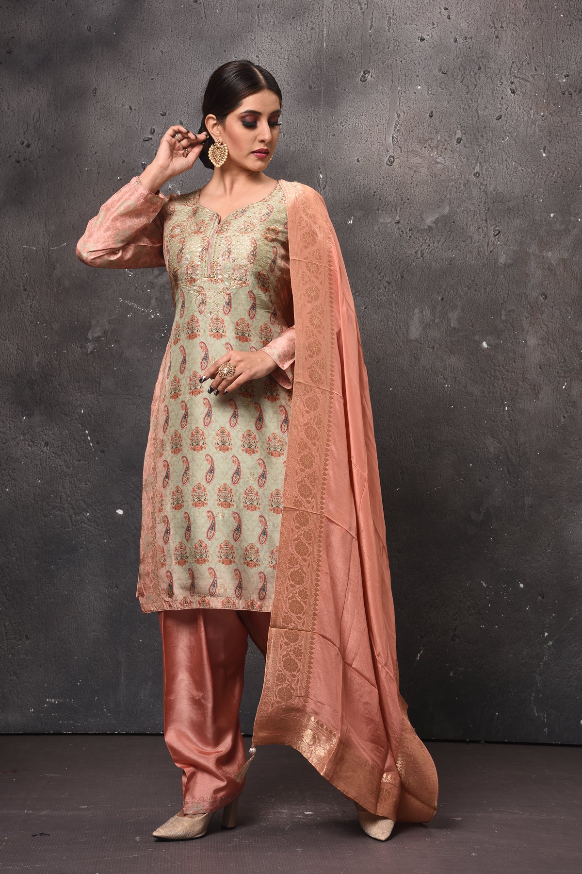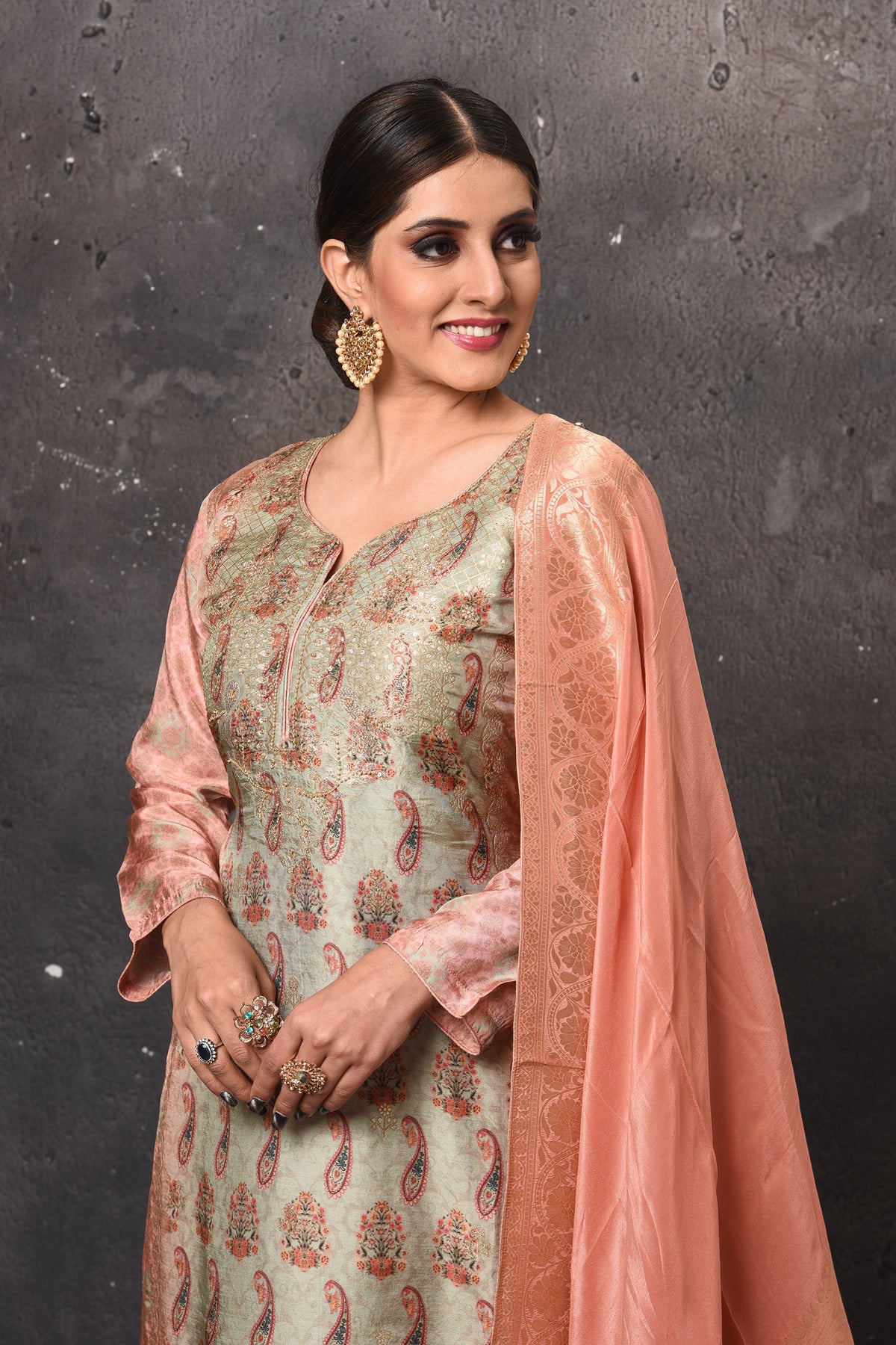 Be the center of attraction in this elegant pista green and peach embroidered salwar suit with matching dupatta. The suit is a perfect ensemble for parties and festive occasions.