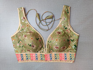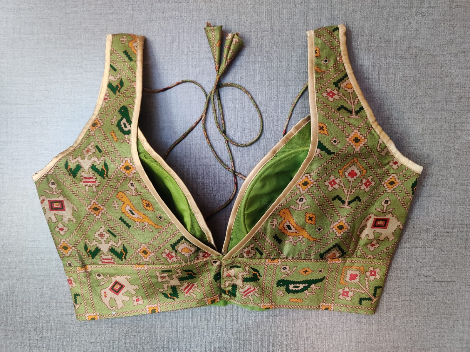 Beautiful pista green digital ikkat Patola print saree blouse with embroidered border. Buy designer blouse in USA from Pure Elegance.