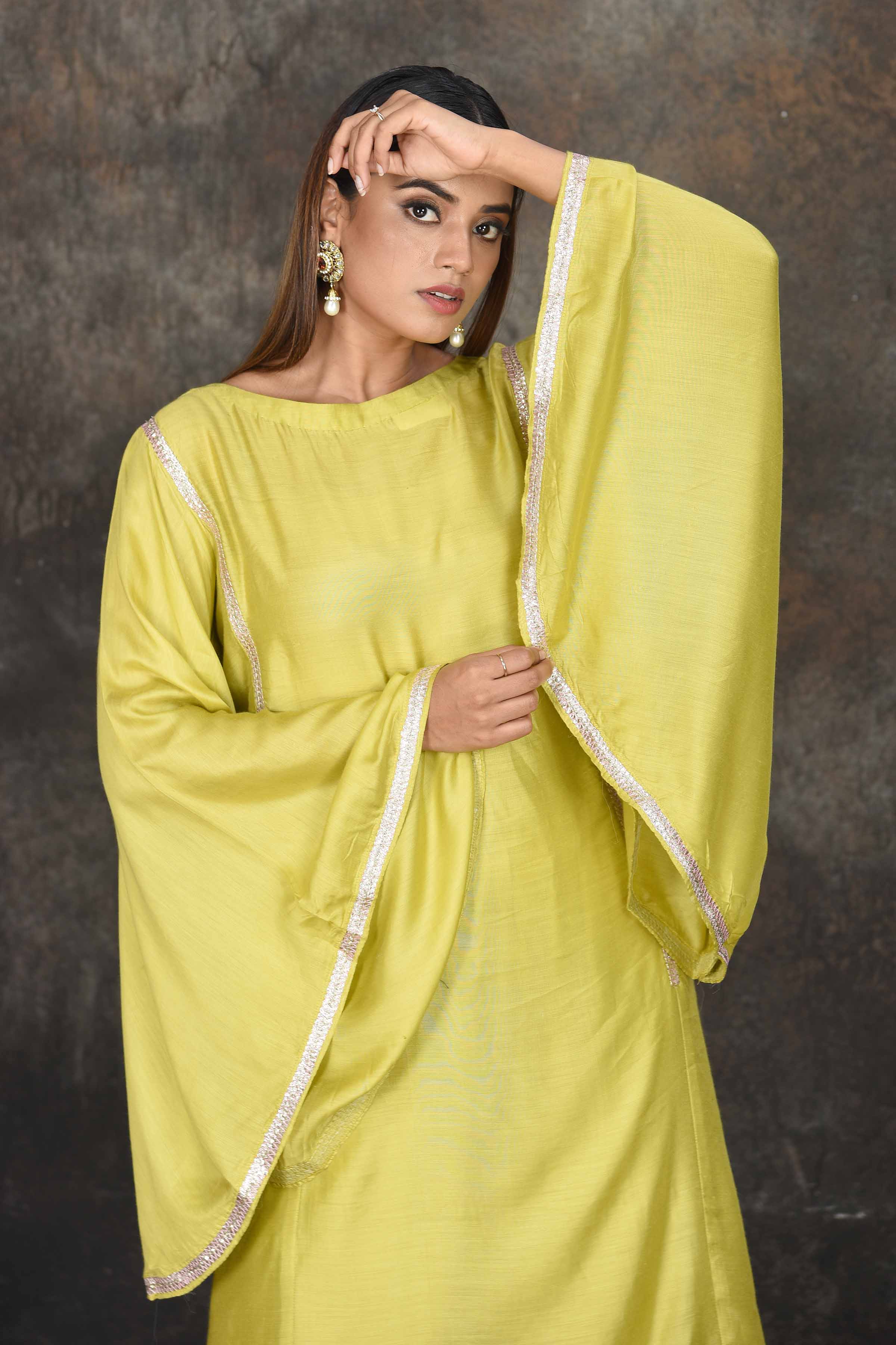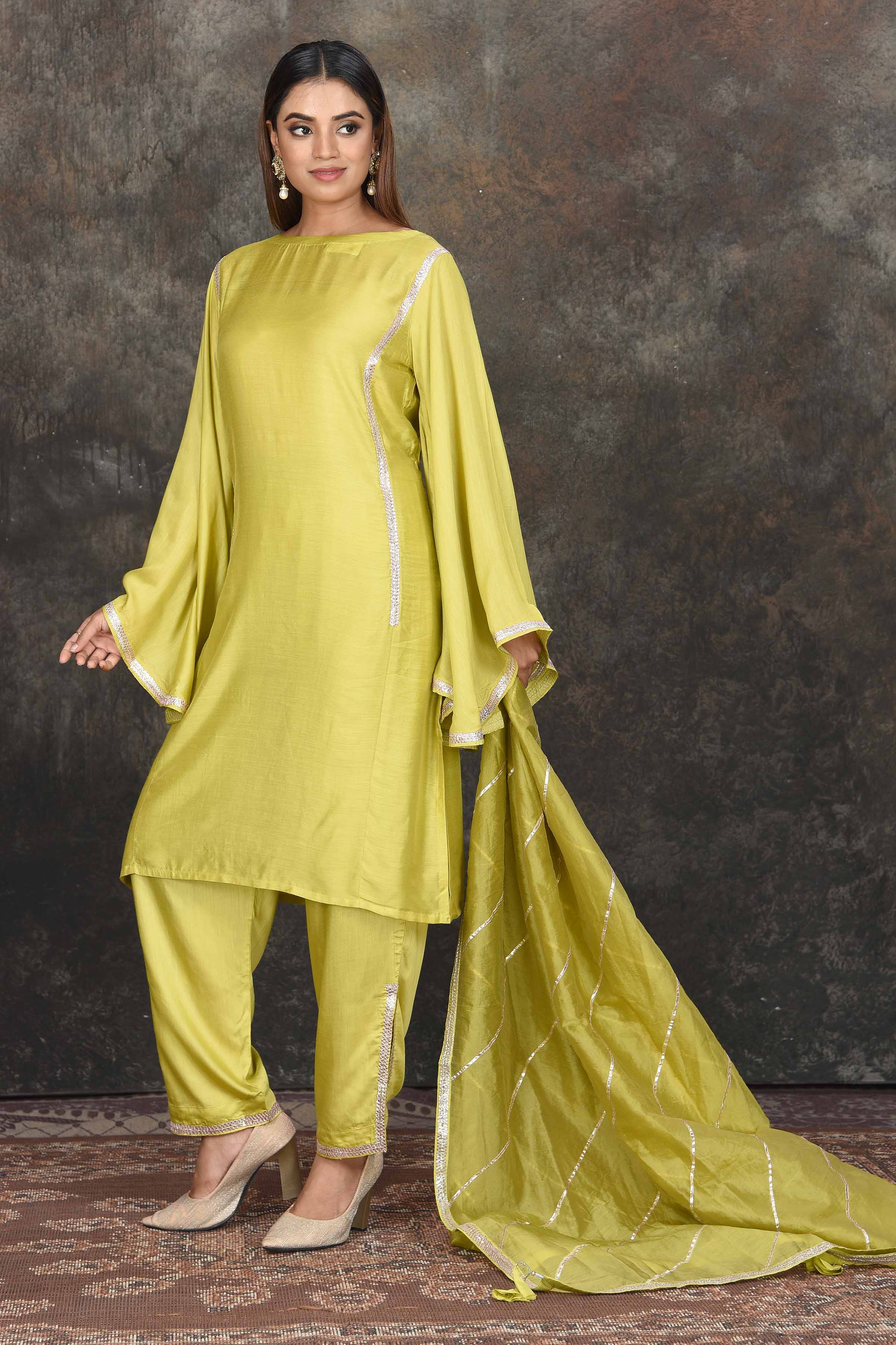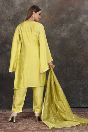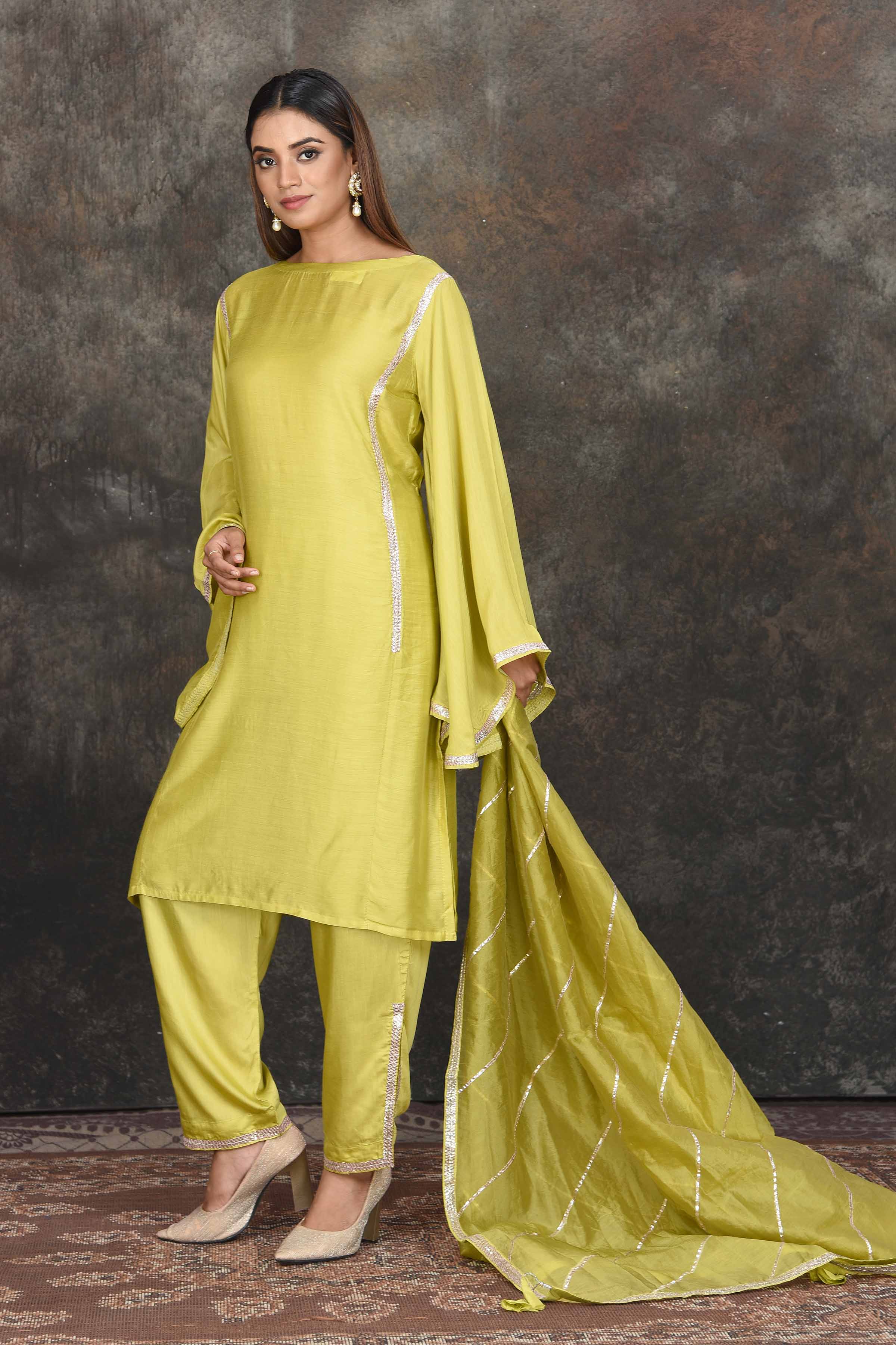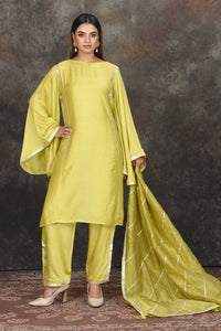 Look beautiful on festive occasions in this exquisite pista green embellished designer suit. It comes with a dupatta.