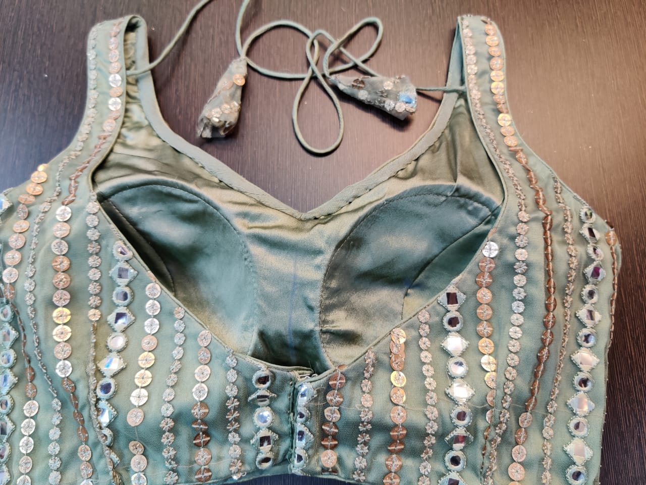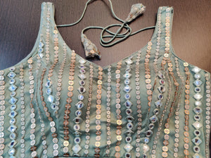 Stunning pista green mirror work sleeveless saree blouse. Buy online from Pure Elegance