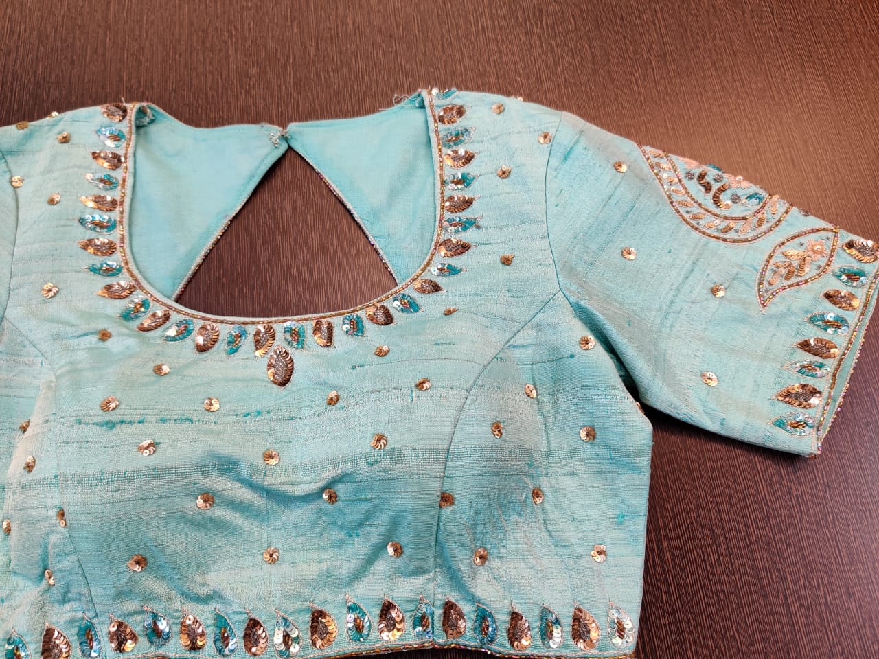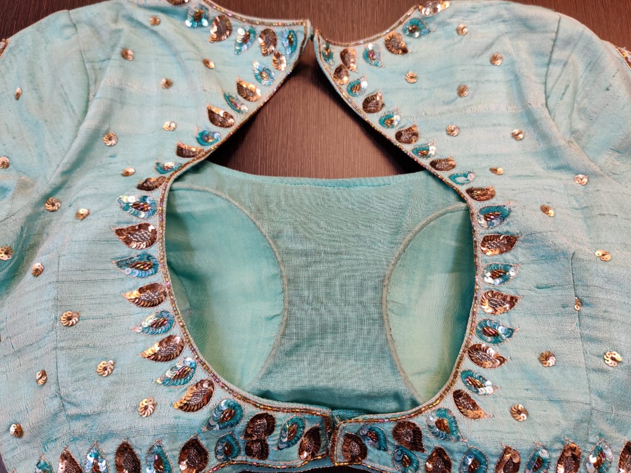 Stunning powder blue embroidered designer saree blouse with cutout back. Shop designer saree blouse online in USA from Pure Elegance.