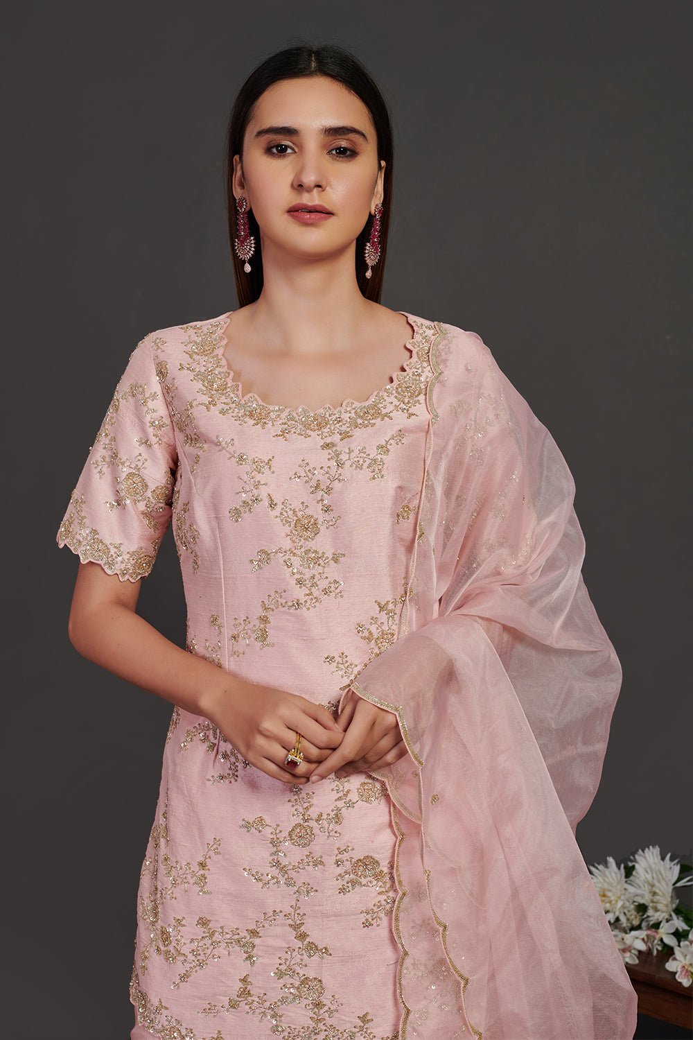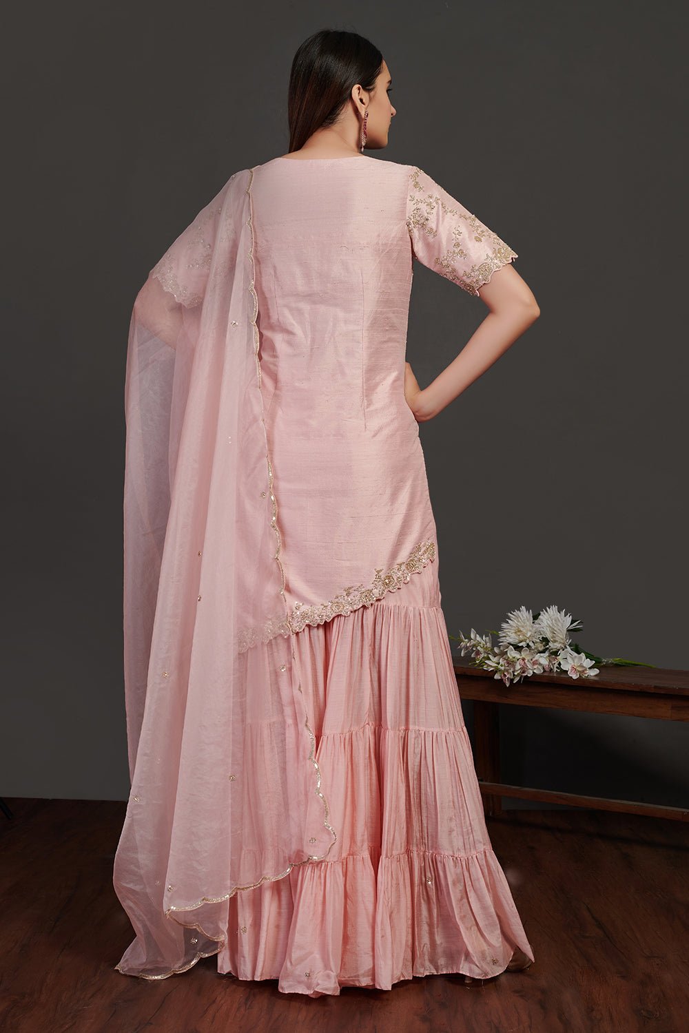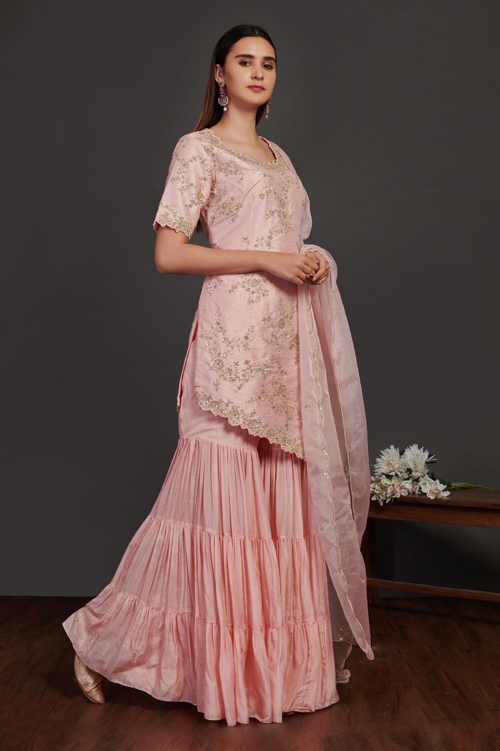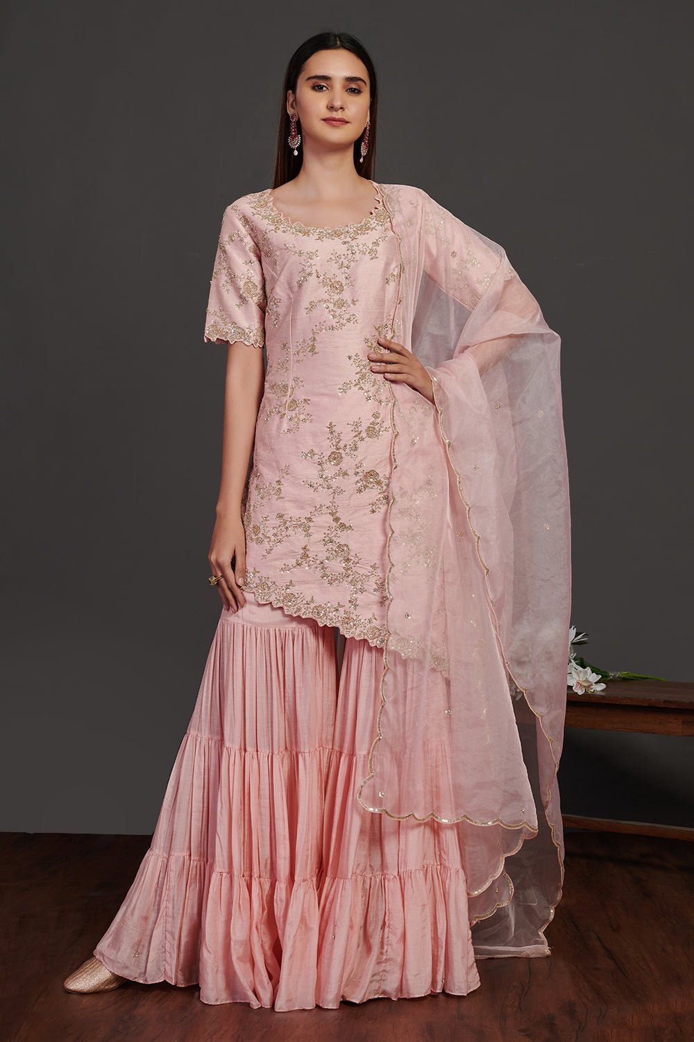 Be a vision of elegance on special occasions in this beautiful powder pink embroidered sharara suit. The suit comes with a matching dupatta. Shop designer suits online in USA from Pure Elegance.