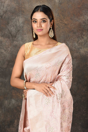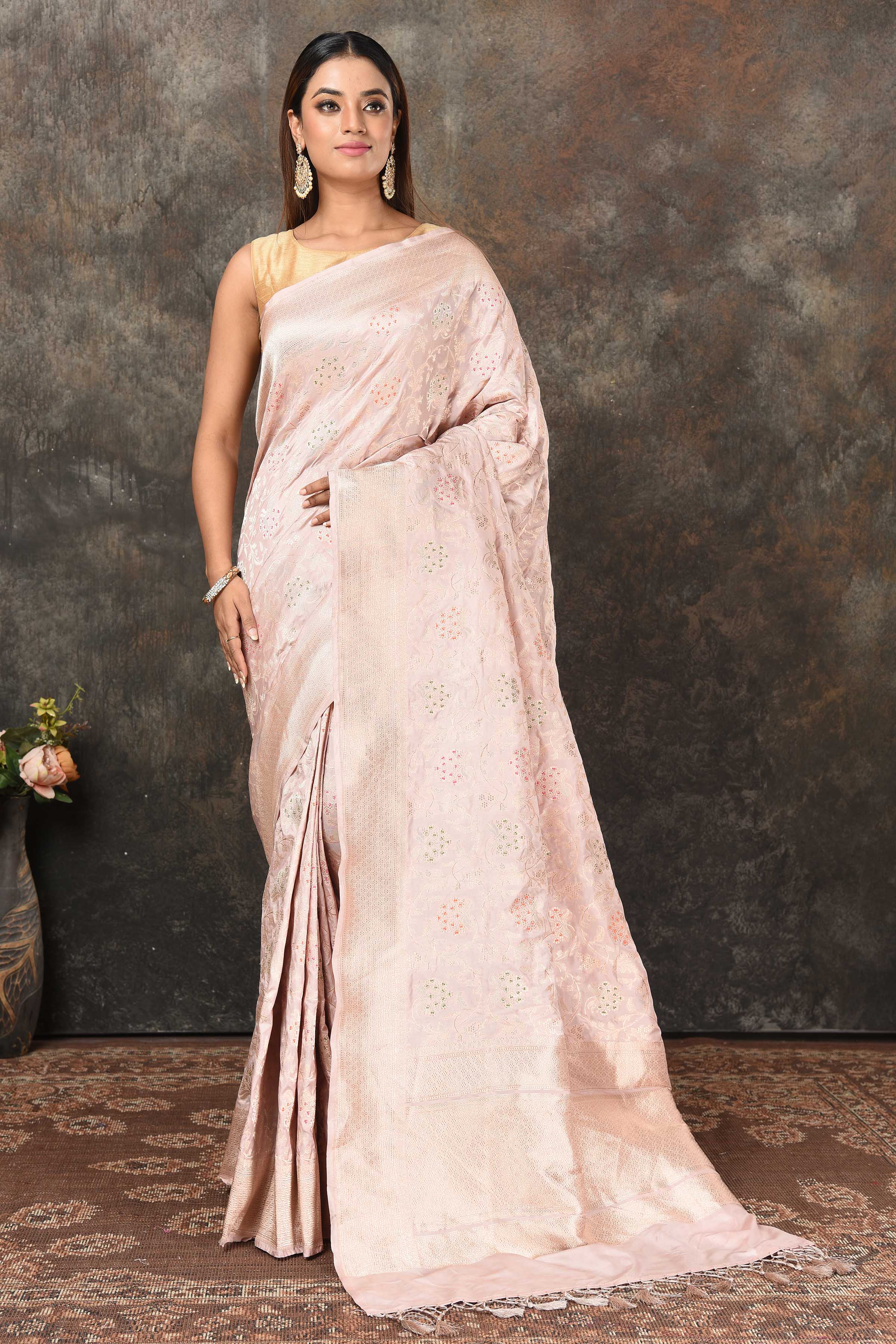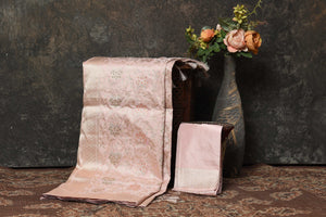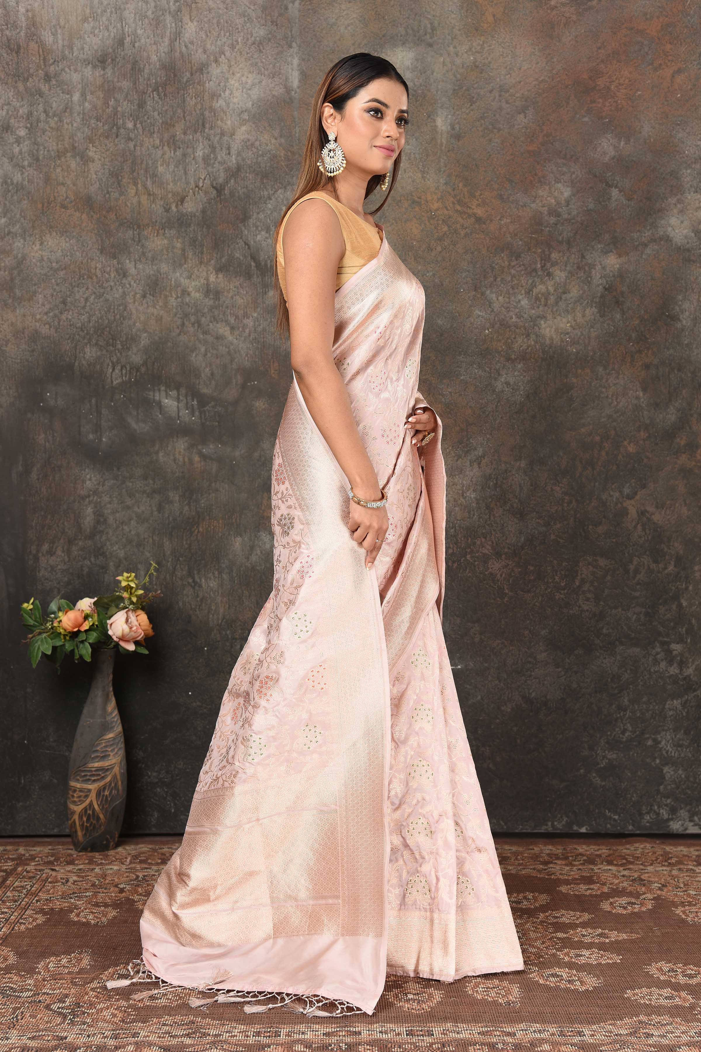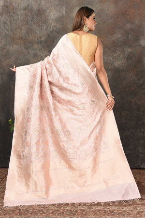 Look royal at weddings and festive occasions in this stunning powder pink Banarasi sari. The saree is crafted with heavy silver minakari zari jaal. It comes with a matching blouse piece.
