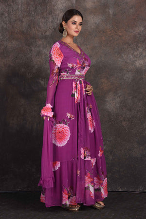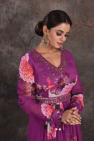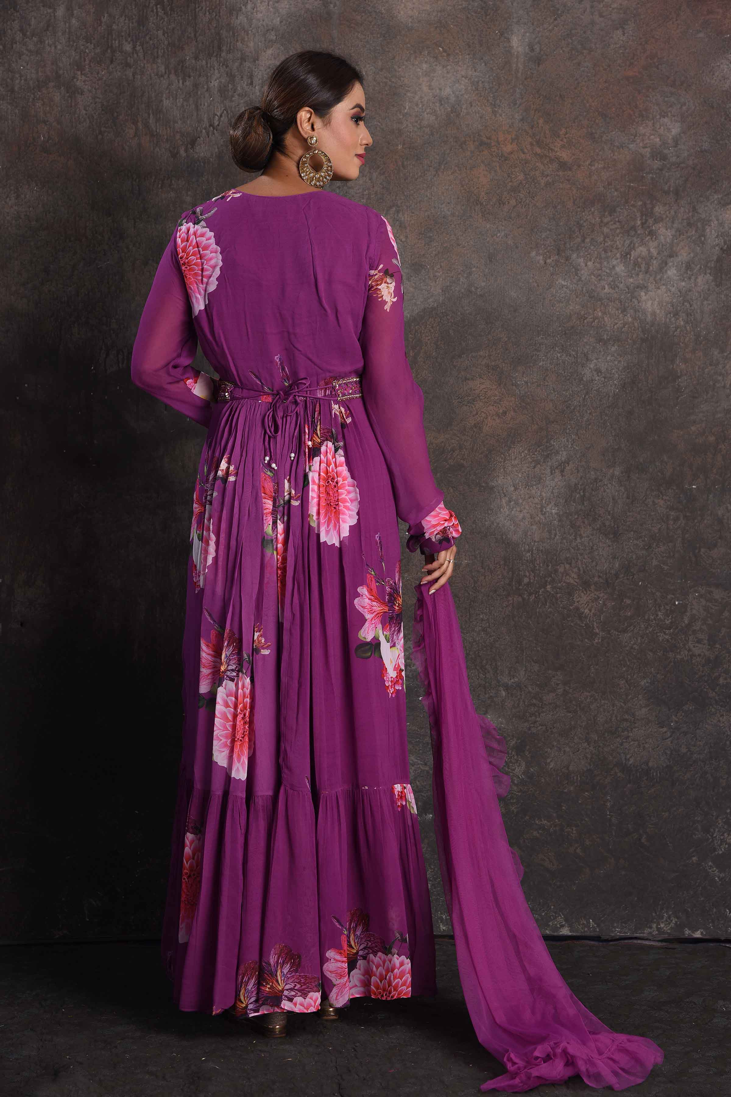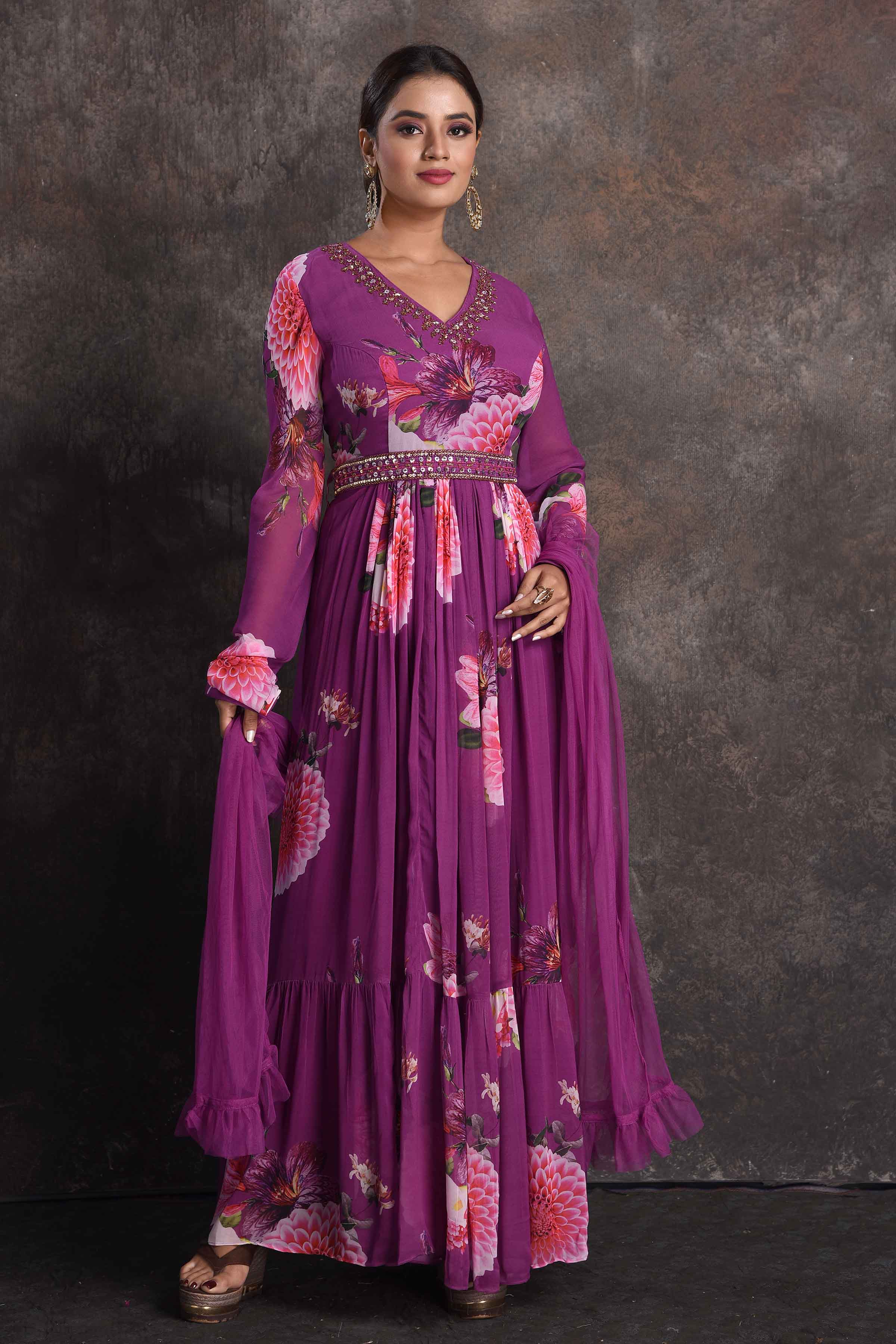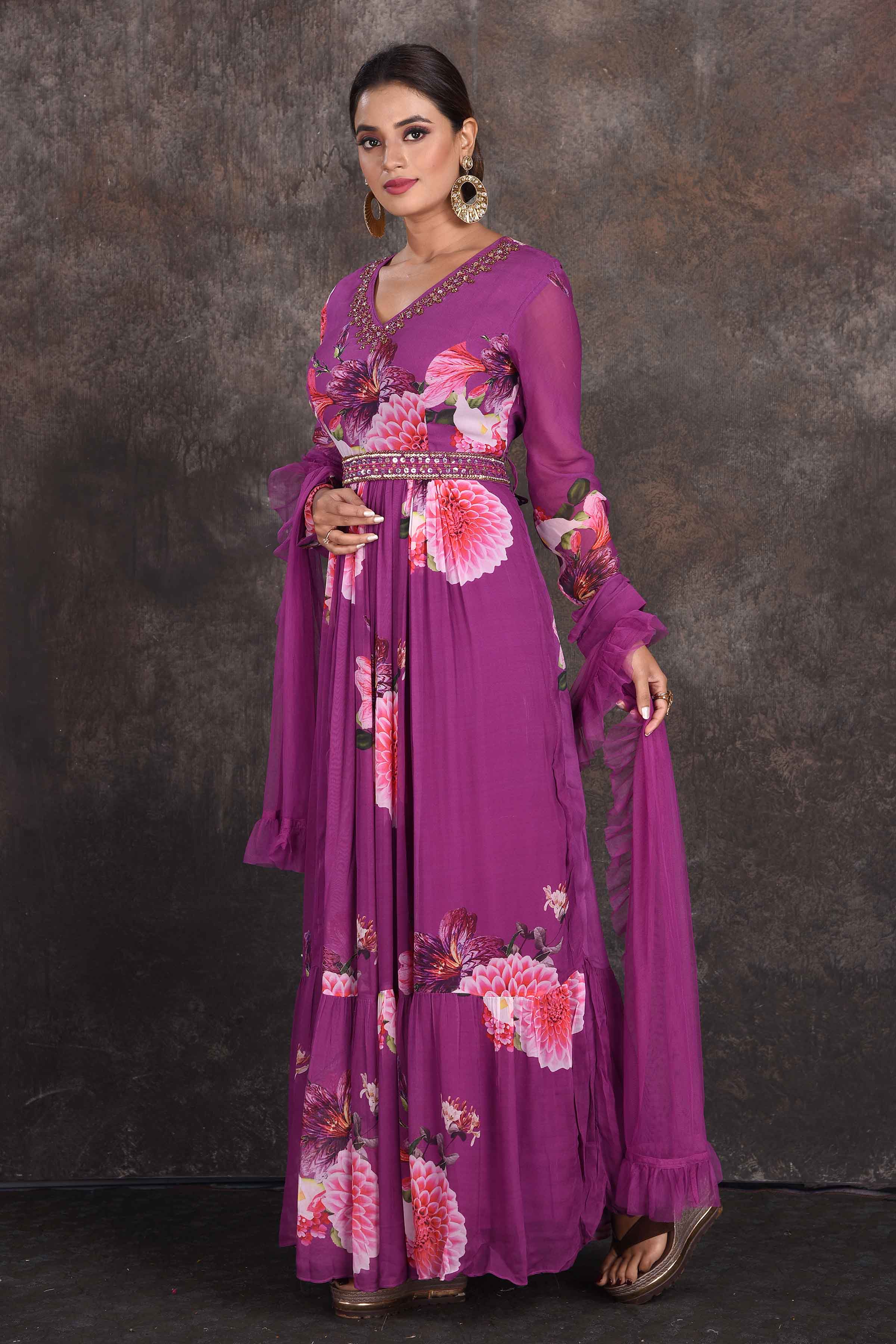 Be the star of the occasion in this beautiful purple floral floorlength Anarkali. The suit comes an embellished belt and a matching dupatta. Shop designer suit in USA from Pure Elegance.