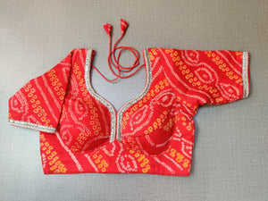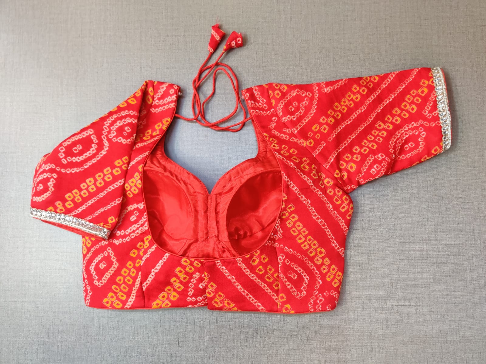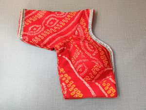 Add red bandhej designer saree blouse with silver lace border. Buy readymade saree blouse in USA from Pure Elegance..