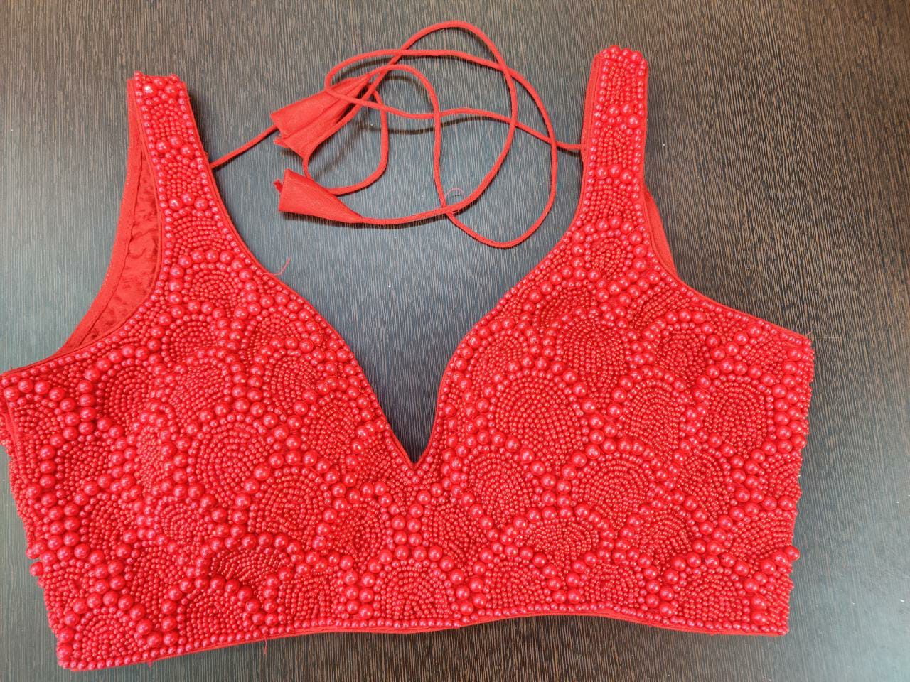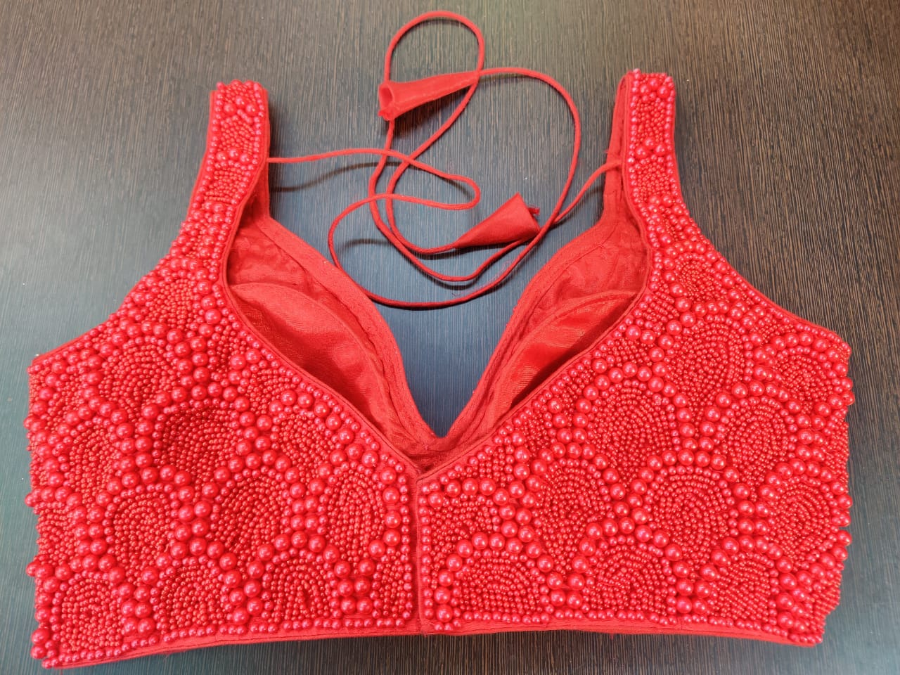 Gorgeous red bead work designer sleeveless saree blouse. Buy designer blouse in USA from Pure Elegance.
