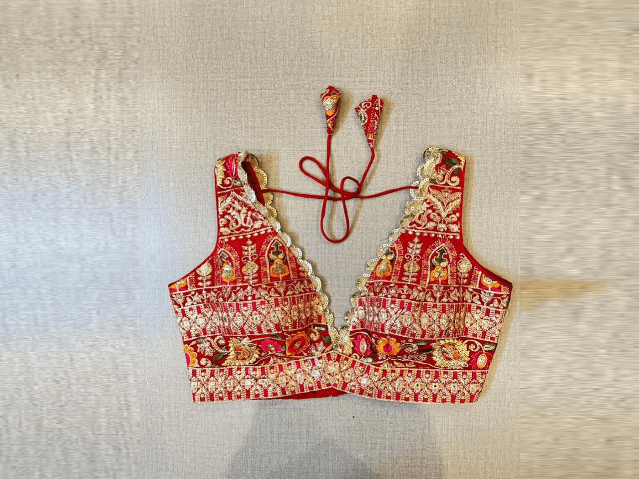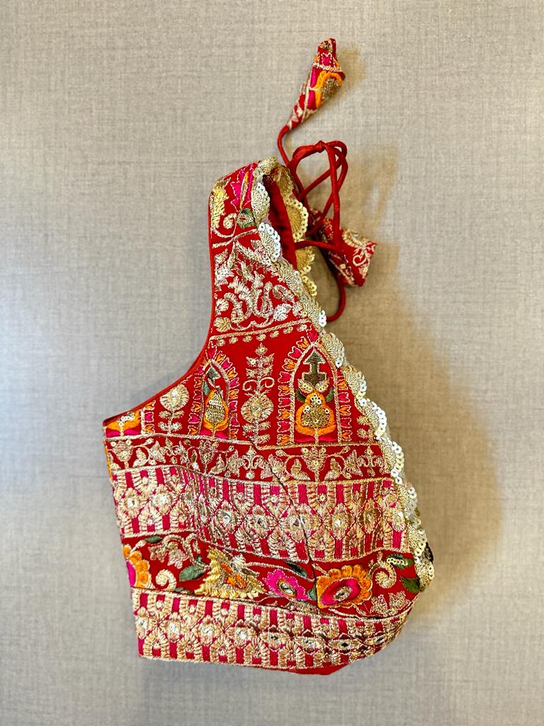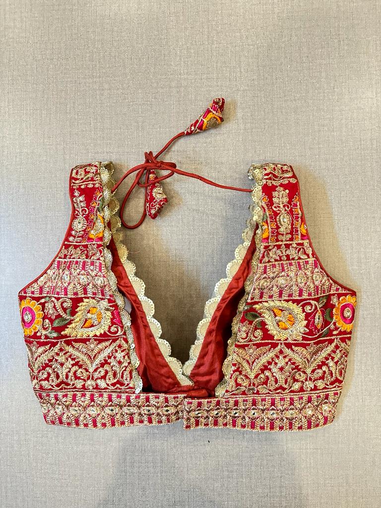Beautiful red heavy embroidery sleeveless blouse with scalloping lace. Buy designer blouse in USA from Pure Elegance.