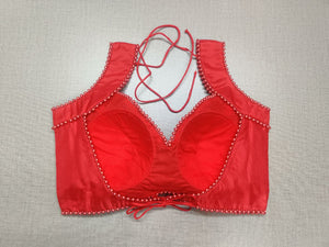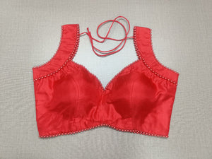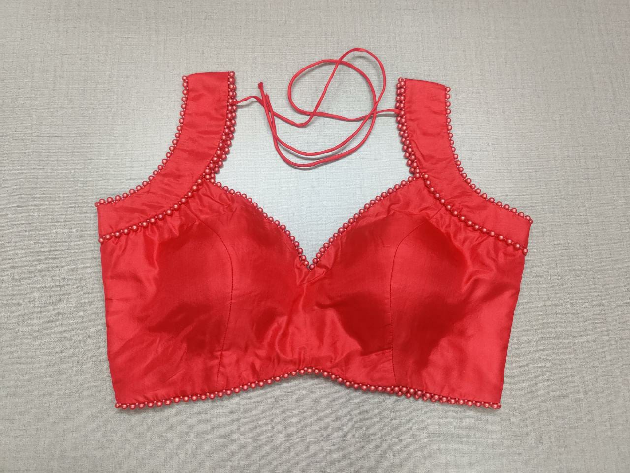 A Must-Have Classic V-Neckline sleeveless blouse in red Colour with a stylized Deep "U" back. It has a tie at the back for that perfect fitting. Complement your pick with a classy saree or an aesthetic lehenga. Shop designer sari blouse from Pure Elegance Indian fashion store in USA where each of these items are handmade by passionate creators & might slightly vary from one another.