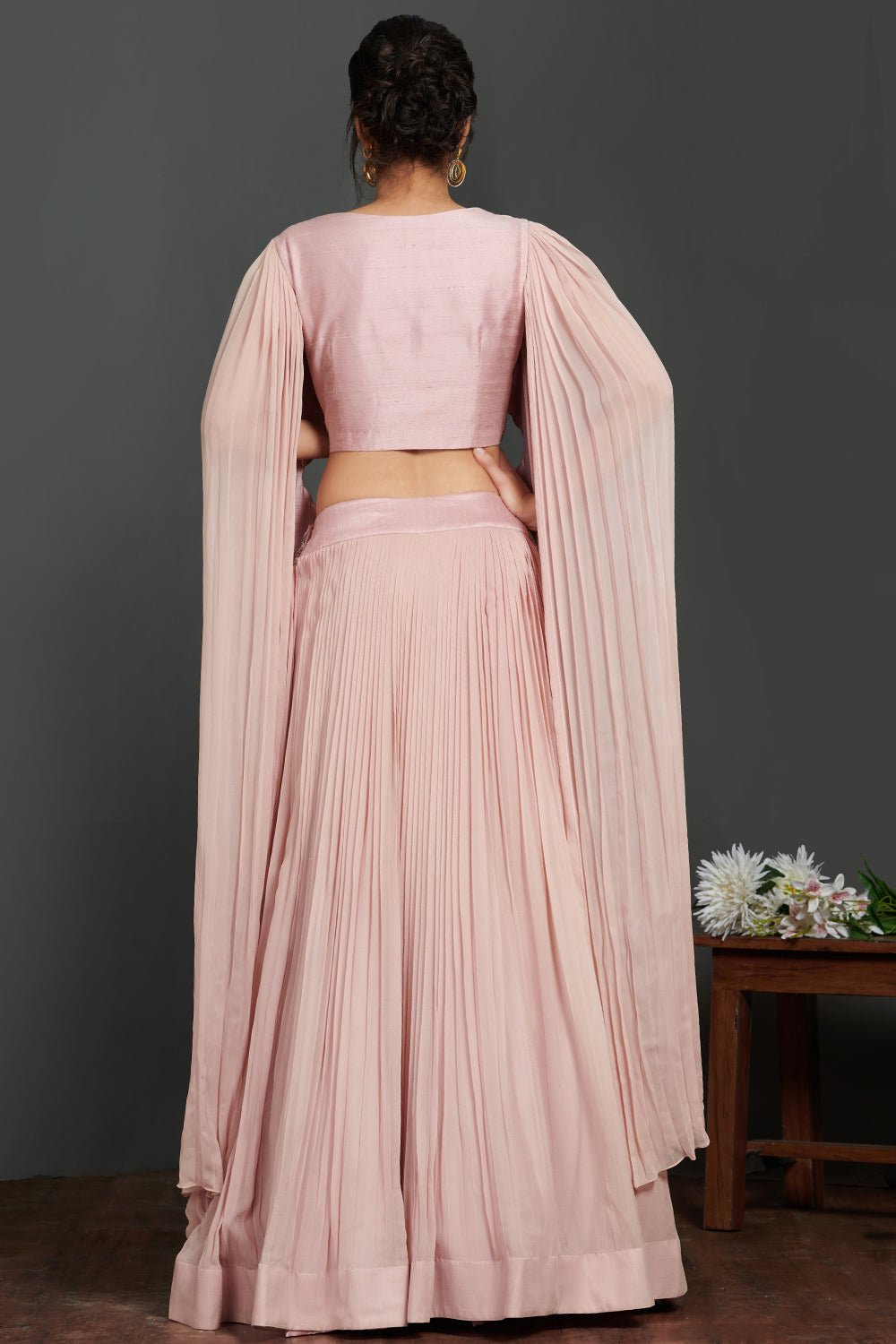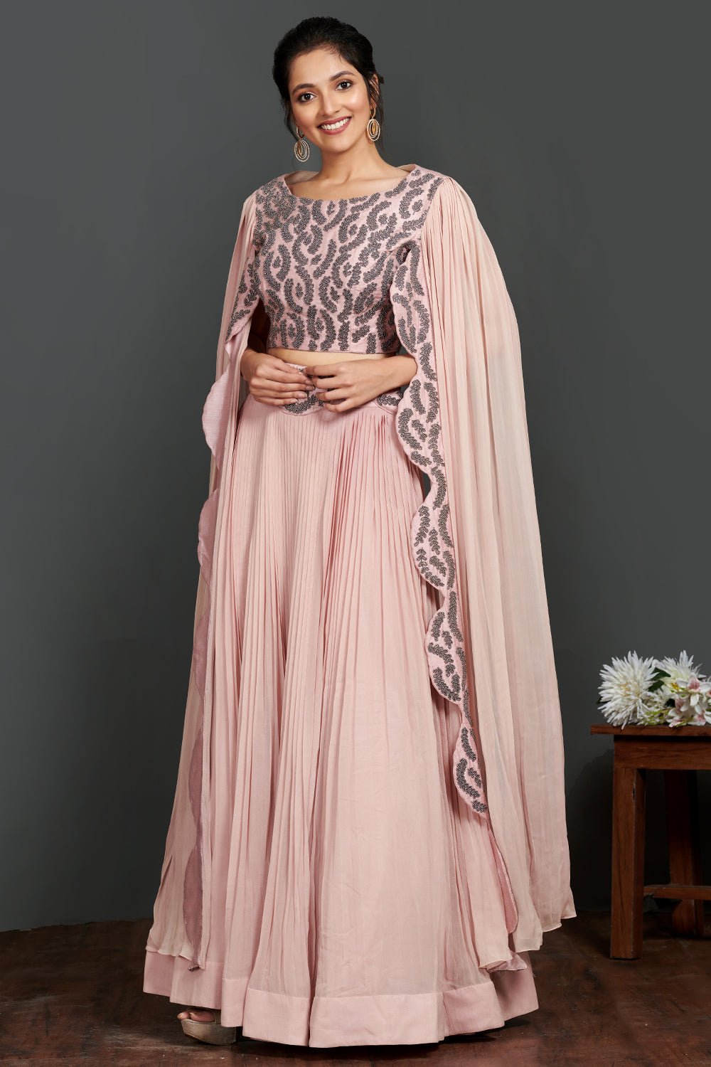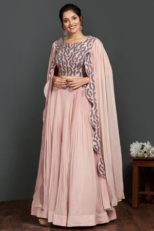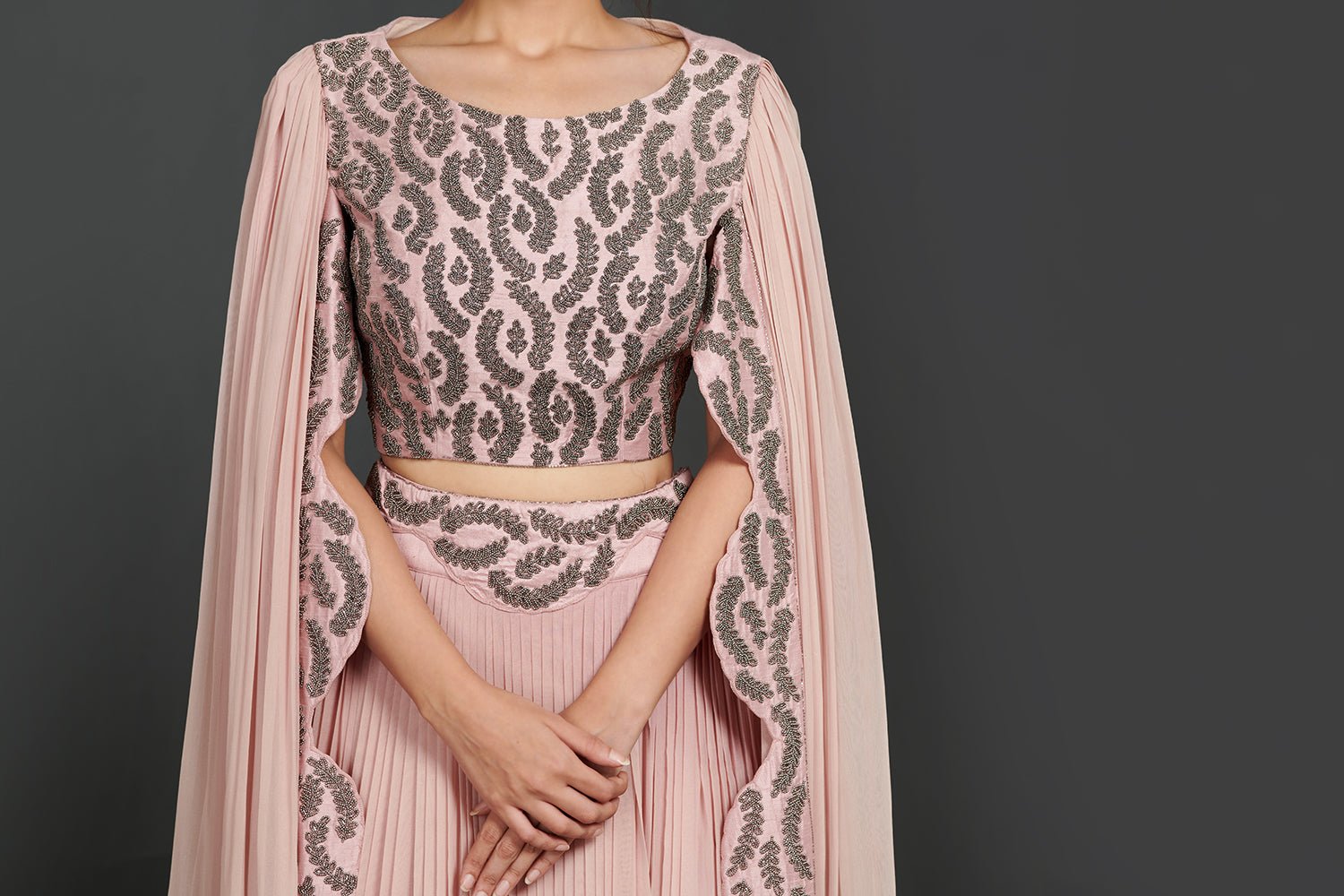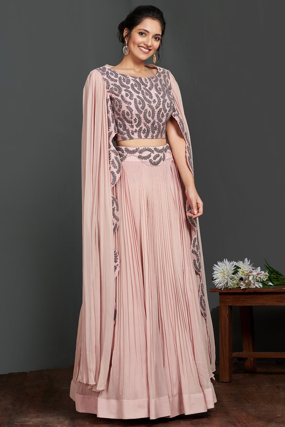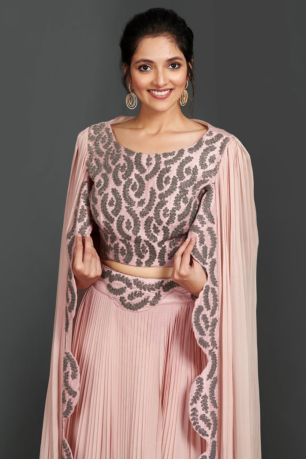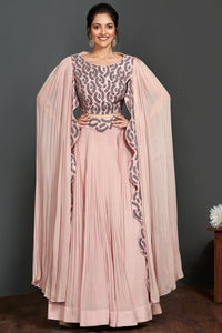 Go for this beautiful rose pink embroidered cape with georgette pants at weddings and sangeet. Shop beautiful dresses in USA from Pure Elegance.
