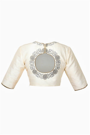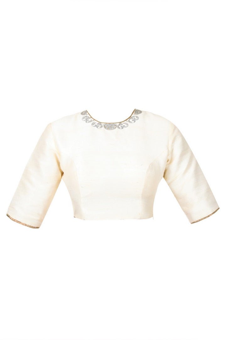 Go for an exquisite ethnic look in this designer sand beige saree blouse with hand embroidered jewel neckline and rust orange piping! Shop online at Pure Elegance or visit our store in USA!