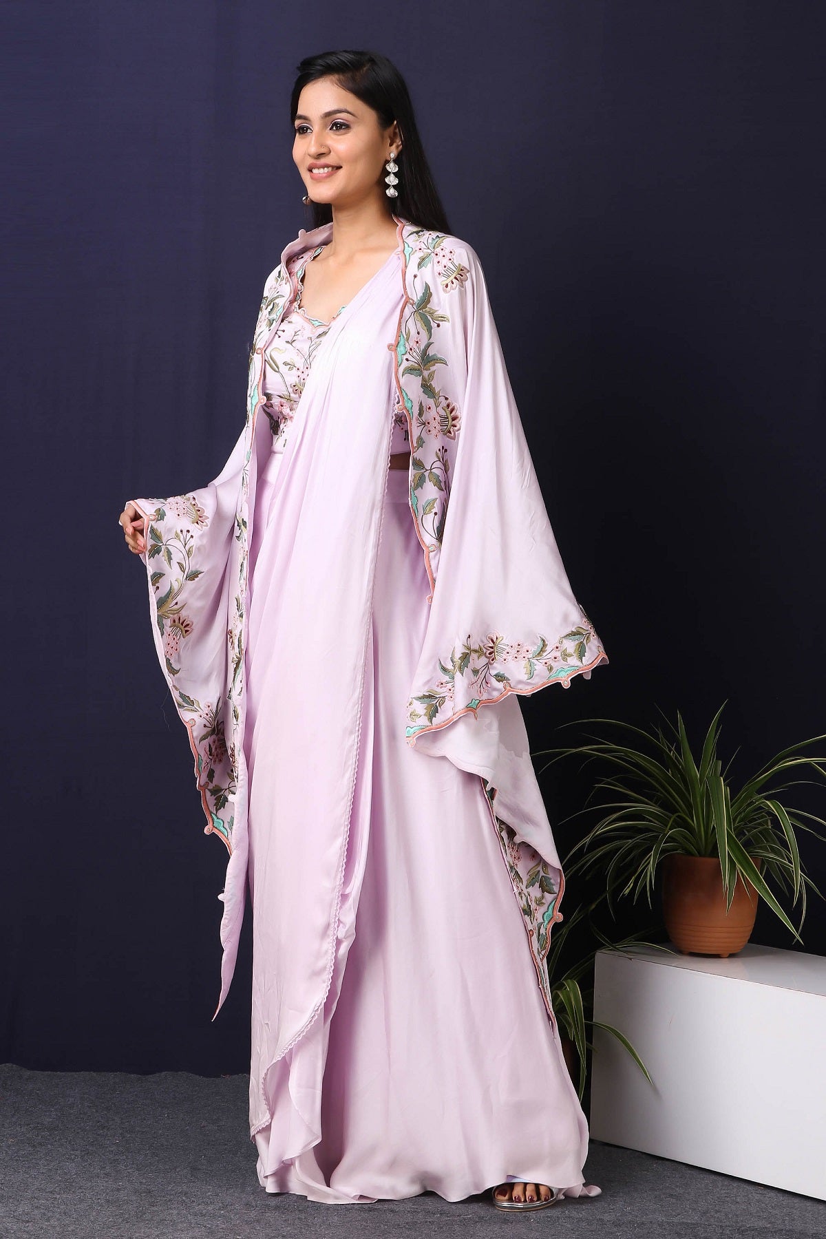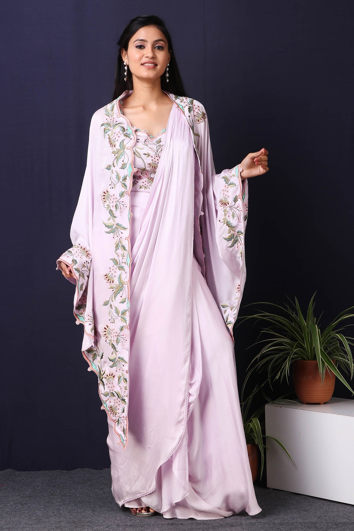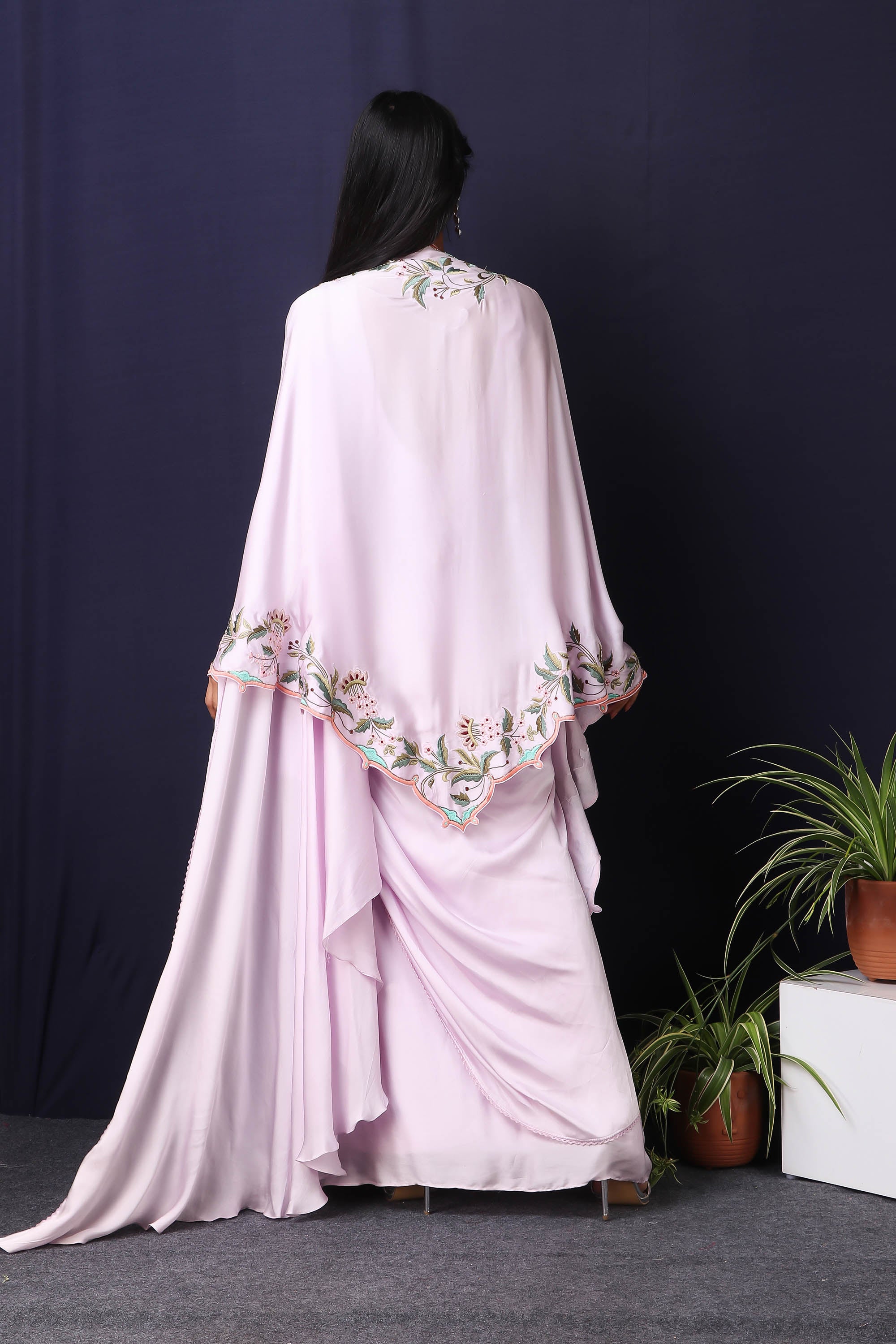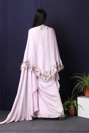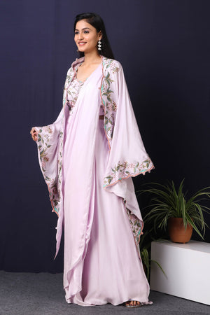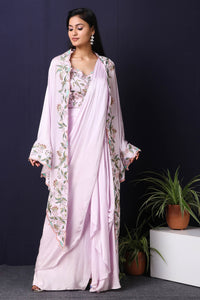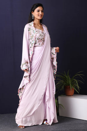Twirl in style and elegance this festive season with this alluring lilac satin and georgette drape saree from Pure Elegance featuring intricate multicolour thread embroidery work. Made with premium quality georgette and satin fabric. Pair it up with statement jewellery to complete your lookbook this season. Style this set with a pair of diamond earrings and solid pumps to finish the look from Pure Elegance.