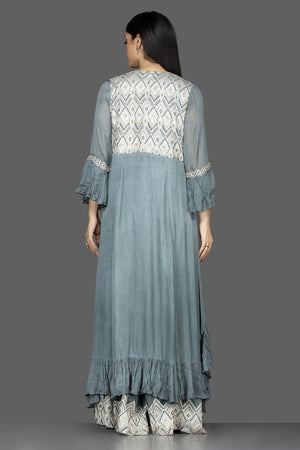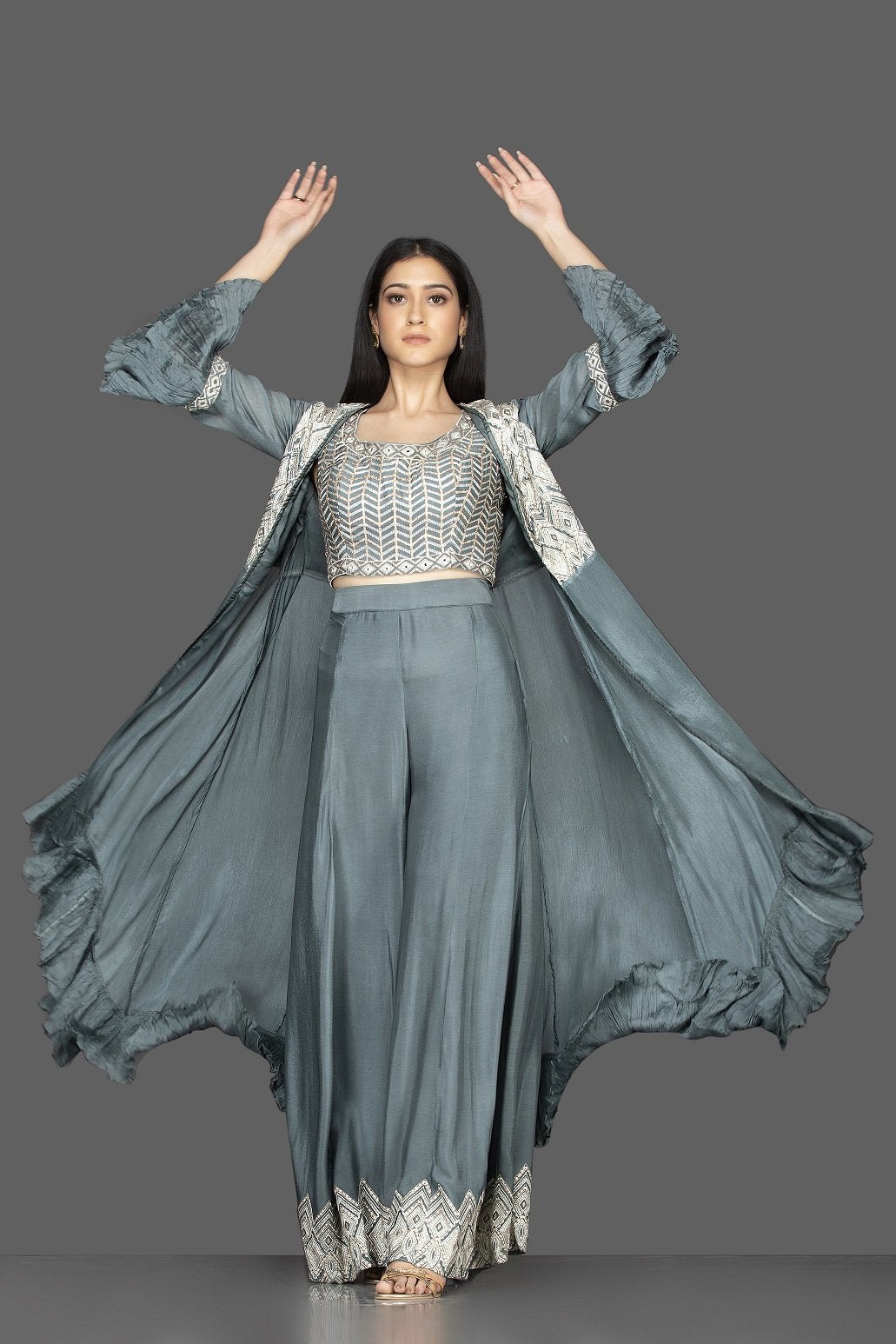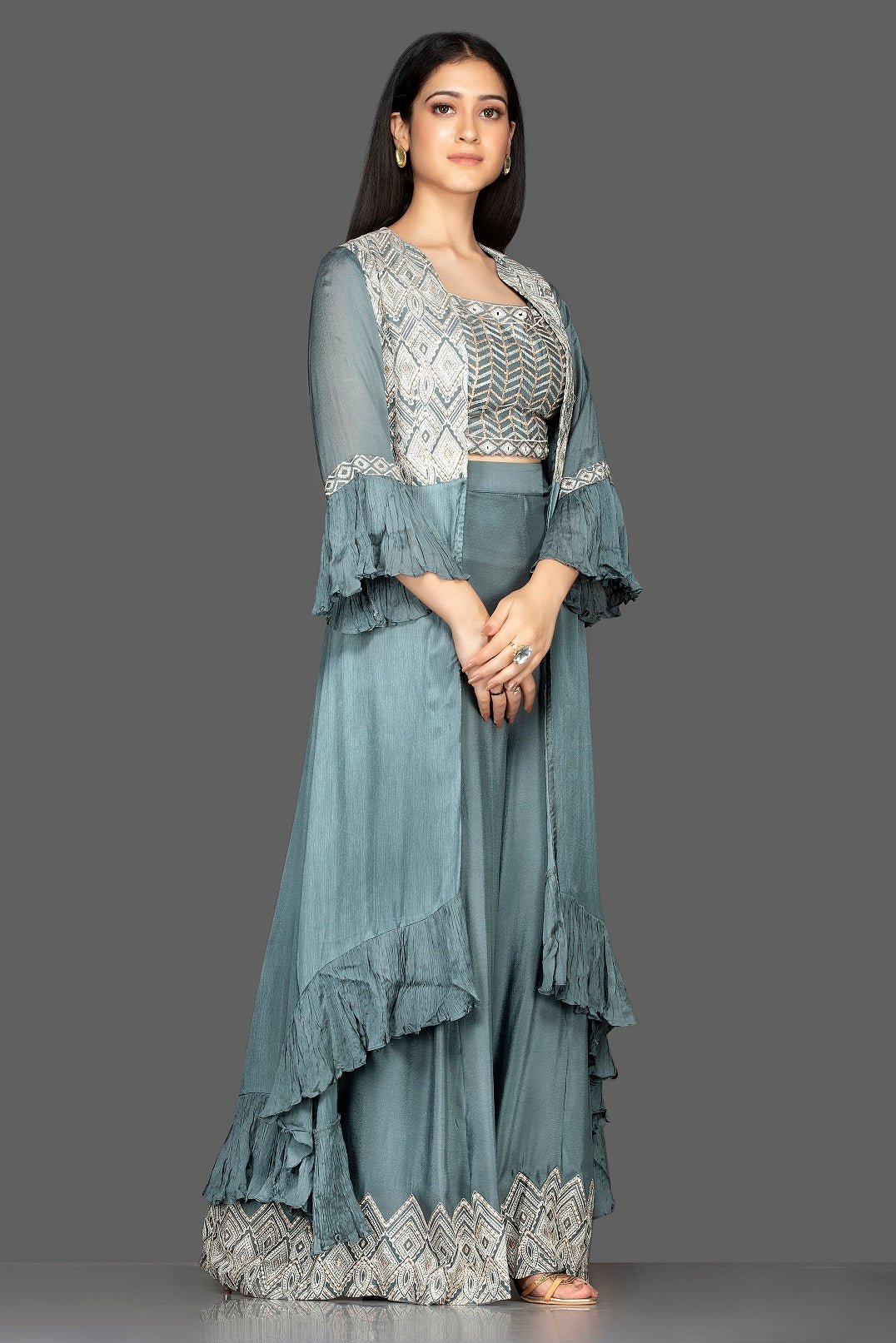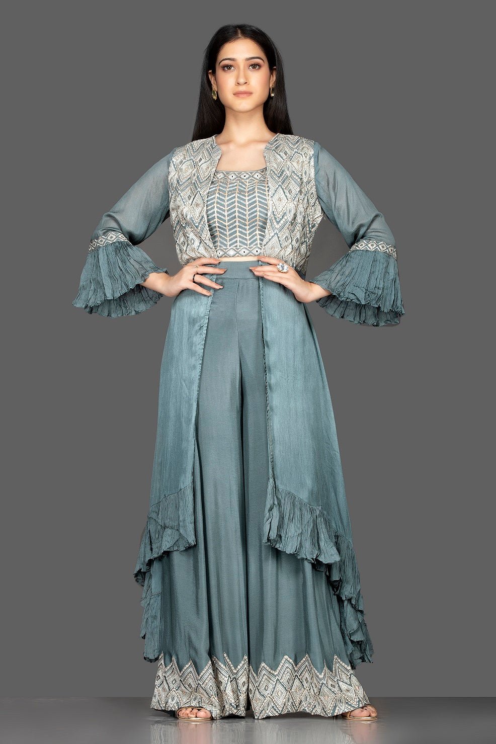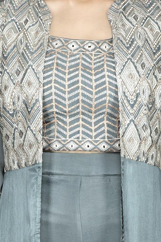 Look stylish in this Indowestern sea green embroidered crop top and palazzo on special occasions! The ensemble comes with a matching long shrug. Shop Indowestern dresses in USA from Pure Elegance.