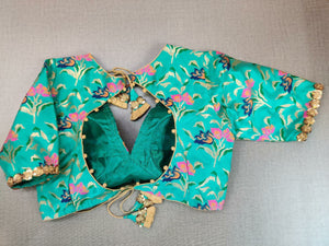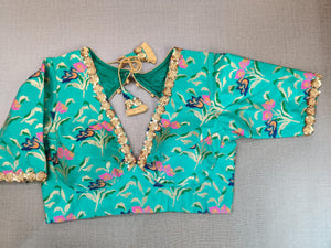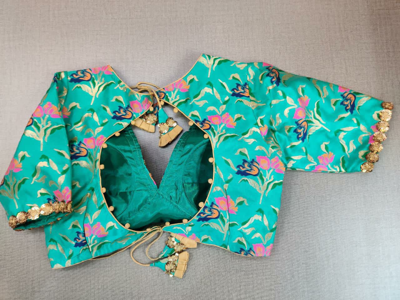 Glamorous sea green embroidered neckline Banarasi sari blouse. Buy designer blouse in USA from Pure Elegance.