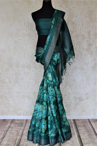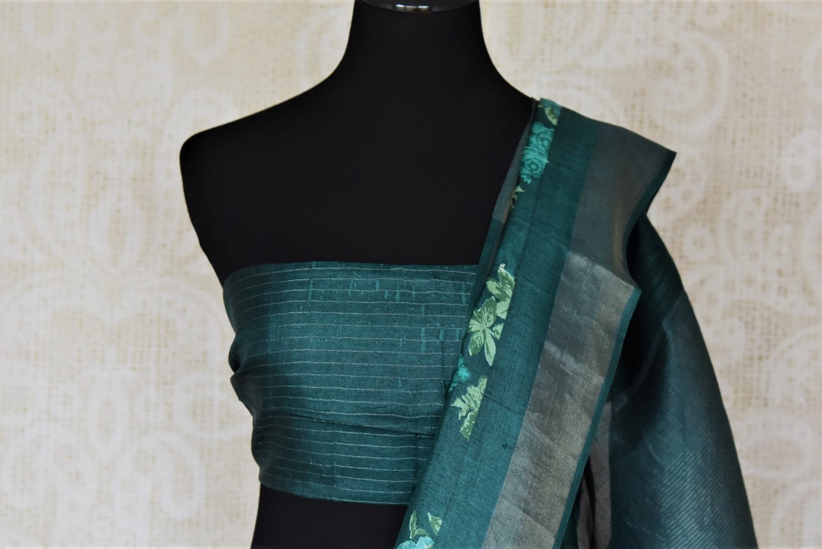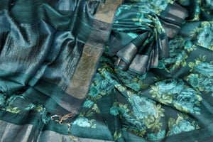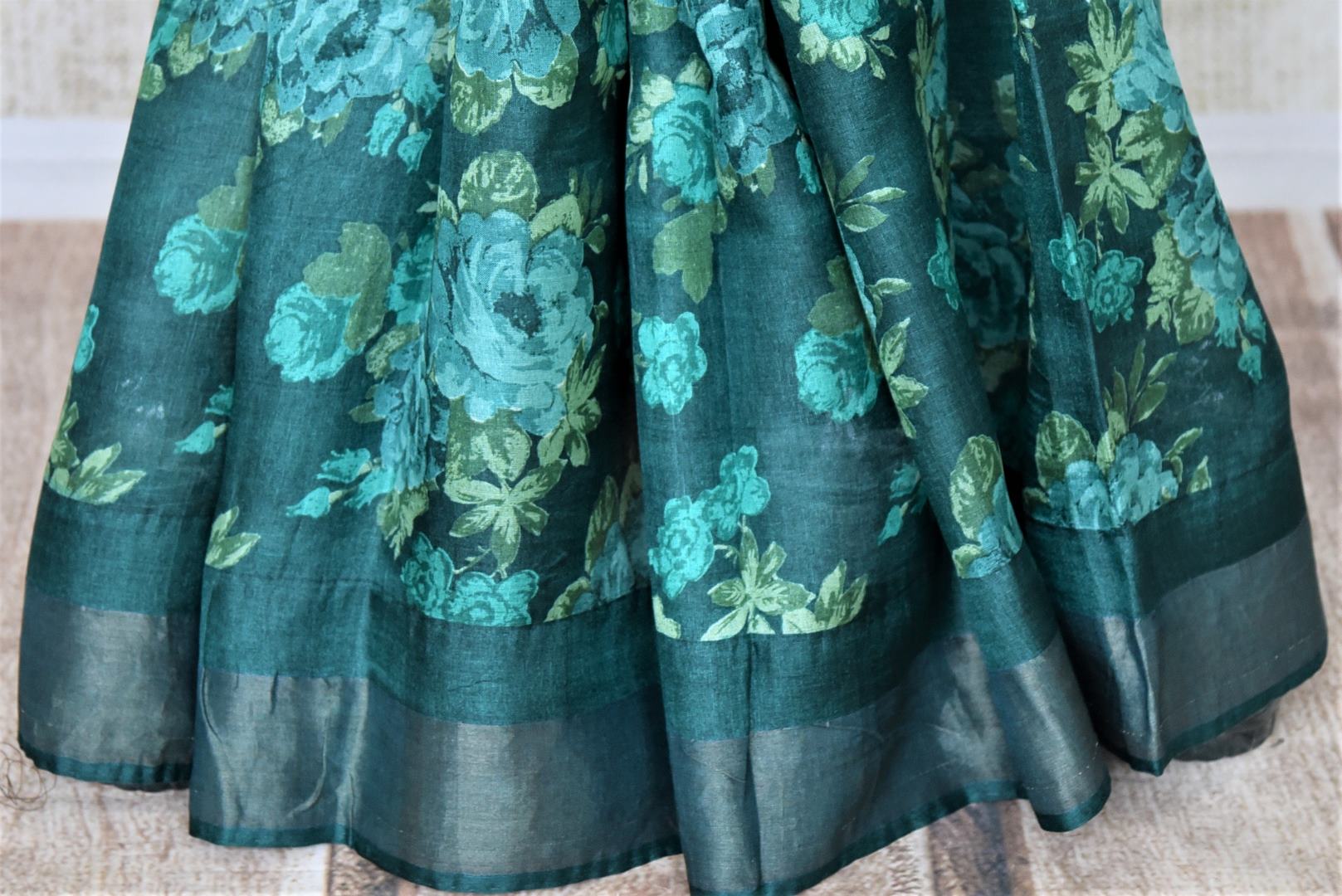 Elegant sea green floral tussar saree with light zari border. It comes with a matching blouse piece.