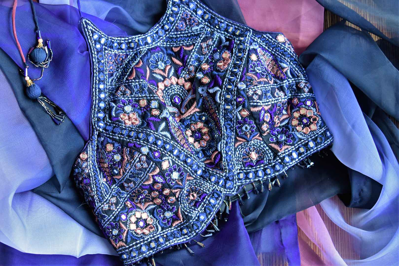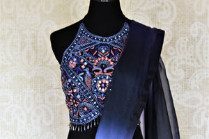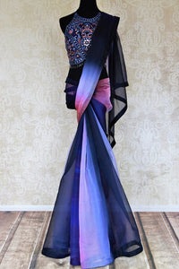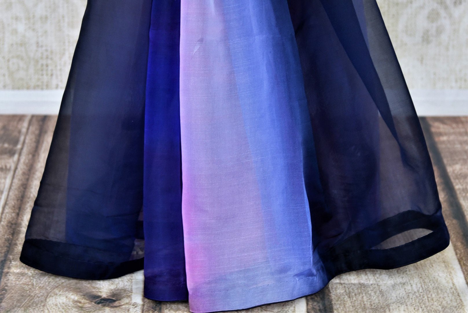 Dance the night away at parties in this festive shaded blue organza saree. The saree comes with a stunning embroidered saree blouse. Shop designer sarees in USA from Pure Elegance.