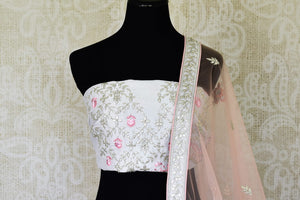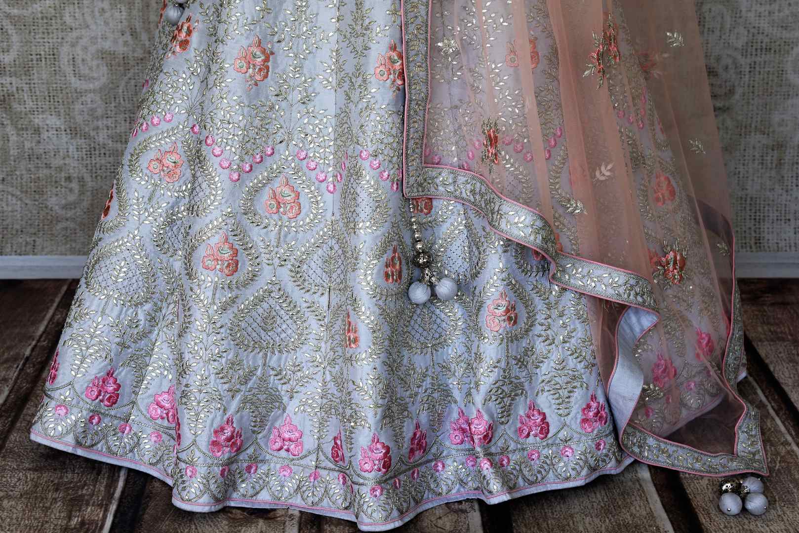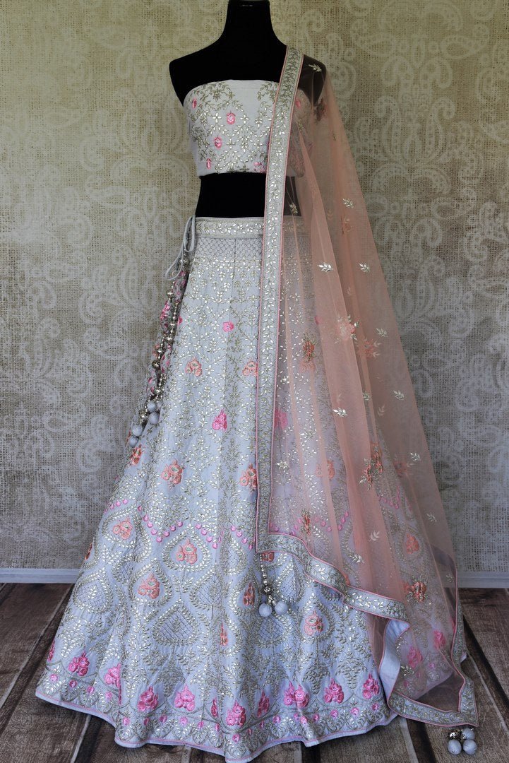 Shine in this gorgeous silver grey gota patti work silk lehenga with dupatta on weddings and special occasions! It comes with an unstitched blouse piece. Shop online from Pure Elegance store in USA.