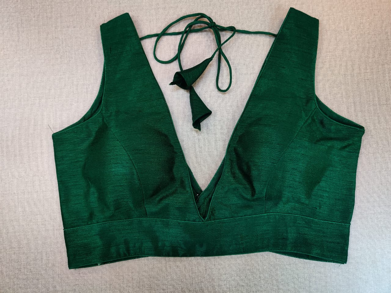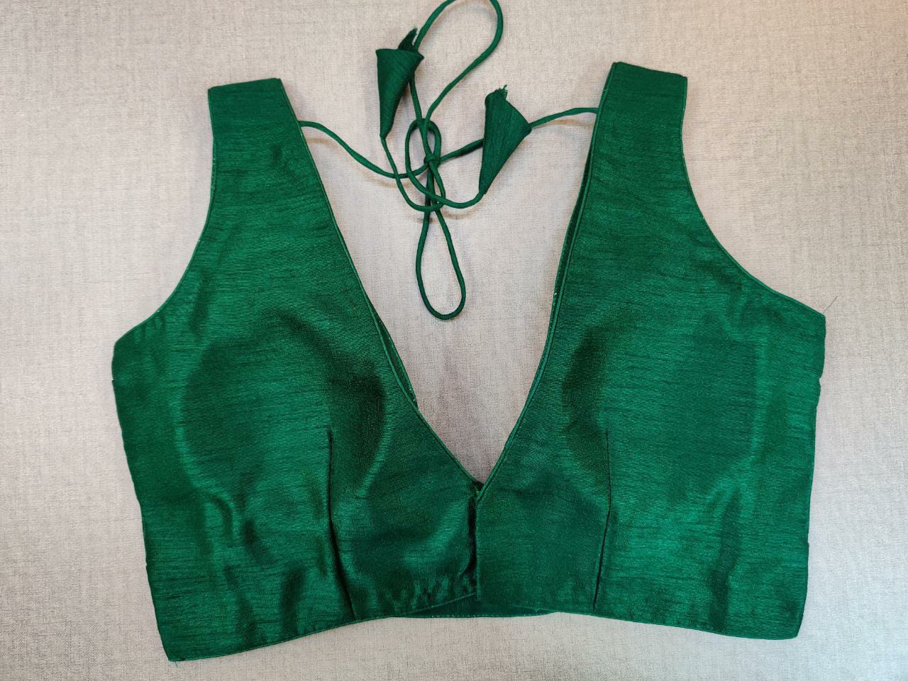 Beautiful solid green sleeveless saree blouse with V-neckline. Buy designer blouse in USA from Pure Elegance.