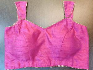Solid pink sleeveless sari blouse with golden beads lace. Buy online from Pure Elegance