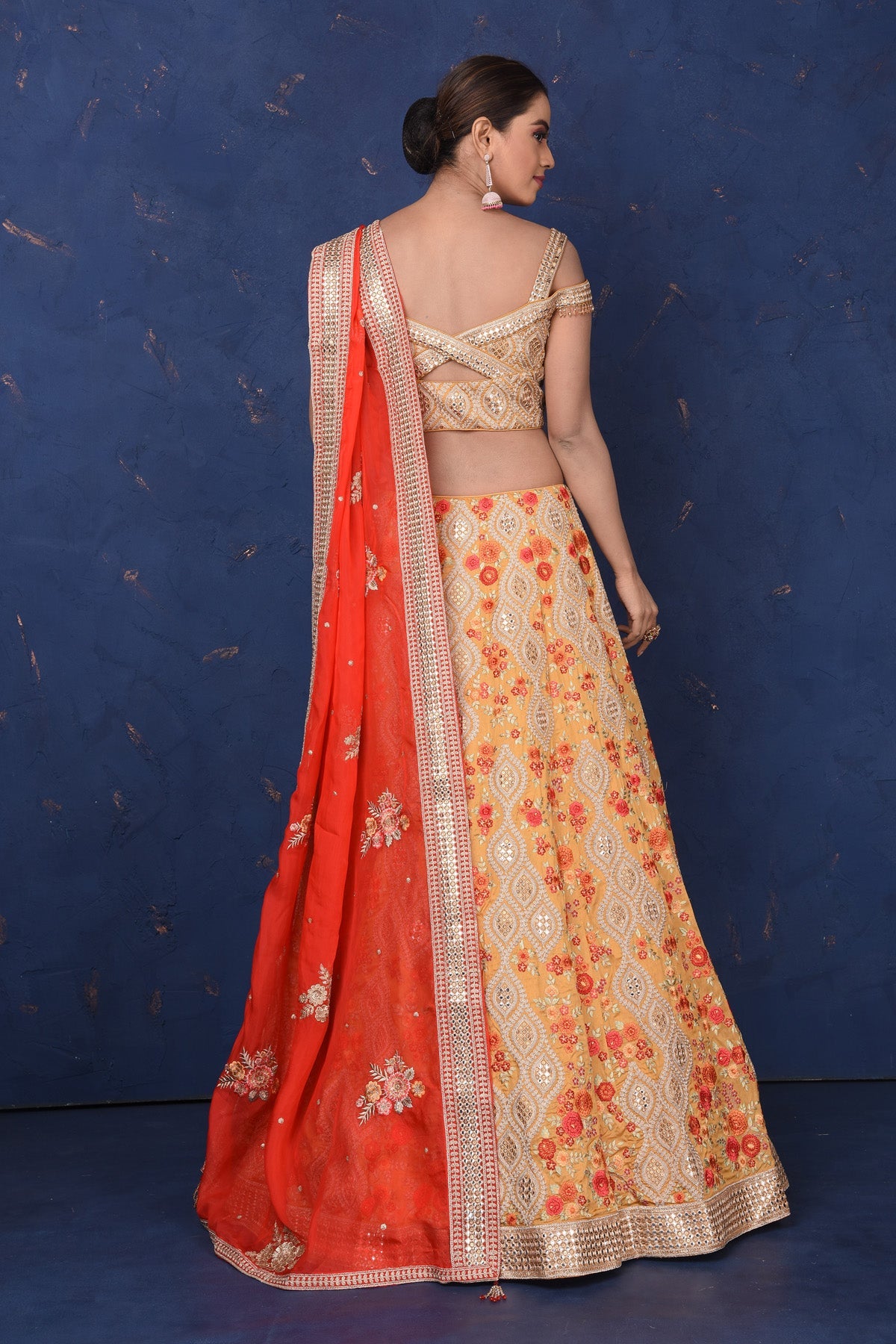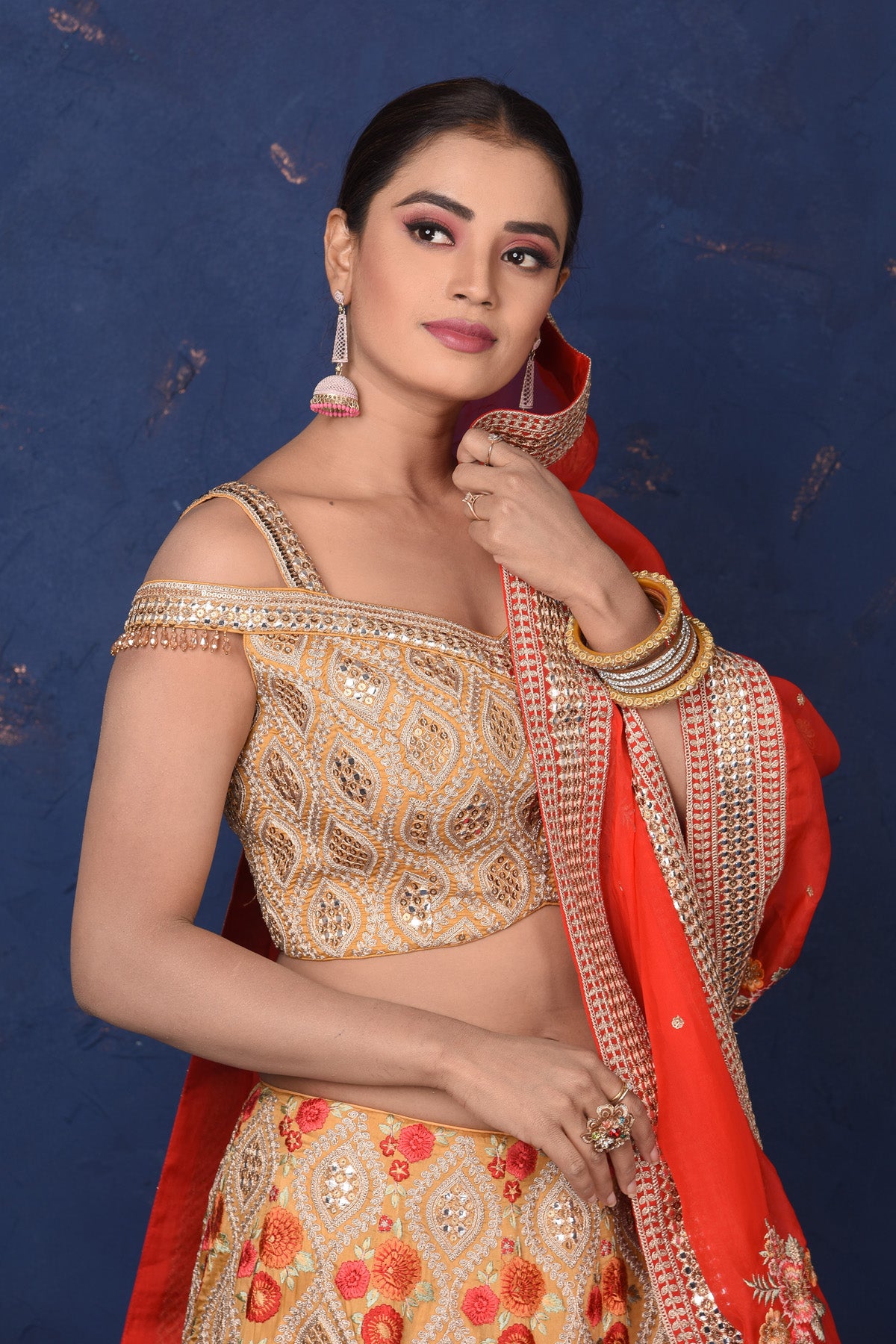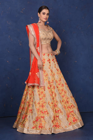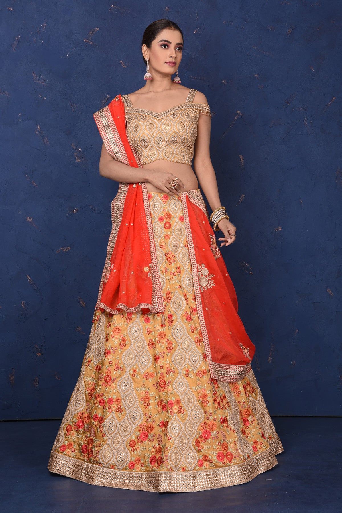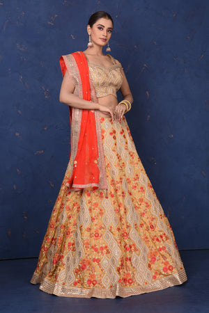 Turn heads at weddings in this beautiful beige designer lehenga with floral embroidery. It comes with an orange dupatta. Shop designer suits and dresses in USA from Pure Elegance.