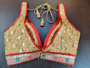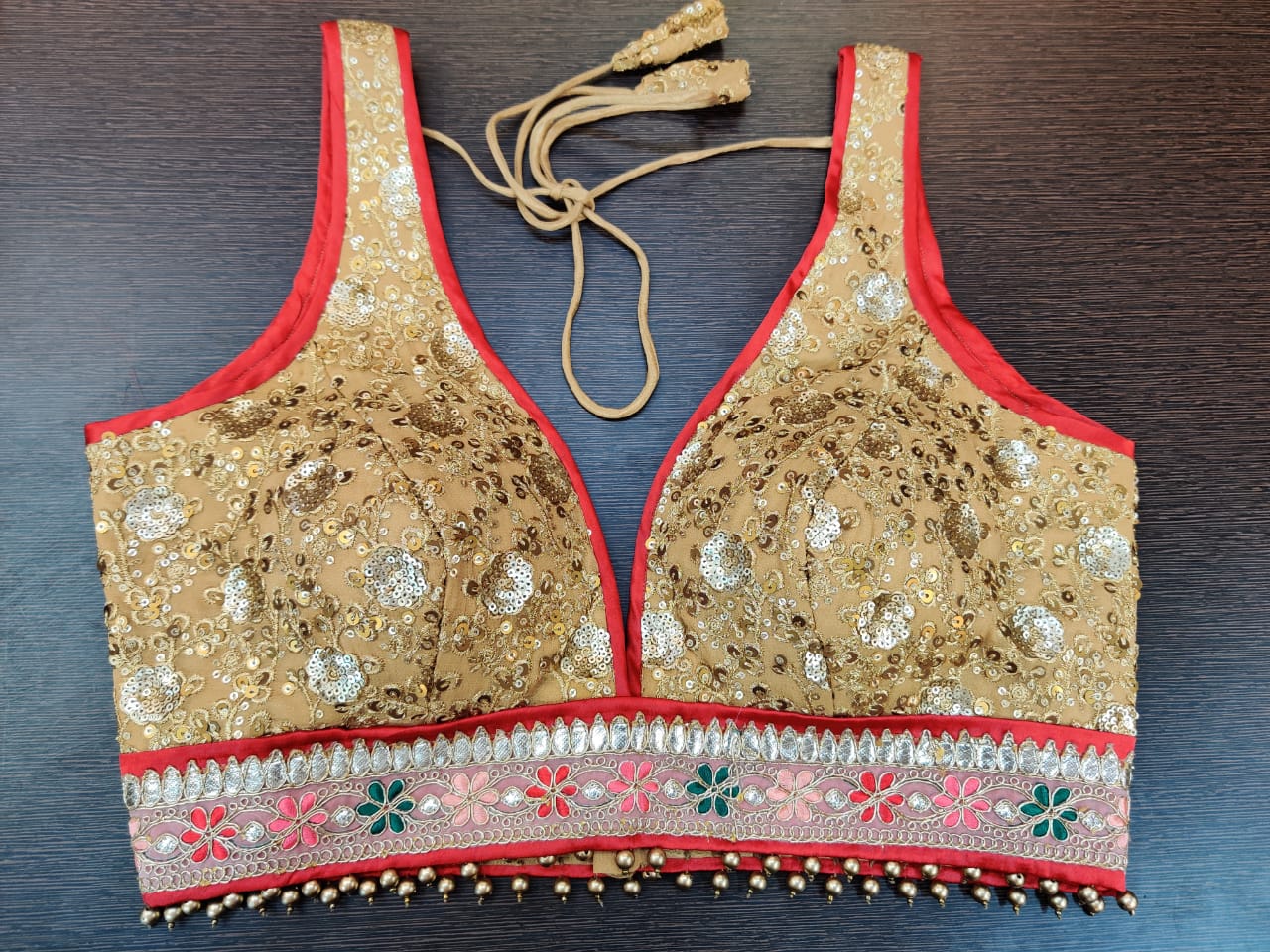 Stunning beige embroidered sleeveless saree blouse. Buy designer blouse in USA from Pure Elegance.