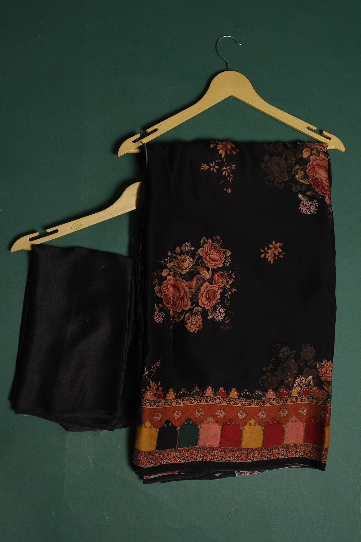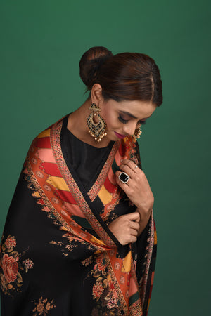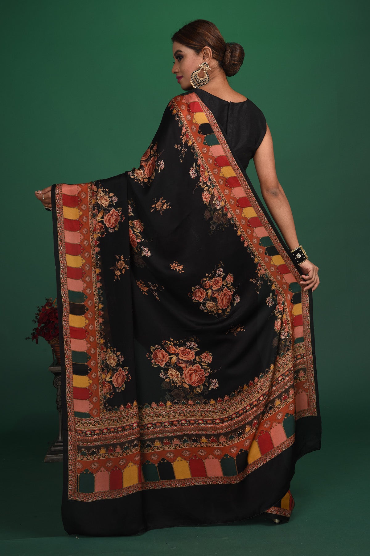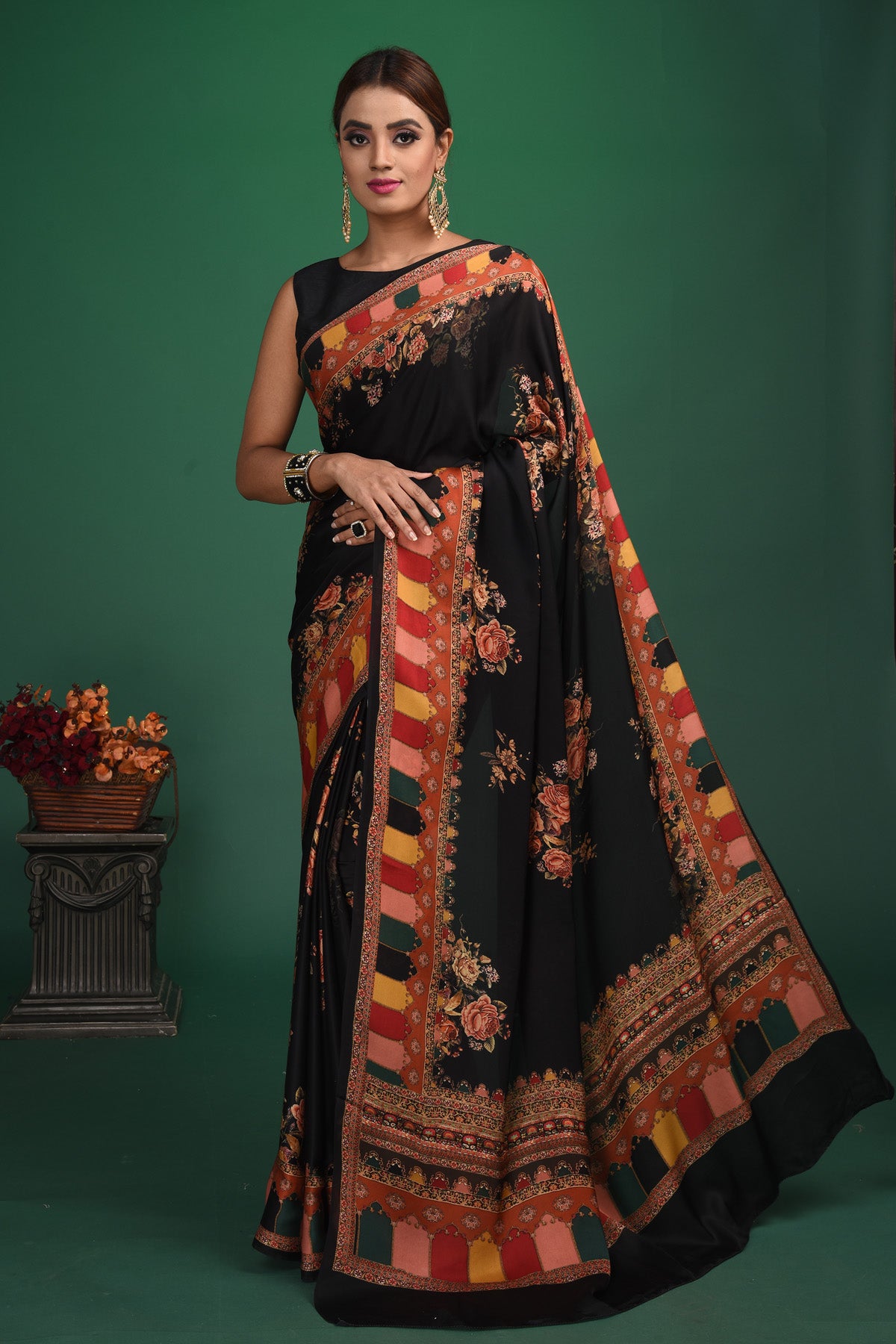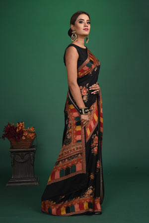 Be a vision of style and elegance at parties in this stunning black floral printed crepe satin saree. It comes with a matching blouse piece. Shop designer sarees online in USA from Pure Elegance.