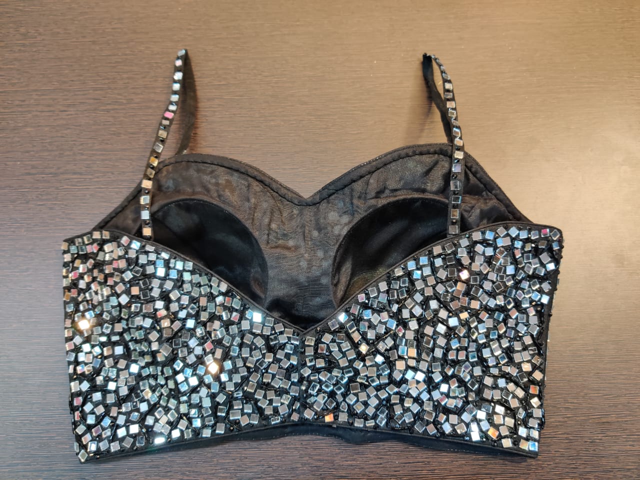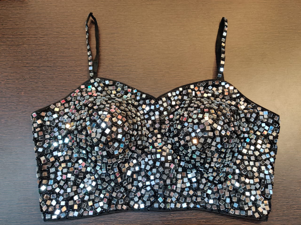 Stunning black mirror work strappy saree blouse. Shop designer saree blouse online in USA from Pure Elegance.