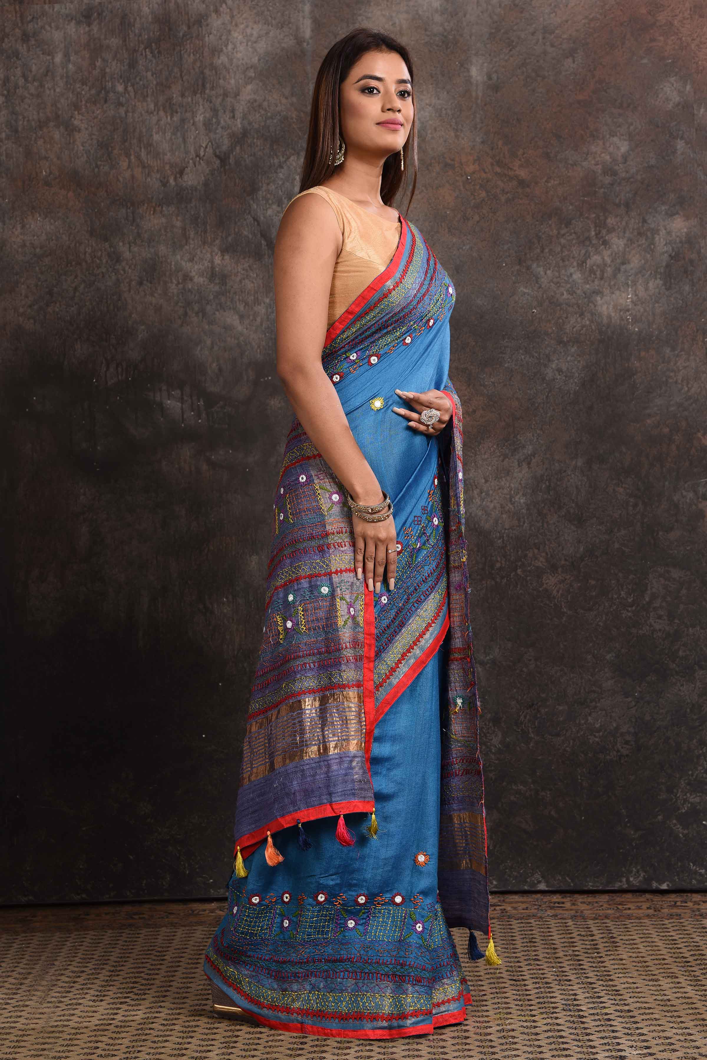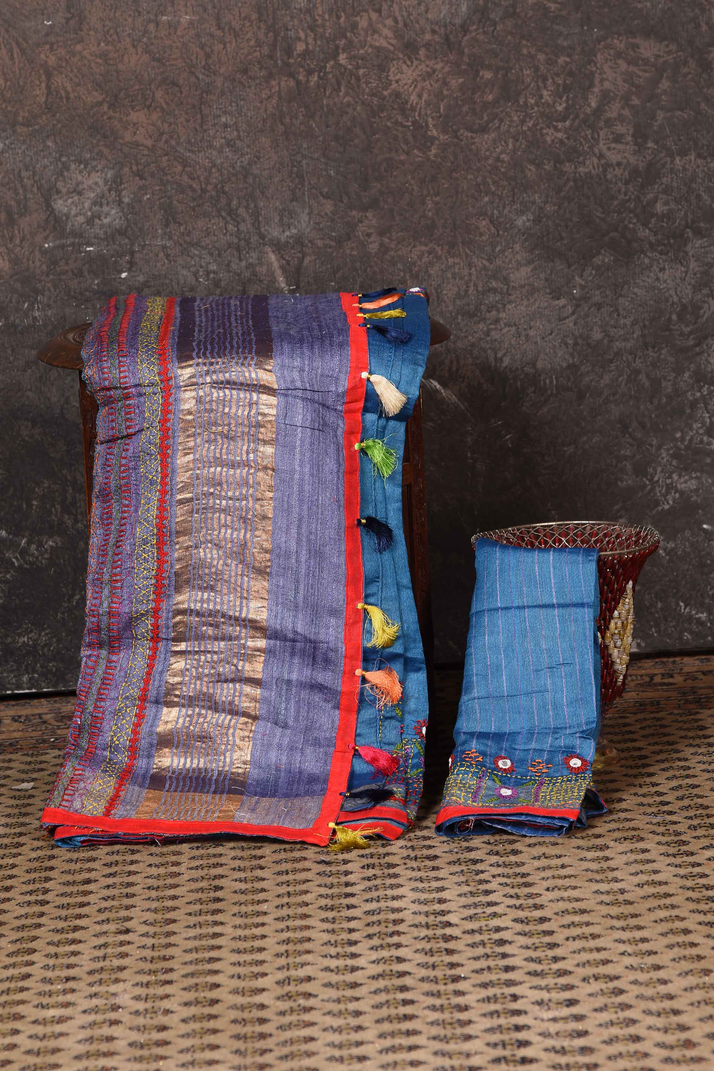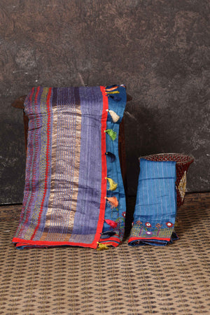 Beautiful blue Gicha tussar Lambani saree is a perfect drape for festive occasions. It comes with a matching blouse piece.